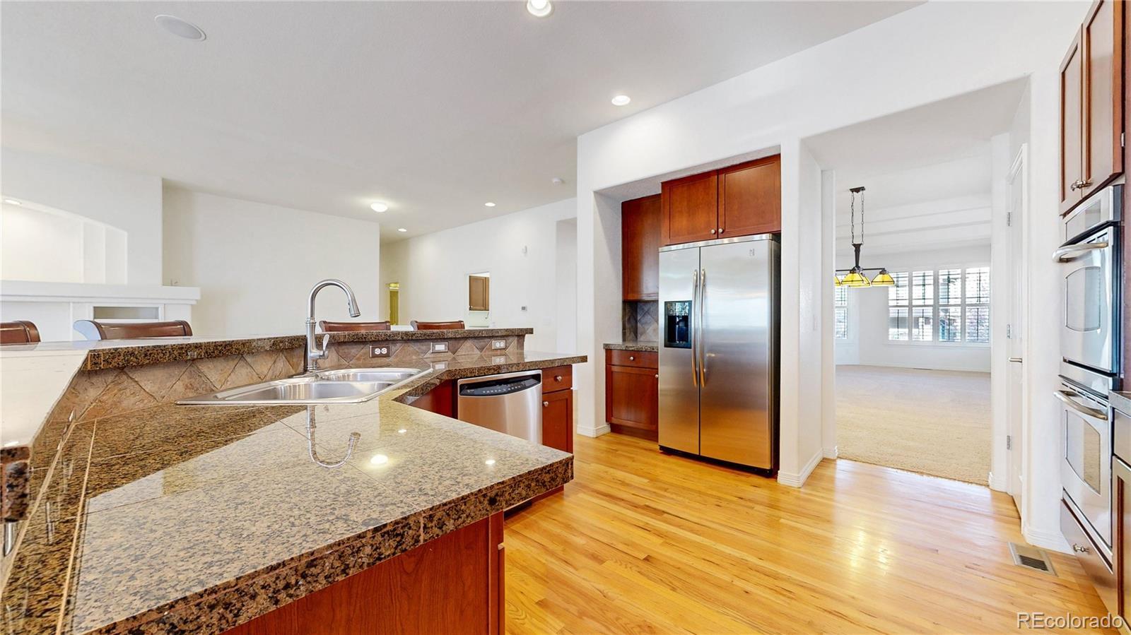 Not all homes are created equally! Welcome to this rare single-story ranch home in Reunion offering bright and sun filled main-level living with 3 bedrooms, a dedicated office that can serve as a 4th bedroom, and 2.5 bathrooms, all on one level, featuring plantation shutters throughout and a spacious, open layout with multiple living areas. The well-appointed kitchen includes cherry cabinets, granite countertops, GE Profile stainless steel appliances, double ovens, a large eat-at island, vaulted ceilings, and abundant cabinet and counter space, with both an eat-in kitchen and formal dining room. The large family room features a gas fireplace and surround sound, while the private primary suite overlooks the backyard and includes a walk-in closet and a 5-piece en-suite bathroom with jetted soaking tub. A huge full basement is mostly finished and presents an easy equity opportunity, with plumbing, electrical, walls, and doors already in place for two additional bedrooms, a full bathroom, media or theater room, expansive rec room, storage room or workshop, and ample storage, needing only flooring and bathroom counters to complete. Situated on a nearly 1/3-acre lot with a serene setting, this home has tons of yard space, a wrap-around front porch, hot tub in the low maintenance back yard and tons of privacy with one of the larger corner lots in the area. Just one block from a park and convenient access to lakes, trails, recreation center, pool, schools, shopping, dining, entertainment, and shopping, and includes an oversized 3-car garage and whole-house alarm system. For more photos, video, and virtual tour please visit: https://www.v6d.com/1s7