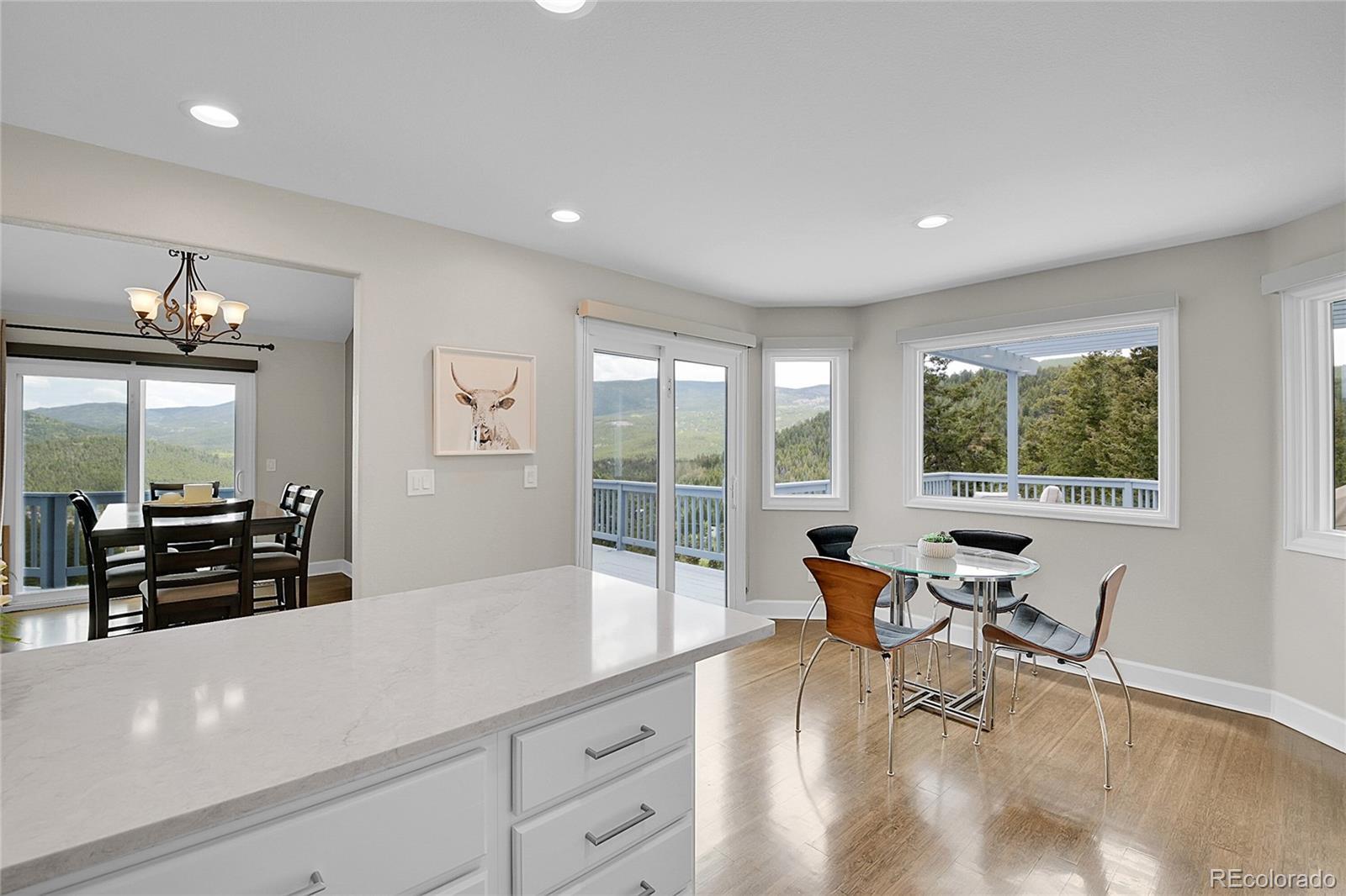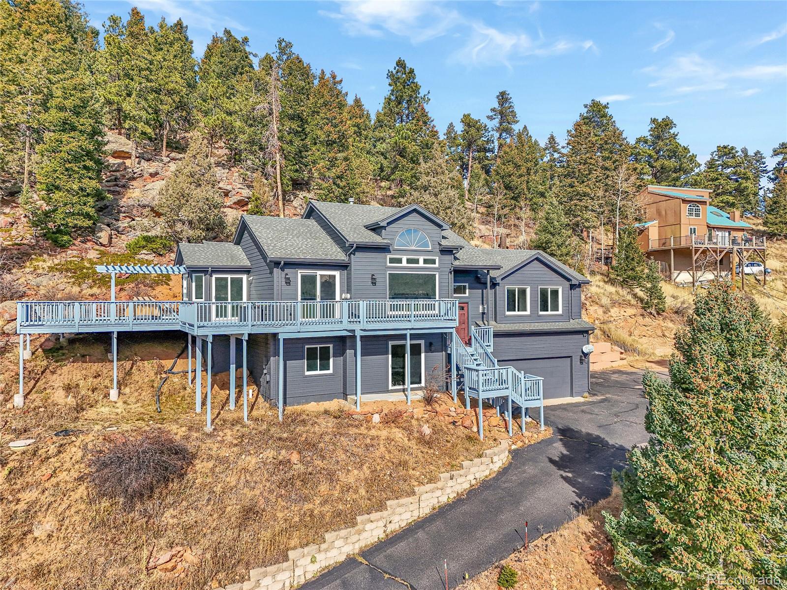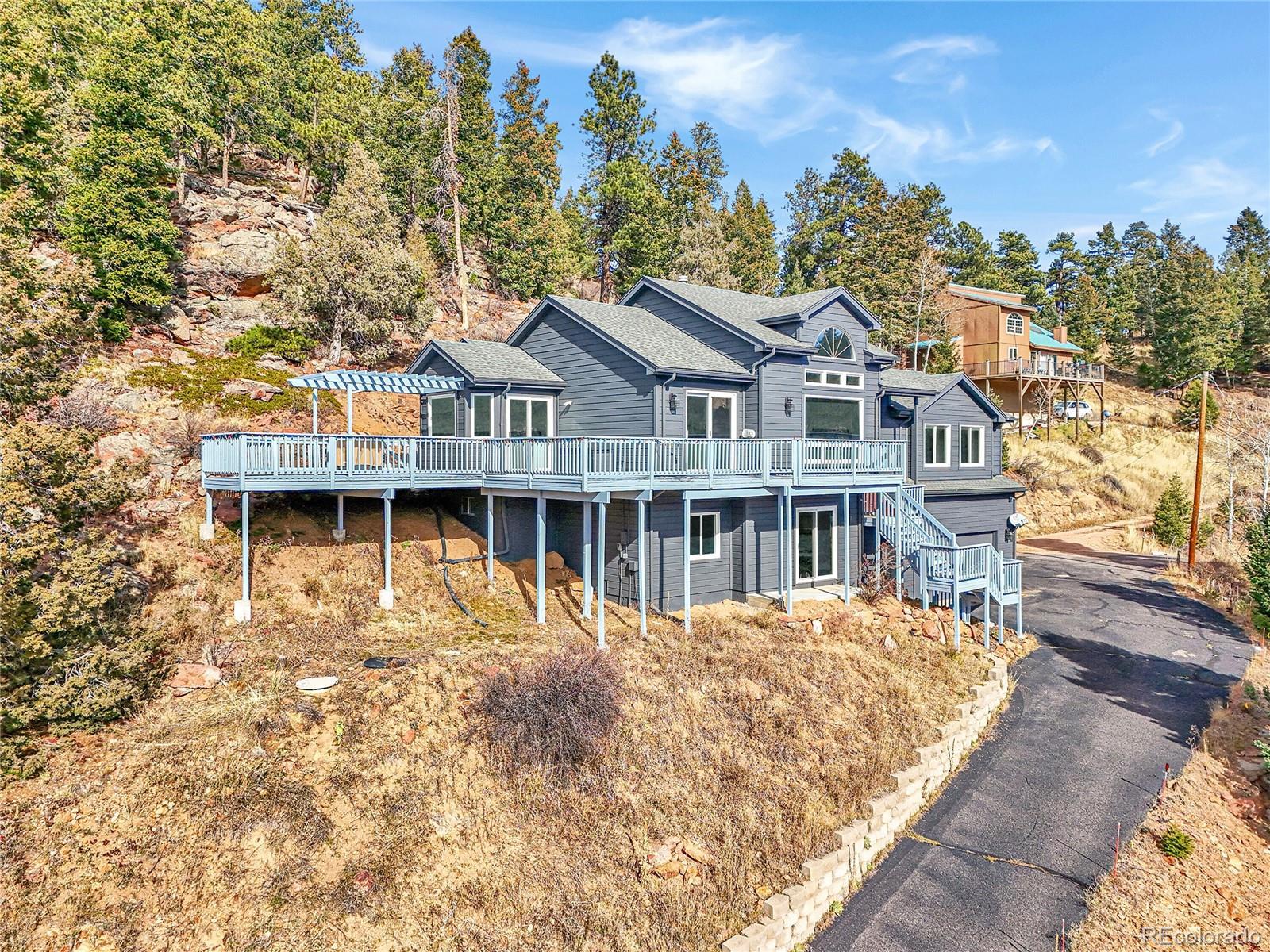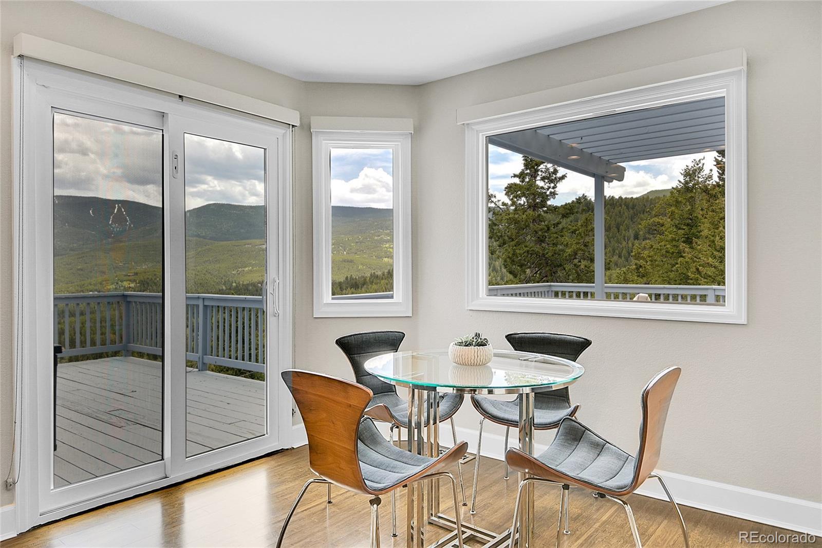 Seller is offering at 15,000 concession in addition to this price improvement! Explore this beautiful Evergreen home via video & 3D tour at www.33633ElkRun.com. (Note that the home is now painted gray!) Mountain views from every window, a spacious deck & modern upgrades make this your perfect Colorado escape. This move-in ready home is perfect for nature lovers and remote workers, as it blends privacy and beauty with modern comfort. Inside, you'll find bright, open main-level living with beautiful bamboo flooring & a large view window to take in the sweeping scenery. The main level also offers an oversized primary suite w/ fireplace & luxurious spa-inspired bathroom with steam shower & walk-in closet. The newly updated modern kitchen features quartz countertops, brand-new appliances, large pantry closet, breakfast nook & bar seating. Step out onto the expansive deck, where there's ample space for lounging, dining, & soaking in the beauty of outdoor living. A second ensuite bedroom w/ walk-in closet & double doors can serve beautifully as a home office. Downstairs, the bright walk-out lower level features a media/family room with exterior access, & a flex space/3rd bedroom with generous closet. A bathroom & large utility/storage room complete this level. The paved driveway has southern exposure that melts snow quickly & parking is abundant with an oversized 2 car garage & parking spaces outside. The home is exquisitely cared for and move-in ready with new furnace, newer high efficiency windows, high-end window shades throughout, new appliances, and more. High speed internet means working at home is effortless, & there are county maintained paved roads all the way to Golden (35 min) & metro Denver for easy commuting in both summer & winter. This is Colorado living at its best with miles of trails at Maxwell Falls & National Forest, all just 6 min away, only 13 min to amenities in Evergreen, & a little over an hour to DIA. Welcome to your mountain oasis!