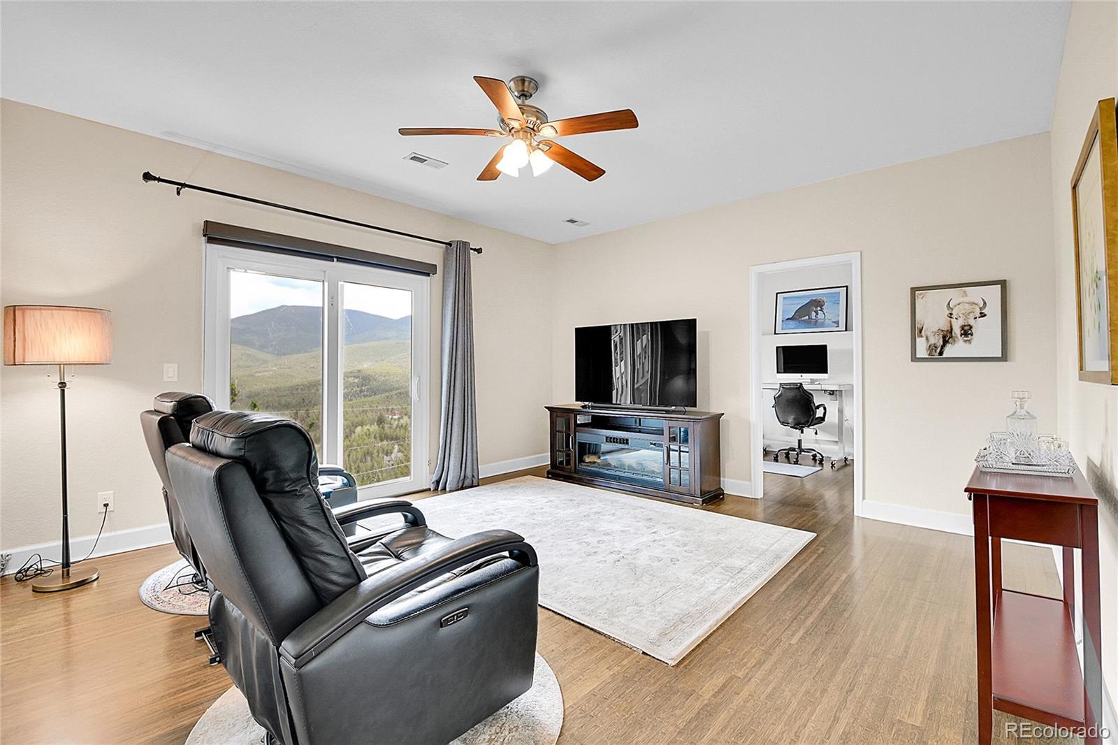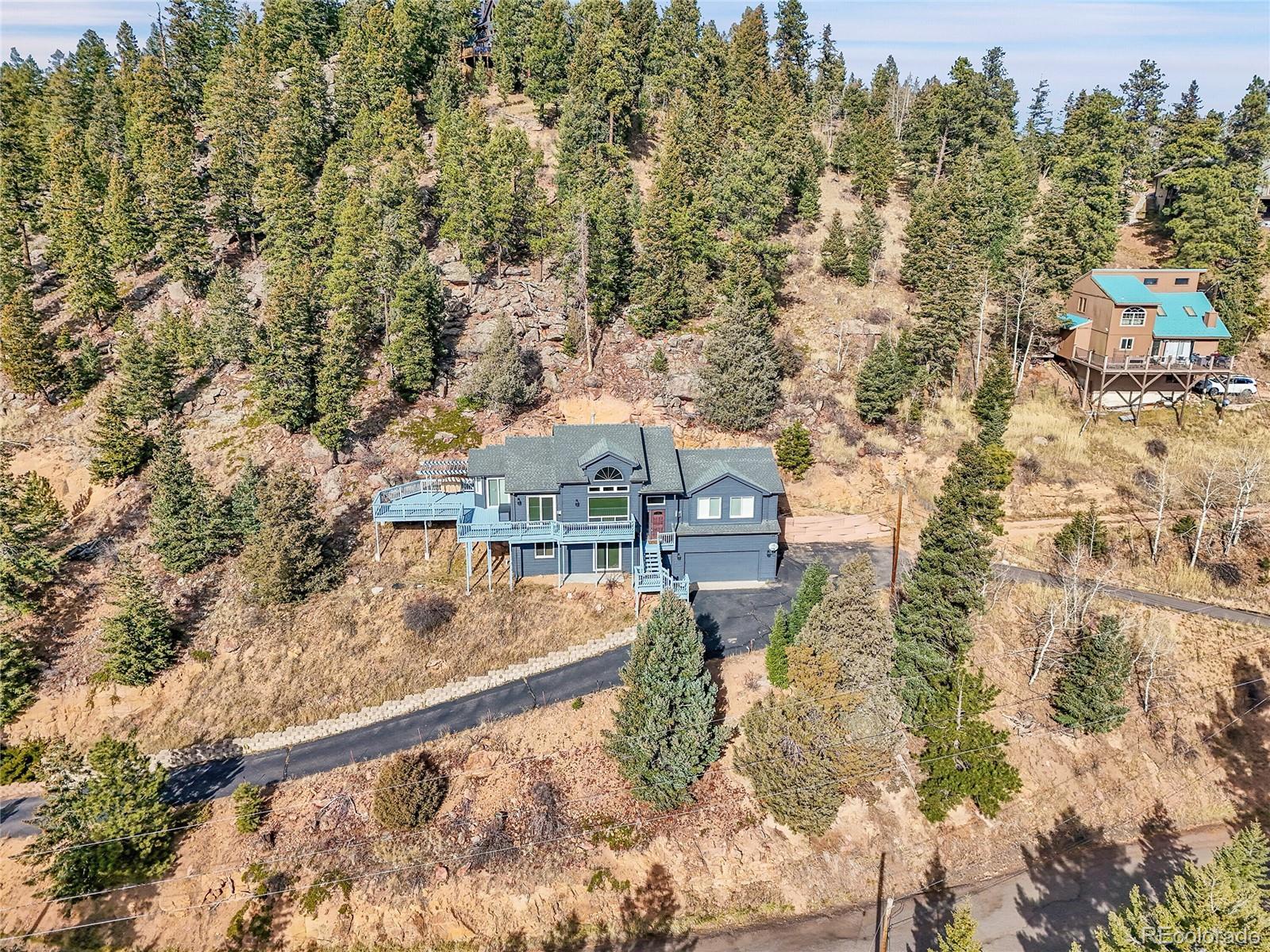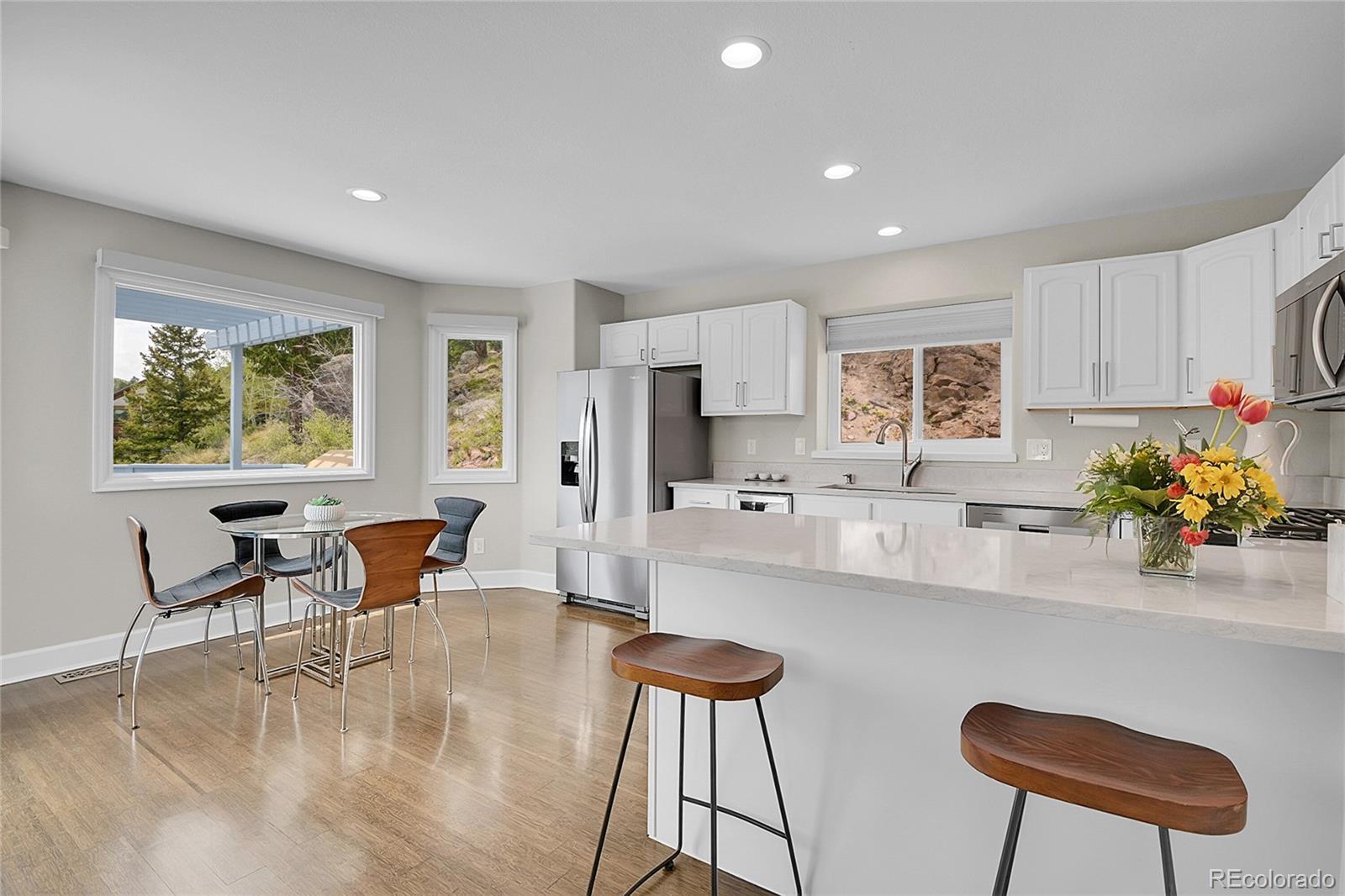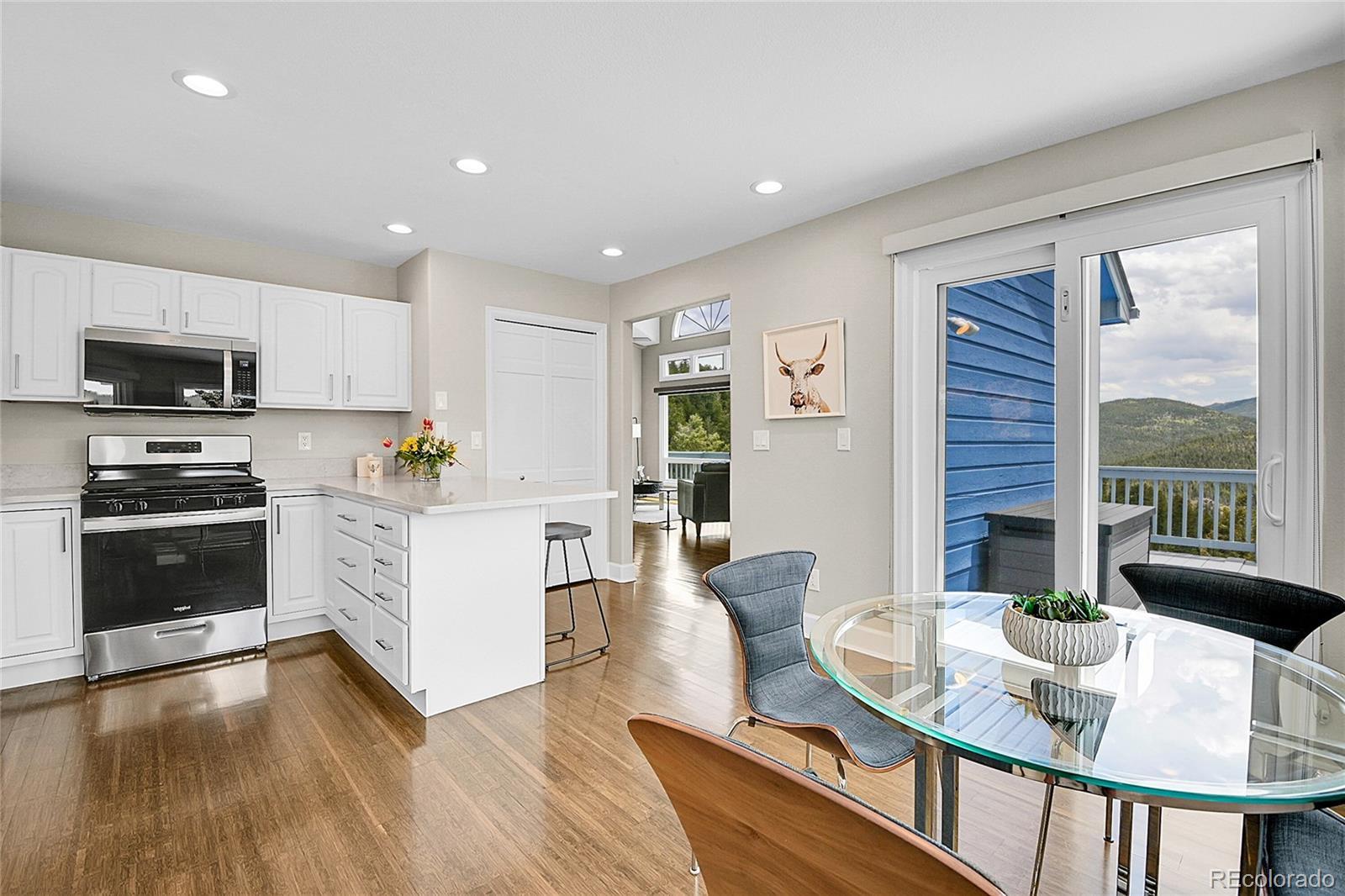 Seller is offering at 15,000 concession in addition to this price improvement! Explore this beautiful Evergreen home via video & 3D tour at www.33633ElkRun.com. (Note that the home is now painted gray!) Mountain views from every window, a spacious deck & modern upgrades make this your perfect Colorado escape. This move-in ready home is perfect for nature lovers and remote workers, as it blends privacy and beauty with modern comfort. Inside, you'll find bright, open main-level living with beautiful bamboo flooring & a large view window to take in the sweeping scenery. The main level also offers an oversized primary suite w/ fireplace & luxurious spa-inspired bathroom with steam shower & walk-in closet. The newly updated modern kitchen features quartz countertops, brand-new appliances, large pantry closet, breakfast nook & bar seating. Step out onto the expansive deck, where there's ample space for lounging, dining, & soaking in the beauty of outdoor living. A second ensuite bedroom w/ walk-in closet & double doors can serve beautifully as a home office. Downstairs, the bright walk-out lower level features a media/family room with exterior access, & a flex space/3rd bedroom with generous closet. A bathroom & large utility/storage room complete this level. The paved driveway has southern exposure that melts snow quickly & parking is abundant with an oversized 2 car garage & parking spaces outside. The home is exquisitely cared for and move-in ready with new furnace, newer high efficiency windows, high-end window shades throughout, new appliances, and more. High speed internet means working at home is effortless, & there are county maintained paved roads all the way to Golden (35 min) & metro Denver for easy commuting in both summer & winter. This is Colorado living at its best with miles of trails at Maxwell Falls & National Forest, all just 6 min away, only 13 min to amenities in Evergreen, & a little over an hour to DIA. Welcome to your mountain oasis!