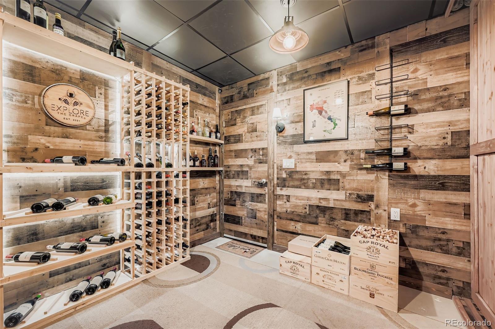 Unobstructed mountain views define this immaculate 5-bed, 4-bath home in Wyndham Hill. The main level features a great room wired for surround sound and a chef’s kitchen equipped with a large island, gas range, and double ovens. A dedicated main-floor office with new carpet and a functional mudroom provides a practical layout for modern living. The upper level includes a versatile loft and four bedrooms. The primary suite offers a 5-piece bath and walk-in closet, while a separate guest room features its own en-suite bathroom. A dedicated laundry room adds convenience to the top floor. The basement is built for entertaining, featuring an L-shaped media/game room with 4-speaker surround sound. It includes a fifth bedroom, a full bath, and a standout temperature-controlled wine cellar, truly a Sommelier's dream room, with clever barn-door storage. Outside, the pristine backyard offers a covered patio and quiet privacy. Tech-ready with fiber optic internet and CAT 5 wiring throughout. HOA amenities include a pool, clubhouse, and parks. Located a 10-minute walk from Grand View Elementary and minutes from I-25, restaurants, and shops. A rare find with permanent views.