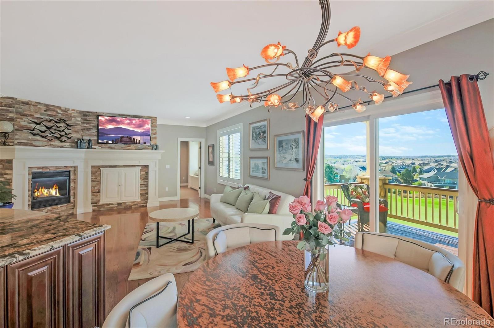 Perfectly positioned on the prestigious Saddle Rock Golf Course, this property offers breathtaking, unobstructed views of the lush fairways and open skies—views you can enjoy every day from your covered balcony, the ideal spot to sip your morning coffee or unwind in the evenings. This thoughtfully designed ranch-style home features a xeriscaped yard, offering both beauty and low-maintenance living. Step inside to the foyer that flows into an open living area filled with natural light. The living room features a cozy gas fireplace, while the kitchen is a chef’s dream, complete with custom lighting, granite countertops, a gas cooktop, double ovens, and hardwood floors that add warmth throughout. The dining area sits just off the kitchen and living space, making entertaining effortless. The primary suite is a true retreat, located on the main level and featuring golf course views through a bay window, custom ceilings, two walk-in closets, and a luxurious en-suite bathroom with double sinks, jetted soaking tub, and a walk-in shower. On the main level, you’ll also find an additional bathroom and a second bedroom with built-in desks—perfect for a home office or study. The walk-out basement is designed for relaxation and entertainment. It features a family room with a linear fireplace, a dry bar with a beverage cooler, and direct access to a covered patio that continues to showcase the amazing golf course scenery. Two additional bedrooms and another full bathroom provide plenty of space for guests or family, while half of the basement is unfinished, offering potential for customization. The location couldn’t be better—minutes from Southlands Mall, top-rated Cherry Creek schools, parks and trails, with quick access to E-470. This home is the perfect blend of luxury, comfort and convenience, all set against the serene backdrop of one of Aurora’s most sought-after golf course communities. Don’t miss this rare opportunity to live the Saddle Rock lifestyle.