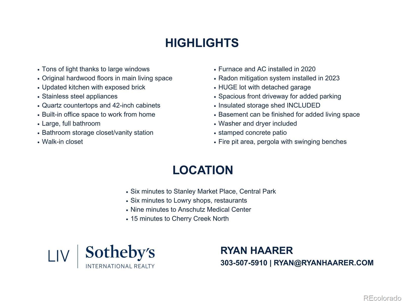 Do not miss this charming bungalow packed with updates and room to grow on a massive lot! The home itself features original hardwood floors and large windows for maximum sun exposure. The kitchen has been tastefully refreshed with off-white custom cabinetry, soft-close drawers, granite countertops, stainless steel appliances, a gas range, and an undermount sink, all tied together with charming details like exposed brick and an open, functional flow. The main level includes two comfortable bedrooms (one with a walk-in closet!) a spacious full bathroom with great storage and a built-in office nook, perfect for working from home without sacrificing a bedroom. Big ticket items have been replaced: furnace and AC installed in 2020. Radon mitigation installed in 2025. Beyond the main level you have more than 550 square feet in a basement for storage or finish it out as an office, secondary living room or bedroom. Out back, the fully fenced yard is set up for relaxing and entertaining with a stamped concrete patio, fire pit area, pergola with swinging benches, raised garden space, and mature landscaping that blooms beautifully in season. There’s also alley access to a one-car garage, two additional off-street parking spaces, and an insulated shed with electricity, ideal for extra storage. All of this in an incredibly convenient location near Central Park and Lowry, close to Verbena Park and Lowry Field, and just minutes from Anschutz, Cherry Creek, and Downtown Denver.