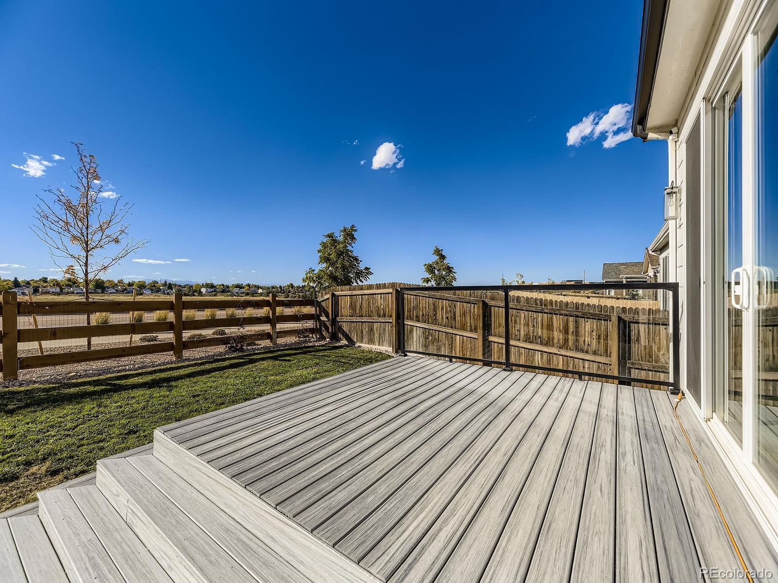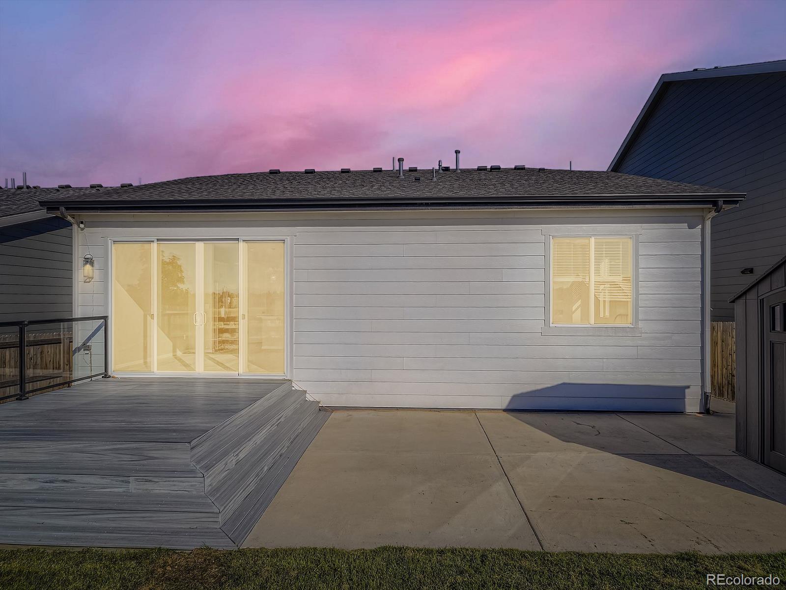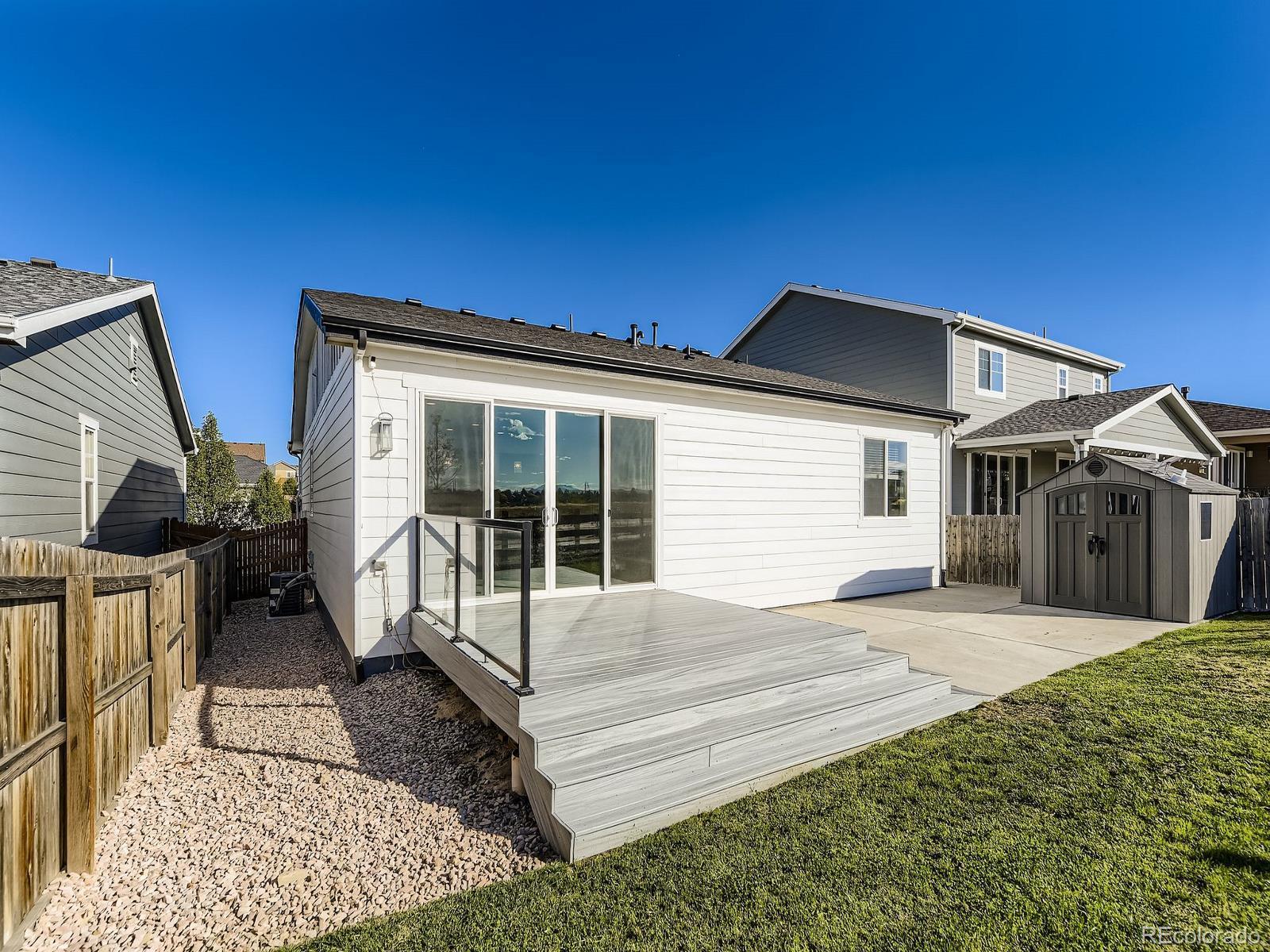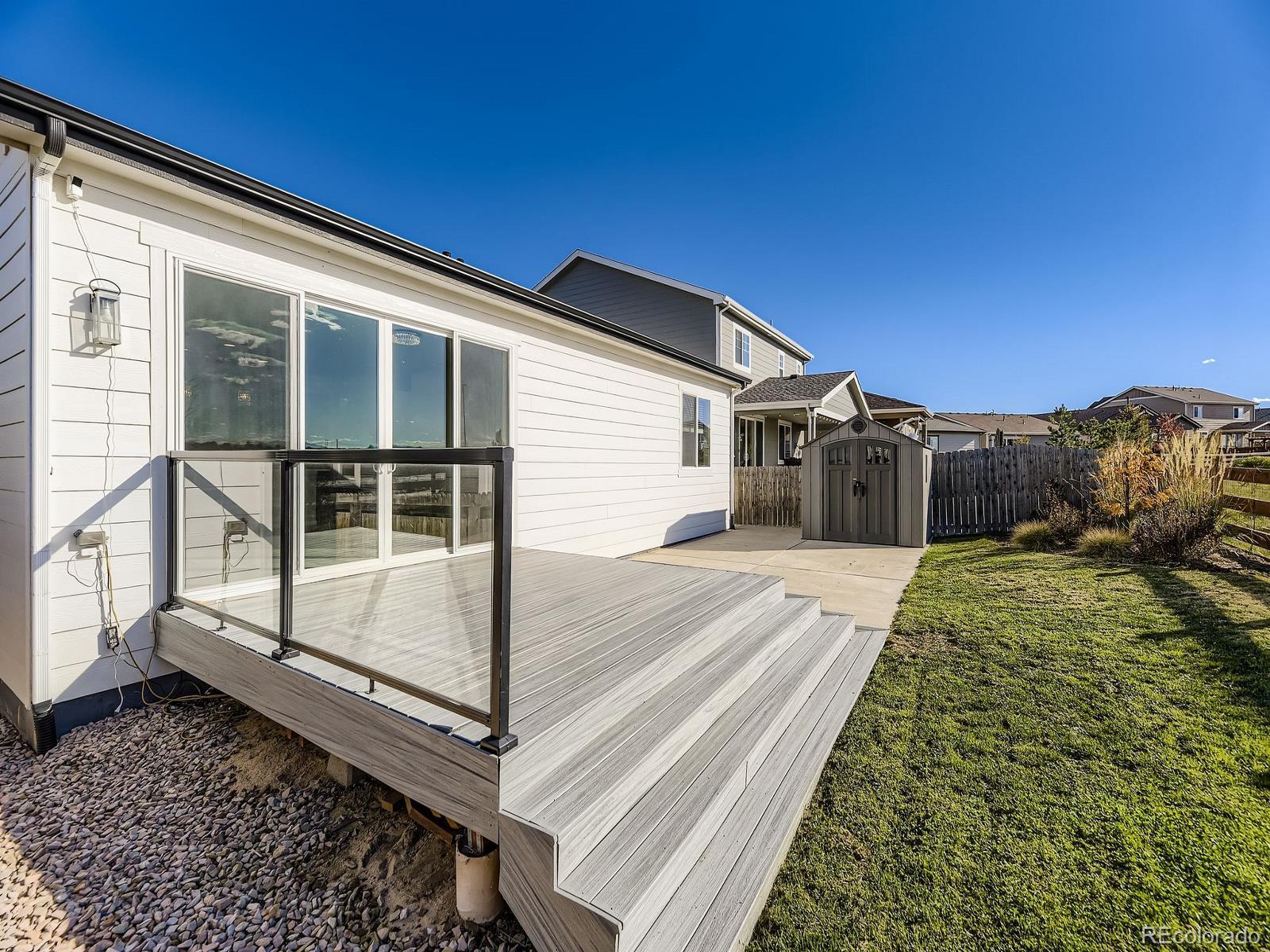 This is the one! You can be Home For The Holidays in this gorgeous move-in ready ranch style house with upgrades throughout! Step inside from the covered from porch and be immediately impressed by the high ceilings and tall doors. Notice the gorgeous plank flooring throughout the entire home. After viewing the two bedroom and full bath at the front of the home come down the hall into the kitchen and find the Quartz counters, gas stove, walk-in pantry, and upgraded light fixtures. As you fall in love with the large living room you will step into the backyard and enjoy the composite deck where you will find yourself spending evenings sipping cocktails watching the Colorado sunsets over the mountain views. Yes, the shed will stay for your storage needs. Come back inside and see the the primary suite including the a walk-in closet with customizable Ikea Pax wardrobe, in addition to the en-suite bath with large walk-in shower and double vanity. The Level 2 car charger in the garage stays for your EV. Just five years old, this home beats new construction as the backyard has already been landscaped (see the invoice in the supplements), and the roof was replaced just two years ago (again, see the supplements). Be sure to click the Virtual Tour link to view the 3D walkthrough. Welcome home! *See the MLS Supplements for information on the 2-1 Rate Buydown being offered!*