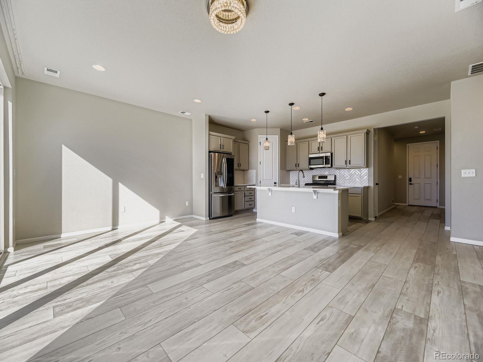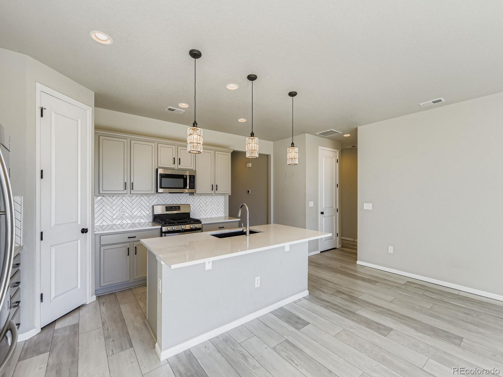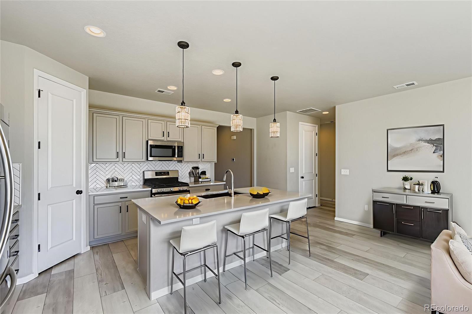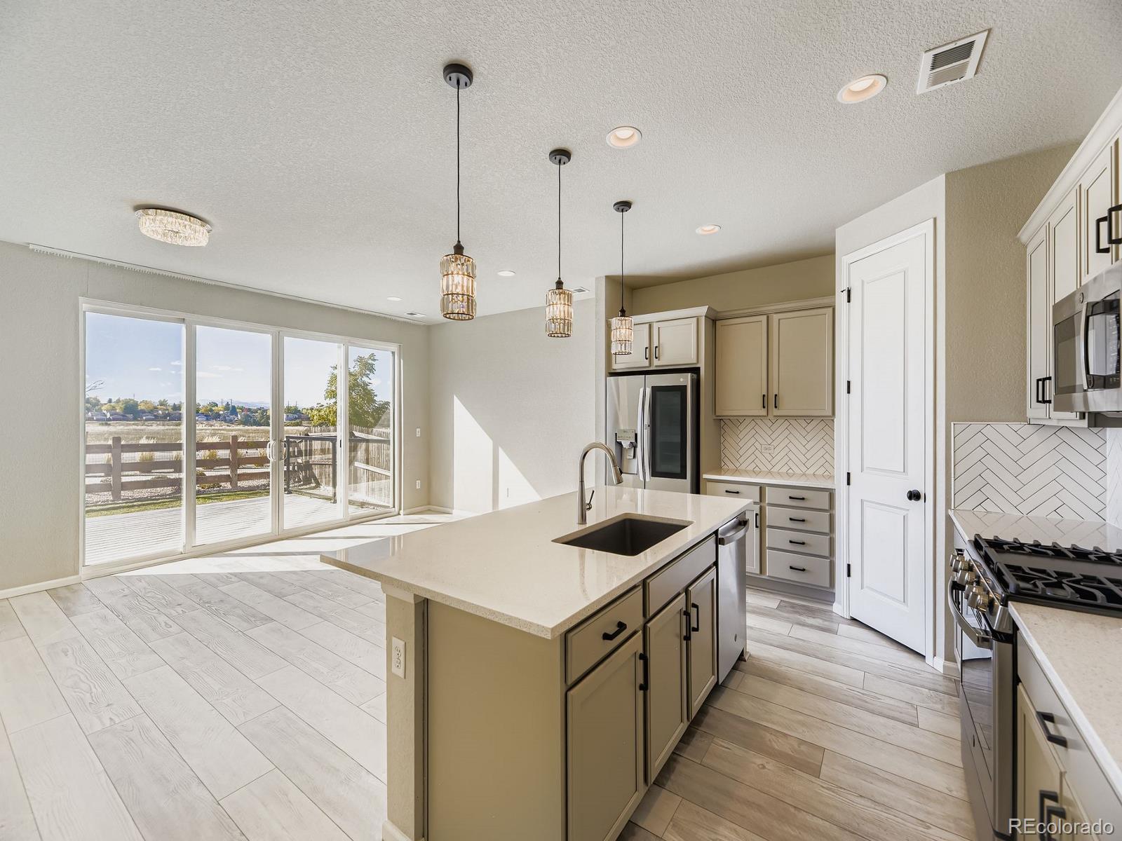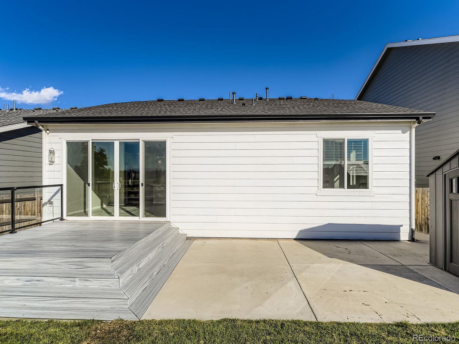 This is the one! You can be Home For The Holidays in this gorgeous move-in ready ranch style house with upgrades throughout! Step inside from the covered from porch and be immediately impressed by the high ceilings and tall doors. Notice the gorgeous plank flooring throughout the entire home. After viewing the two bedroom and full bath at the front of the home come down the hall into the kitchen and find the Quartz counters, gas stove, walk-in pantry, and upgraded light fixtures. As you fall in love with the large living room you will step into the backyard and enjoy the composite deck where you will find yourself spending evenings sipping cocktails watching the Colorado sunsets over the mountain views. Yes, the shed will stay for your storage needs. Come back inside and see the the primary suite including the a walk-in closet with customizable Ikea Pax wardrobe, in addition to the en-suite bath with large walk-in shower and double vanity. The Level 2 car charger in the garage stays for your EV. Just five years old, this home beats new construction as the backyard has already been landscaped (see the invoice in the supplements), and the roof was replaced just two years ago (again, see the supplements). Be sure to click the Virtual Tour link to view the 3D walkthrough. Welcome home! *See the MLS Supplements for information on the 2-1 Rate Buydown being offered!*