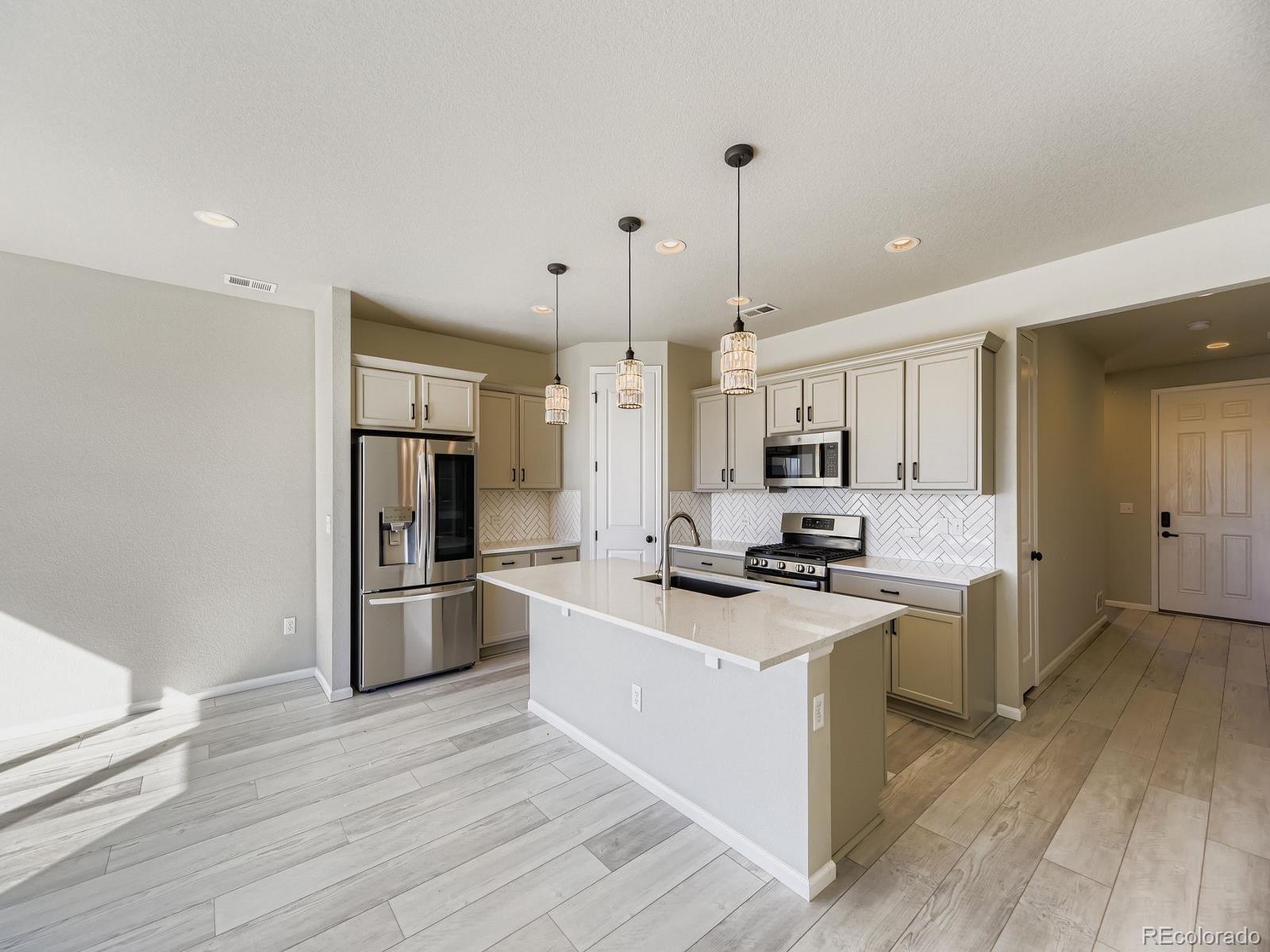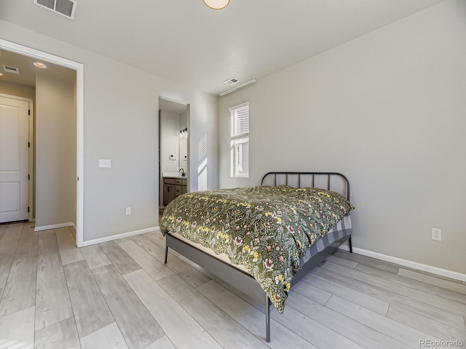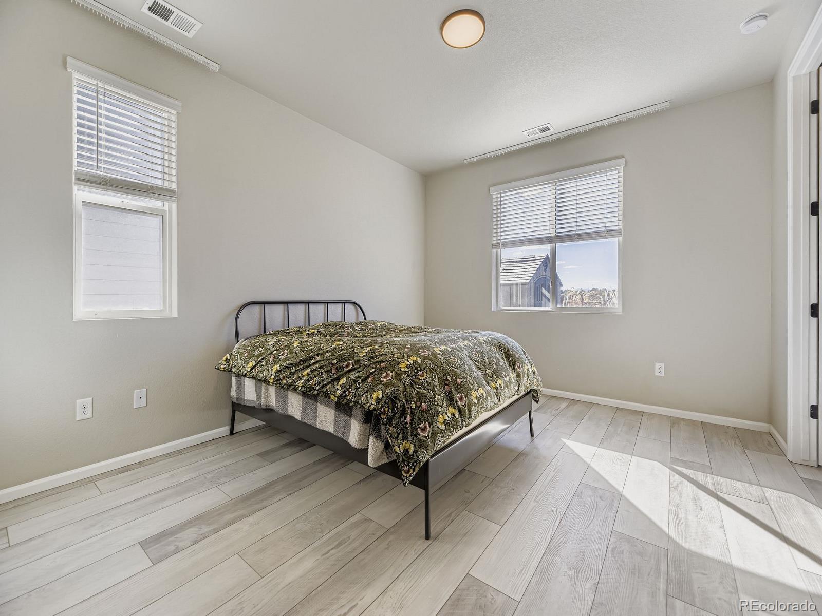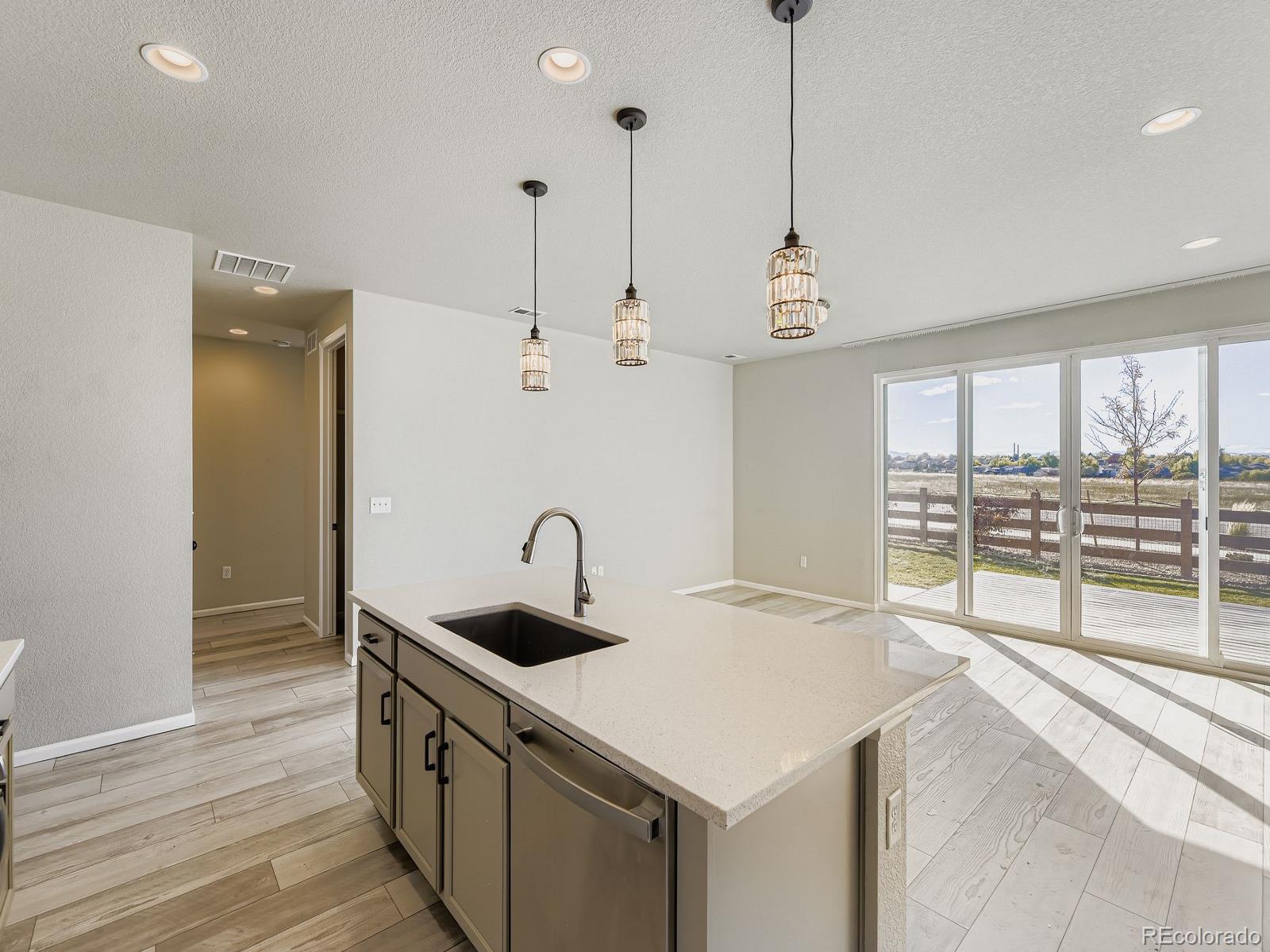 This is the one! You can be Home For The Holidays in this gorgeous move-in ready ranch style house with upgrades throughout! Step inside from the covered from porch and be immediately impressed by the high ceilings and tall doors. Notice the gorgeous plank flooring throughout the entire home. After viewing the two bedroom and full bath at the front of the home come down the hall into the kitchen and find the Quartz counters, gas stove, walk-in pantry, and upgraded light fixtures. As you fall in love with the large living room you will step into the backyard and enjoy the composite deck where you will find yourself spending evenings sipping cocktails watching the Colorado sunsets over the mountain views. Yes, the shed will stay for your storage needs. Come back inside and see the the primary suite including the a walk-in closet with customizable Ikea Pax wardrobe, in addition to the en-suite bath with large walk-in shower and double vanity. The Level 2 car charger in the garage stays for your EV. Just five years old, this home beats new construction as the backyard has already been landscaped (see the invoice in the supplements), and the roof was replaced just two years ago (again, see the supplements). Be sure to click the Virtual Tour link to view the 3D walkthrough. Welcome home! *See the MLS Supplements for information on the 2-1 Rate Buydown being offered!*