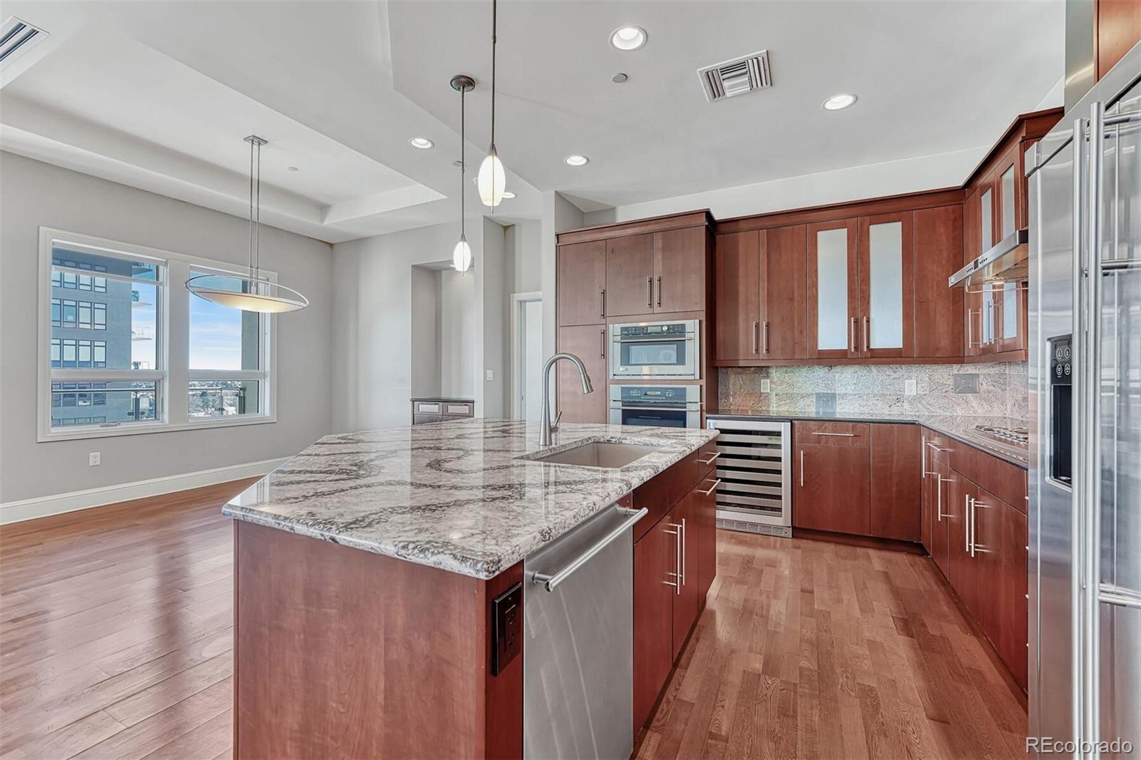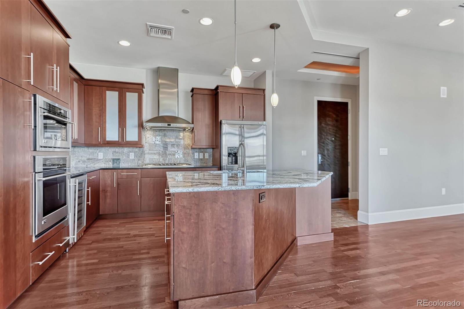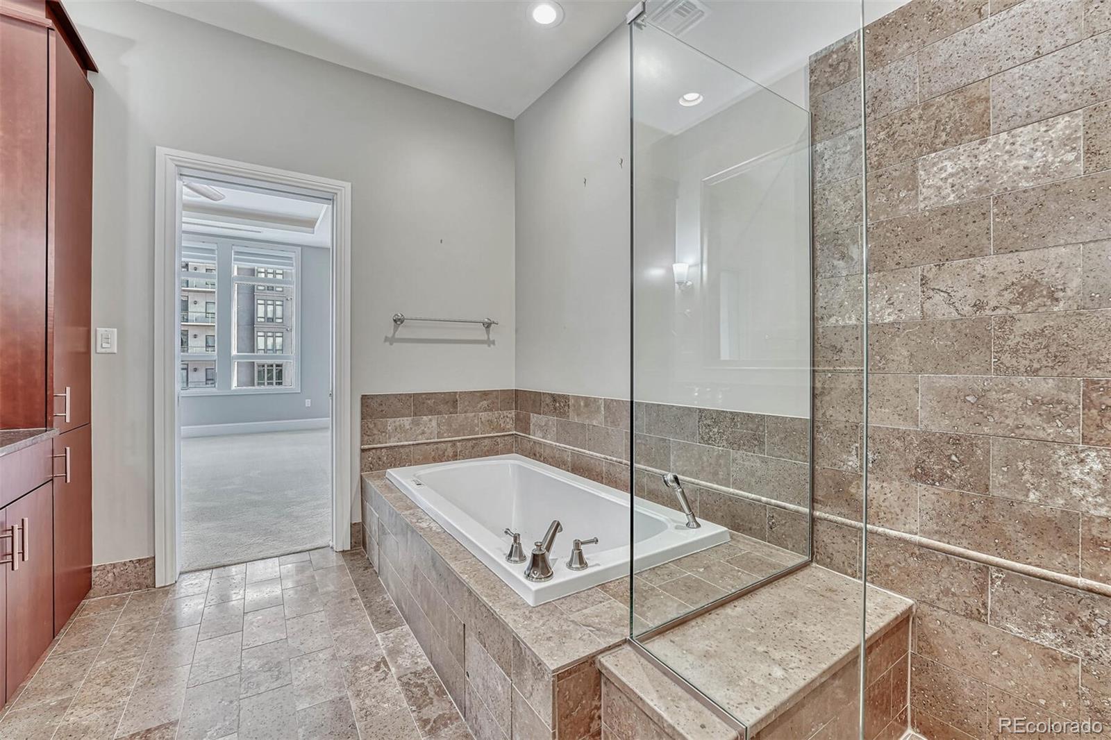 Live the luxury lifestyle from this stunning 2br/2ba condominium in The Landmark. Dining and entertainment are steps from this impressive Greenwood Village, dog and cat friendly high rise community. With 2 assigned parking spaces in the underground, secure parking lot, driving to and from downtown and DIA is easy, or take the nearby light rail. Located in the heart of the Denver Tech Center and serviced by an attentive, professional 24-hour concierge staff, residents enjoy time saving services and leveraged local resources. While offering a variety of social opportunities, The Landmark also respects the privacy of residents. Amenities include 2 pools, gym, business center, library, theatre, wine storage, and more. Inside the unit, rich cherry cabinets with under cabinet lighting, soft close doors and pull-out shelves pamper the chef in the kitchen. An oversized granite island doubles as a breakfast bar or buffet area while entertaining. The open concept layout incorporates the living, dining and kitchen into a single beautiful, light-filled room. Gorgeous high-end appliances include stainless steel built-in ovens, gas stovetop, dishwasher, and fridge. Two balconies offer birds eye views from this 7th floor gem. The master bedroom is spacious and has a large, attached bathroom with jetted tub, frameless glass shower and dual vanity. A professionally designed custom walk-in closet offers optimized clothing storage. The laundry room includes a stackable washer/dryer, folding counter and additional storage. The second bedroom is useful as an office or guest room with nearby private bathroom. High ceilings with ambient lighting sets the mood and adds to the luxe feeling of this unit. The Landmark offers an incredible luxury living experience surrounded by many amazing Denver attractions--from gorgeous meandering parks to Fiddlers Green Amphitheatre to endless recreation trails to some of the best dining in the country. Come home to The Landmark and have it all!