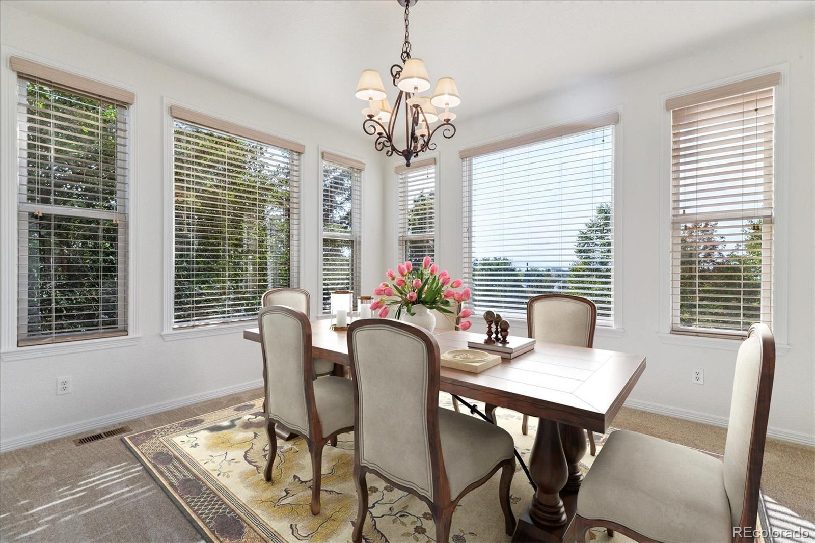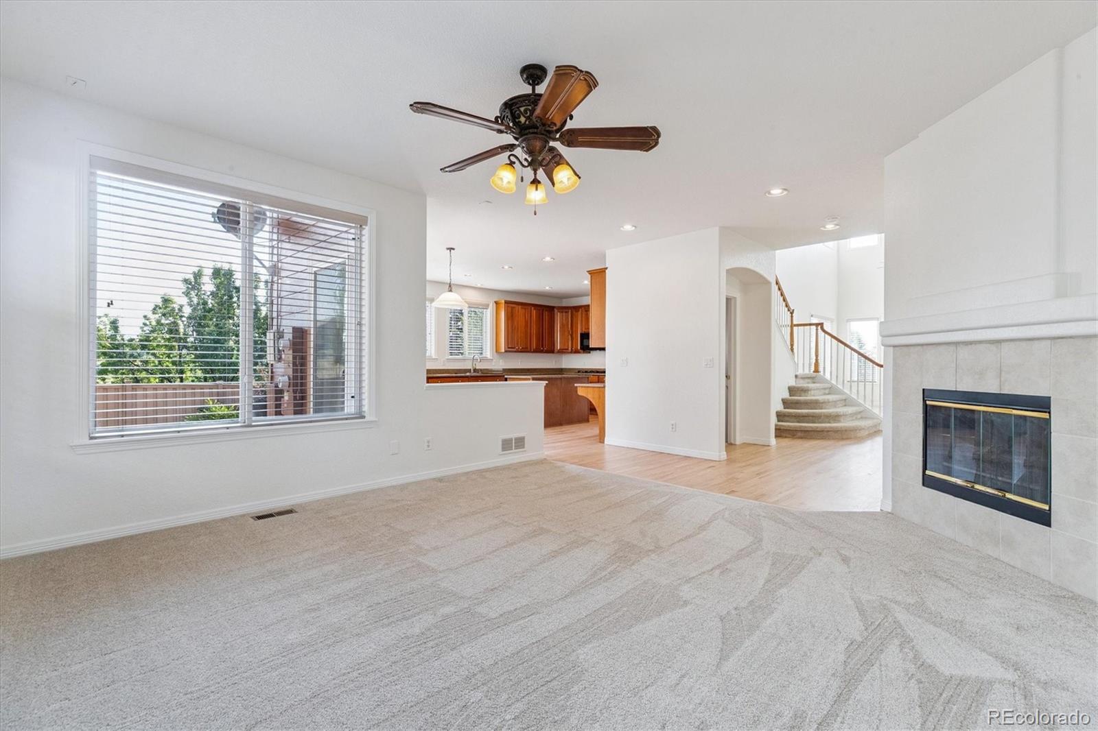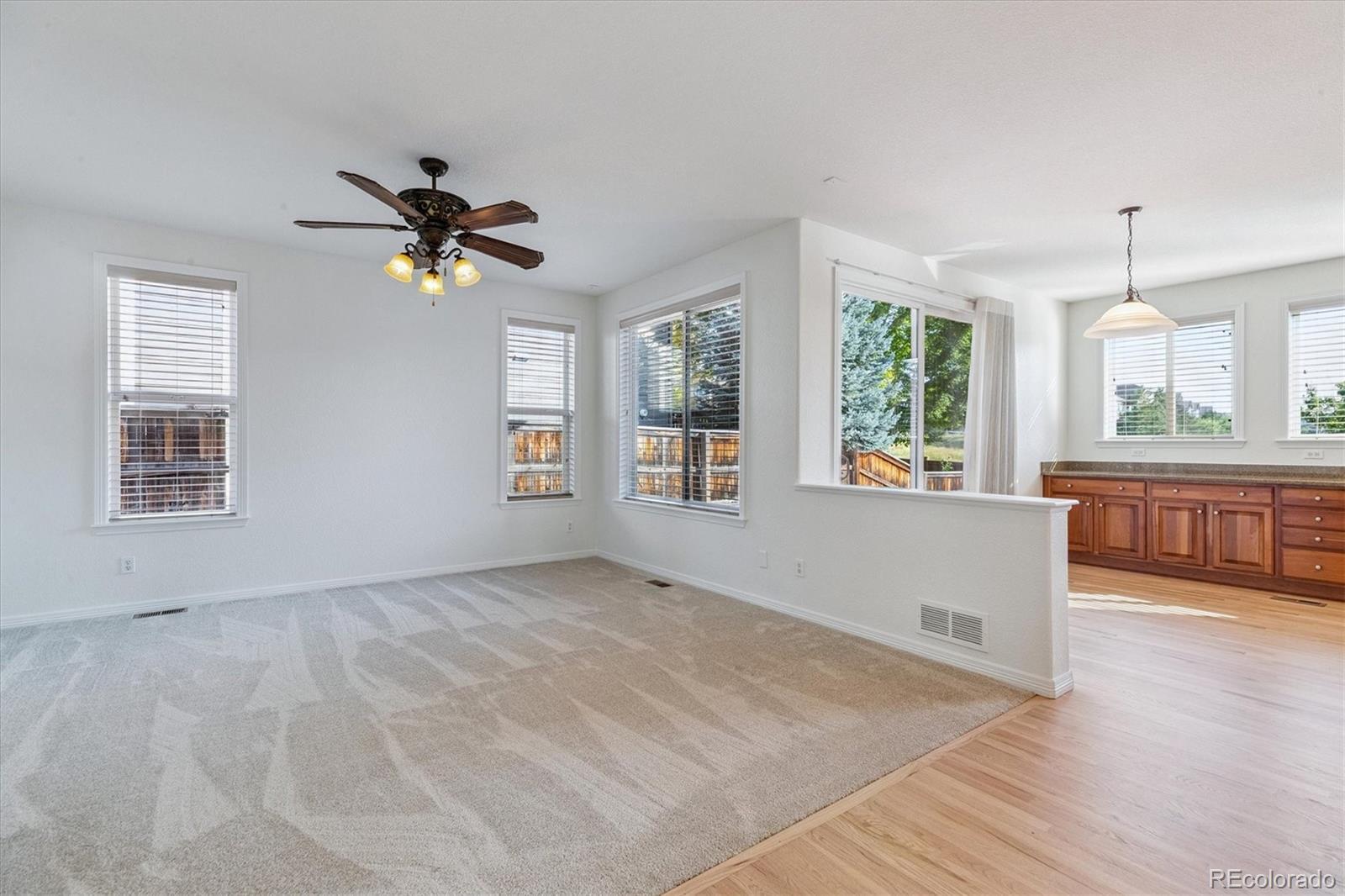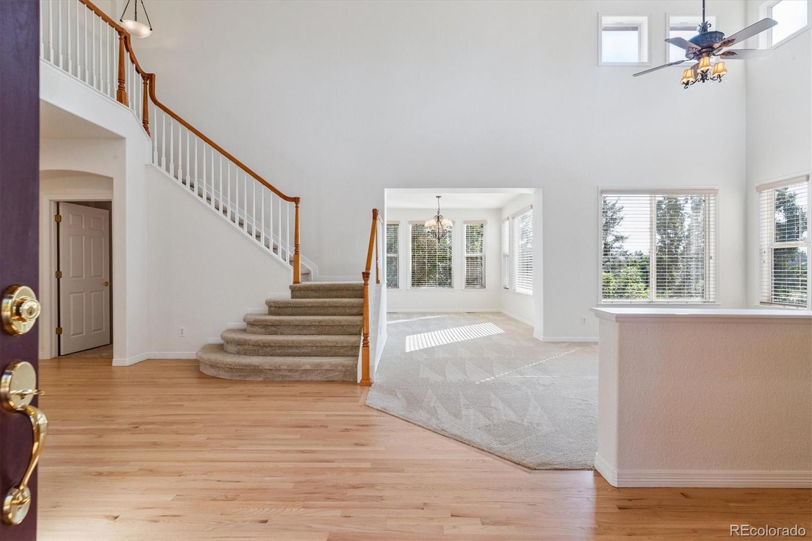 Exquisite Timber Ridge model by Shea Homes, located in the sought-after Stonebury neighborhood of Highlands Ranch, combines timeless elegance with modern comfort. Recent updates include beautifully refinished hardwood floors, fresh interior paint, and newly installed plush carpeting throughout. Cased window trim with blinds adds a touch of sophistication, while the gourmet kitchen impresses with granite countertops, a large center island, cherry cabinetry with roll-out shelving, stainless steel refrigerator, a chef-inspired gas cooktop, and double convection oven. Designed for both entertaining and everyday living, the home offers formal living and dining rooms as well as a spacious family room that flows seamlessly into the kitchen and breakfast nook—an inviting space for gatherings or quiet nights at home. Upstairs, the luxurious primary suite includes a spacious retreat that can be converted to a fifth bedroom. Three additional large bedrooms are accompanied by a full hallway bath and a private en-suite guest bath, offering plenty of room for family and guests. The outdoor living space is just as impressive, featuring a beautifully landscaped yard with in-ground sprinklers, an expansive patio and deck - perfect for year-round enjoyment. The spacious 3-car garage with service door offers convenience and ample storage shelving for all your car care and outdooer necessities. Located near top-rated schools, shopping, dining, recreational facilities and quick access to miles of scenic trails through out Highlands Ranch, this move-in ready home also comes with a one-year home warranty for peace of mind.