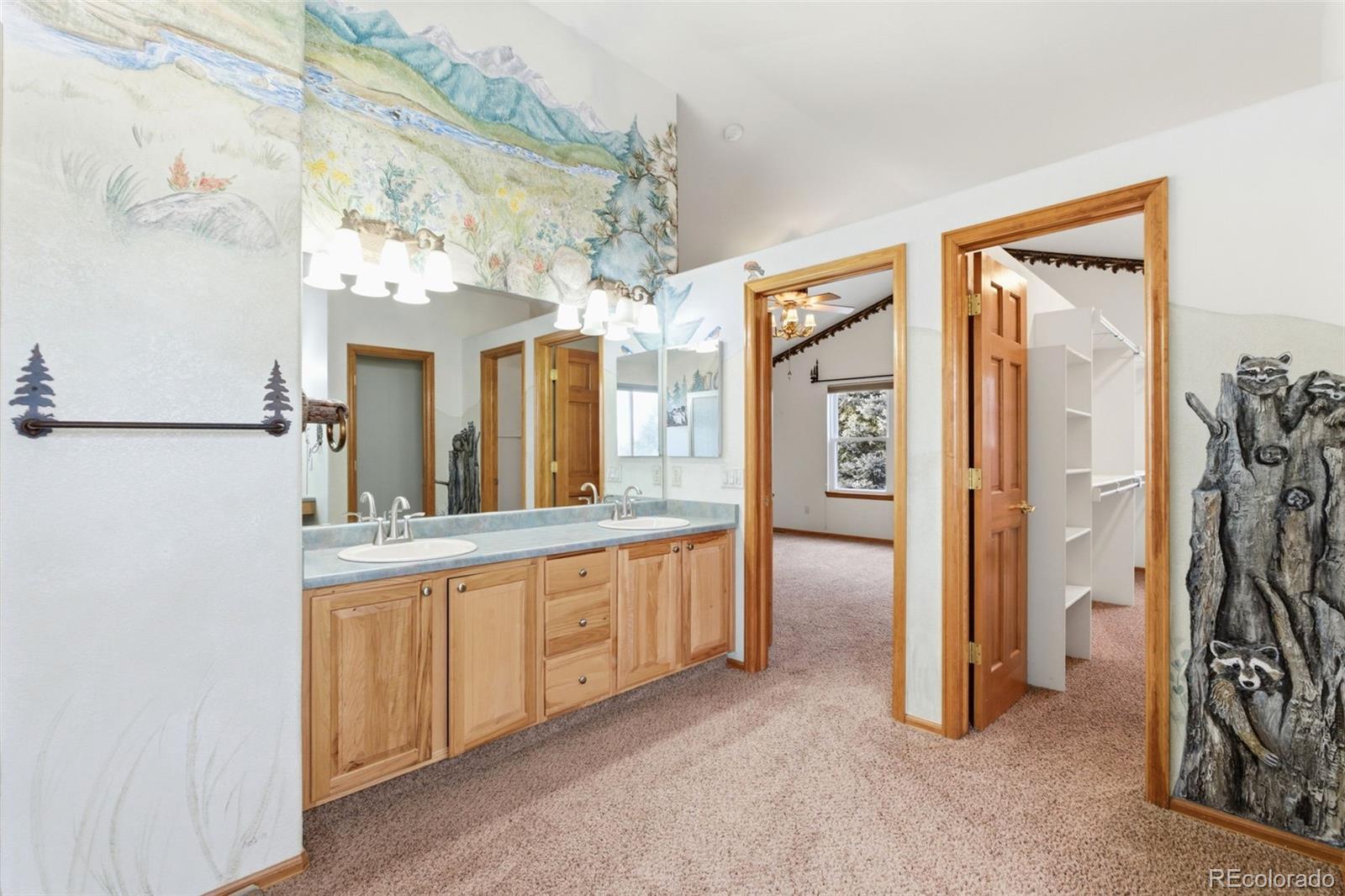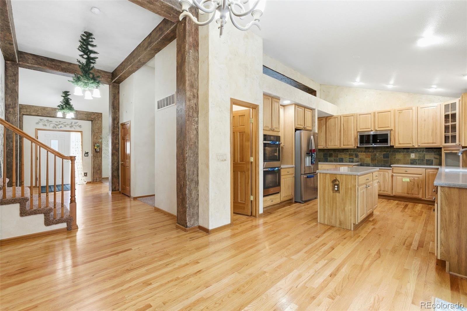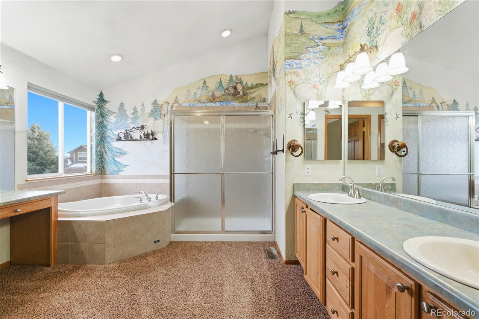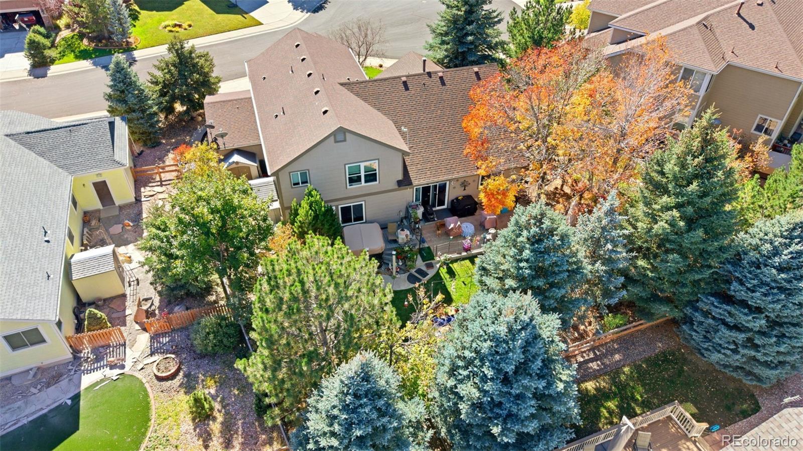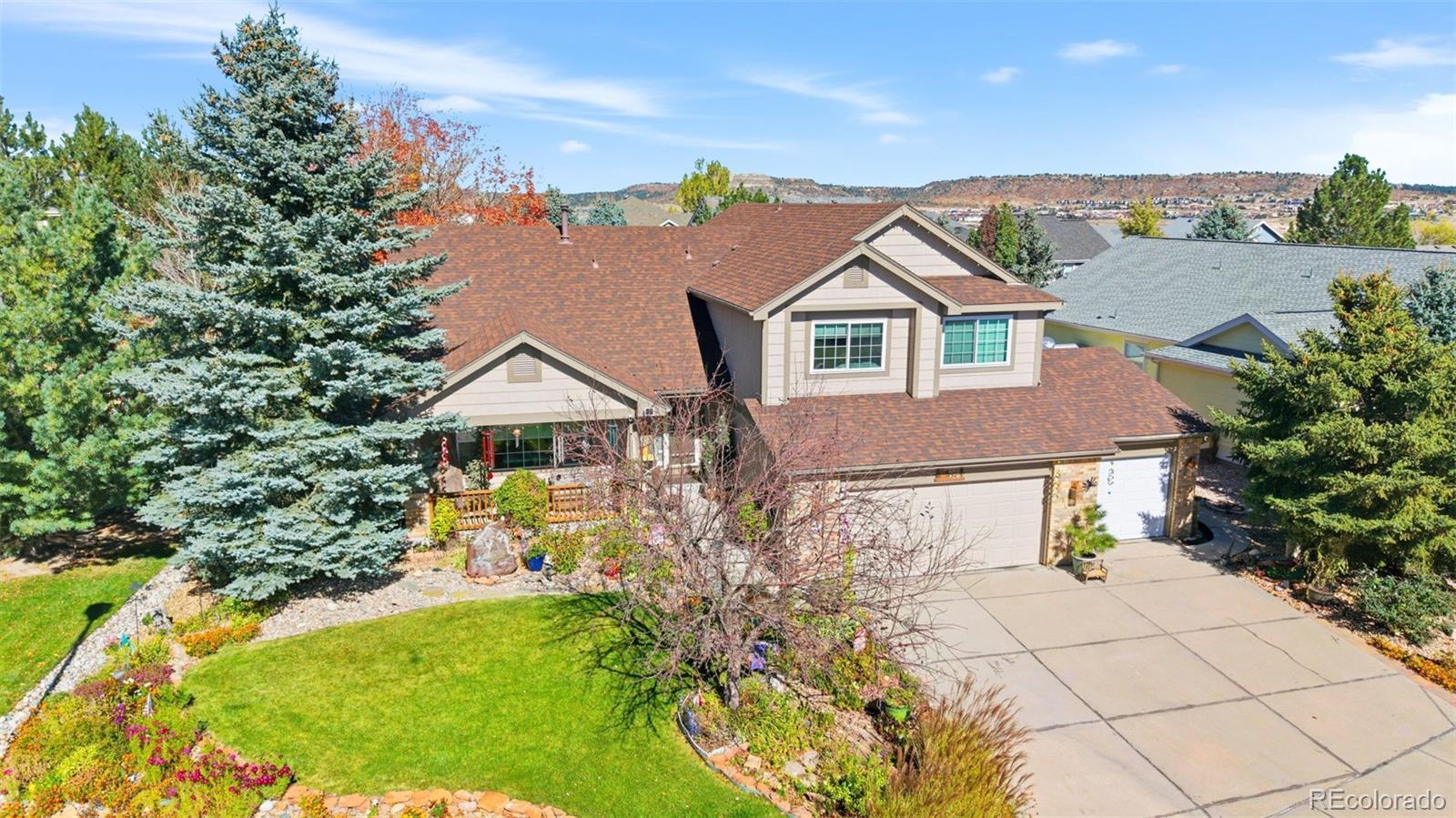 Wake each morning to sweeping mountain, butte, and valley views as the sun rises over Red Hawk and sets the sky ablaze each evening—this is modern living reimagined, right in the heart of Castle Rock. Tucked quietly at the end of a private cul-de-sac and surrounded by the locally acclaimed Red Hawk Golf Course, this home is a true retreat: close to shopping and dining, yet blissfully removed from the bustle of everyday life. From the moment you step through the dramatic foyer, framed by massive wood beams, you’re welcomed into a space designed to tell a story. Famed artist Amy Springer has lovingly and meticulously crafted one-of-a-kind enhancements throughout the home, evoking the warmth of classic log cabins, the serenity of snow-capped peaks, and the quiet magic of Colorado wildlife. Every room is thoughtfully curated to reflect the peaceful scenes of mountain living—without ever leaving town. The upper level offers three inviting bedrooms, while the main-floor laundry adds everyday ease. Downstairs, a cozy family room anchors the lower level, complemented by a spacious flex or office area that provides privacy for work, creativity, or quiet retreat. As evening settles in, the calculated calm of this interior street carries through to sunset, wrapping the home in tranquility. Step into the backyard and discover the final touch of this mountain escape: a fully functional stream meandering over smooth cobblestones, reminiscent of high-country snowmelt. Sit back, listen to the water flow, and imagine the life waiting for you here—where nature, artistry, and comfort converge in one unforgettable Castle Rock sanctuary.