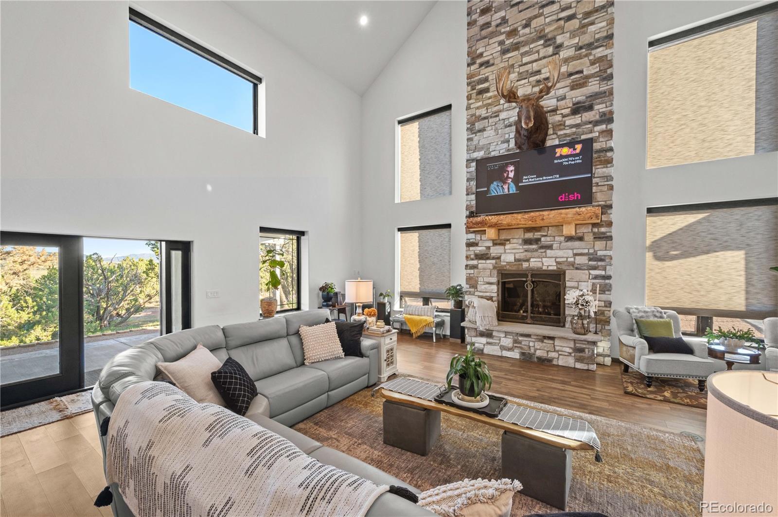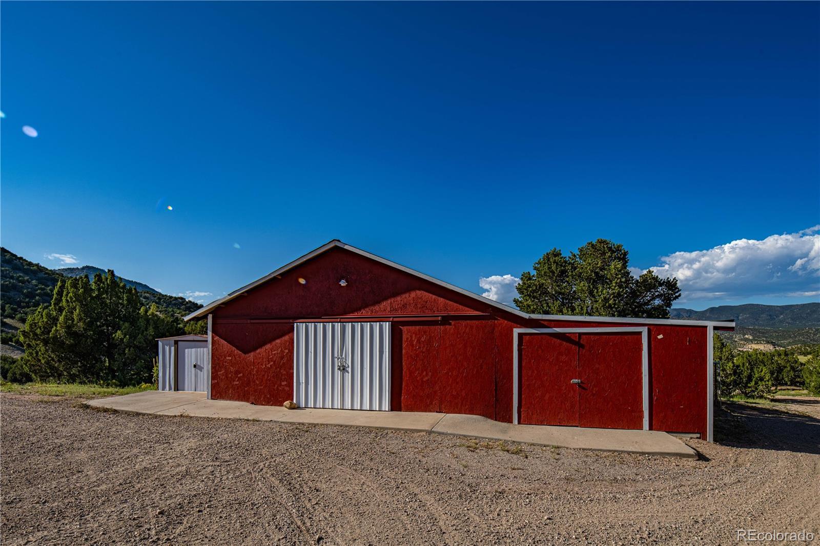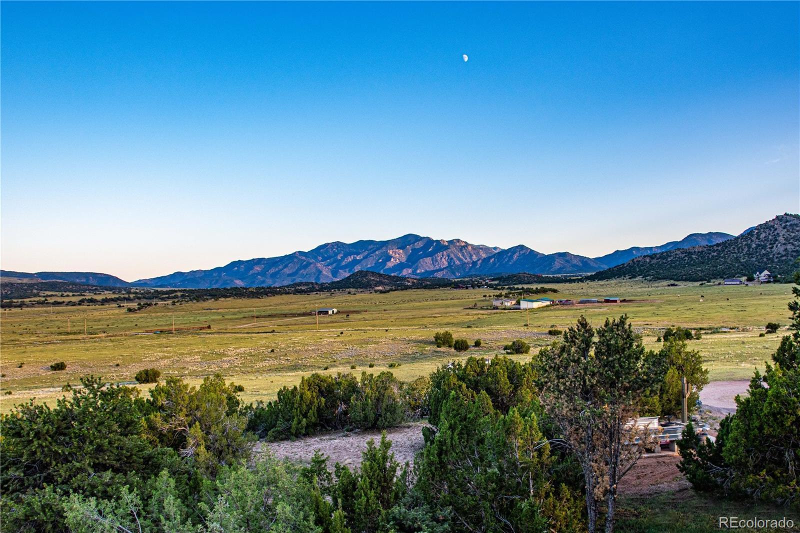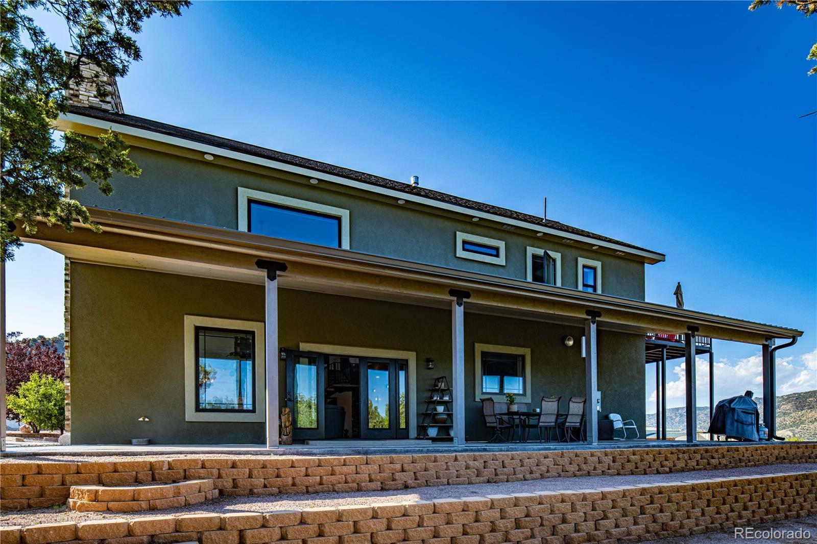 Dusty Ranch, is a luxurious 6-bedroom, 5-bathroom single-family home spanning 5,104 square feet on a sprawling 40-acre lot. This newly constructed custom home, built in 2023, offers a blend of refined craftsmanship and serene seclusion. Nestled near Canon City in the Rocky Mountain foothills, it provides breathtaking panoramic views of the Sangre de Cristo Mountains and direct access to 20,000+ acres BLM land, ideal for outdoor enthusiasts. A gated entry leads to the hilltop home, designed with state-of-the-art insulated concrete form construction for energy efficiency. The property boasts 40 acres of privacy, with proximity to the Arkansas River (2 miles away) for world-class fly fishing and rafting, and the Royal Gorge Bridge and Railroad nearby. The landscape is perfect for adventure, with abundant wildlife like elk and deer. The home features an open-concept living area with vaulted ceilings, a floor-to-ceiling stone gas fireplace, and expansive covered porches for seamless indoor-outdoor living. The gourmet kitchen includes an imported Hallman gas range oven, high-end stainless appliances, custom cabinetry, a stone island, and a beverage station with a drink cooler and coffee bar. The upper level offers a dedicated library or office, vaulted ceiling bedrooms, and cozy window nooks. The walkout level provides ample space for entertaining or guest privacy. The home is equipped with in-floor radiant heat, a high-end Culligan water softener and filtration system. It also has a split unit AC that cools the home if needed. A 3-car garage with additional RV parking and charming landscaping enhance functionality. The property is designed for year-round comfort and is pet-friendly. This estate, designed by a premier North American architect, combines modern luxury with the natural beauty of Southern Colorado, offering a lifestyle of tranquility and adventure. CHECK OUT THE NEWLY FINISHED GREENHOUSE