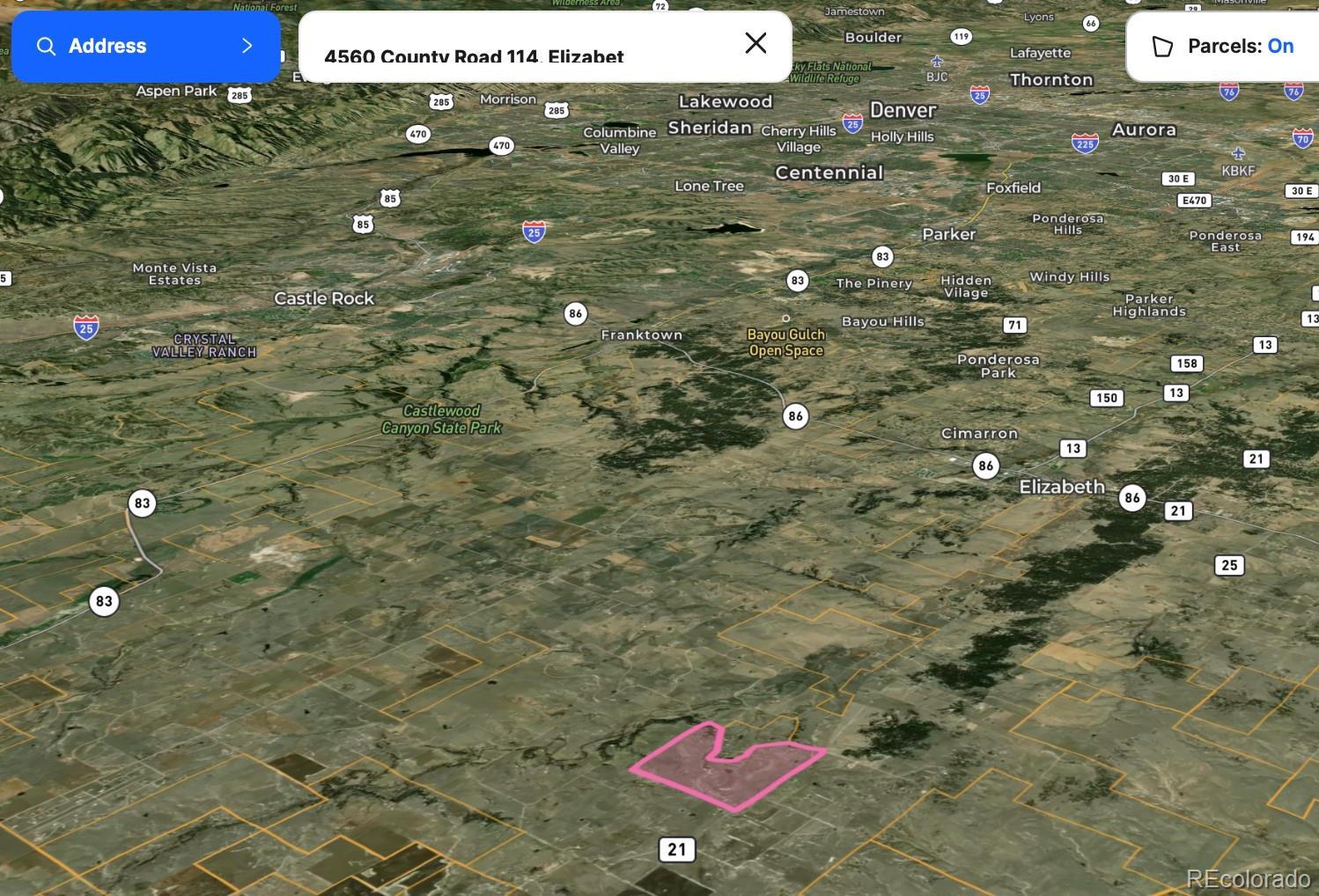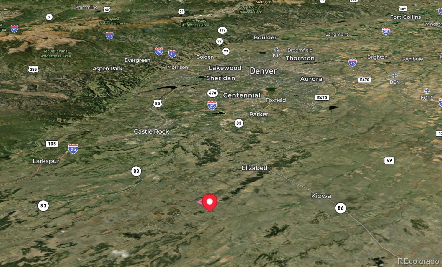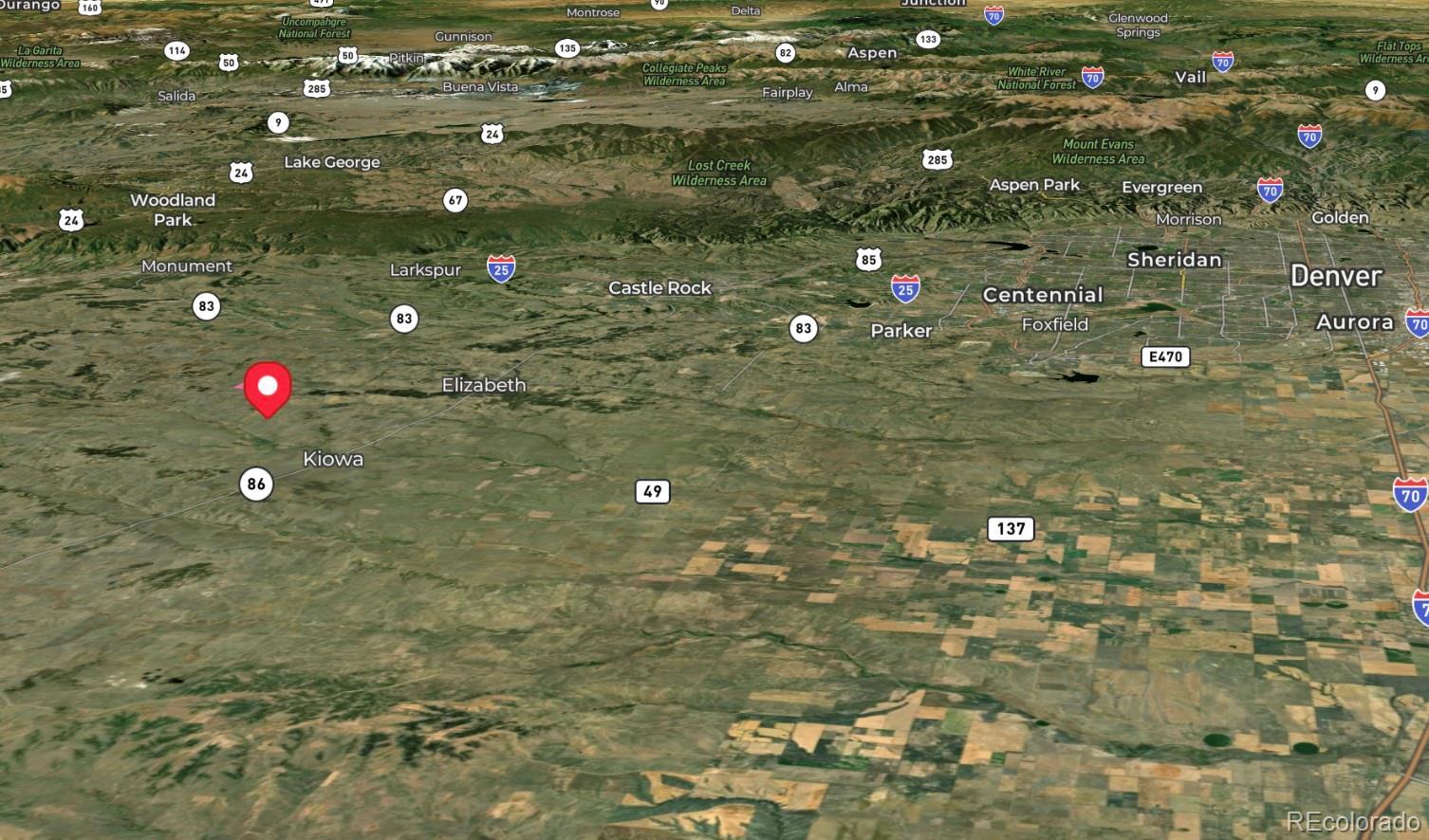 500 acre parcel with ample water rights developable land-south of Elizabeth town on a paved road -lot of road frontage, rolling hills, pine trees, rock outcroppings, amazing pikes peak views--country living yet close to the town restaurants, Super Walmart Starbucks are 10-15 min drive. Great opportunity to own this beautiful land for either immediate development or long term holding, nothing this size is available from Parker to Elizabeth. Water rights are negotiable. features rolling hills, drainage areas, several ponds, bluffs, rock outcroppings, pine trees, and incredible mountain and country views.This is a 700 acres parcel and only selling 500 acres will carve out the homes, barns and 200 acres at the time of closing or can include in this sale for additional $5M.