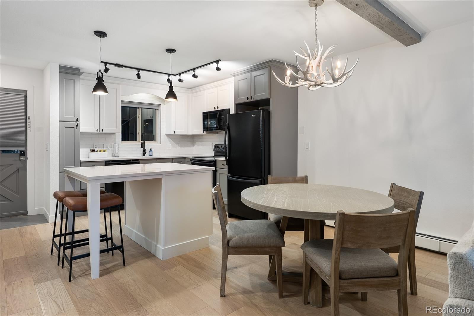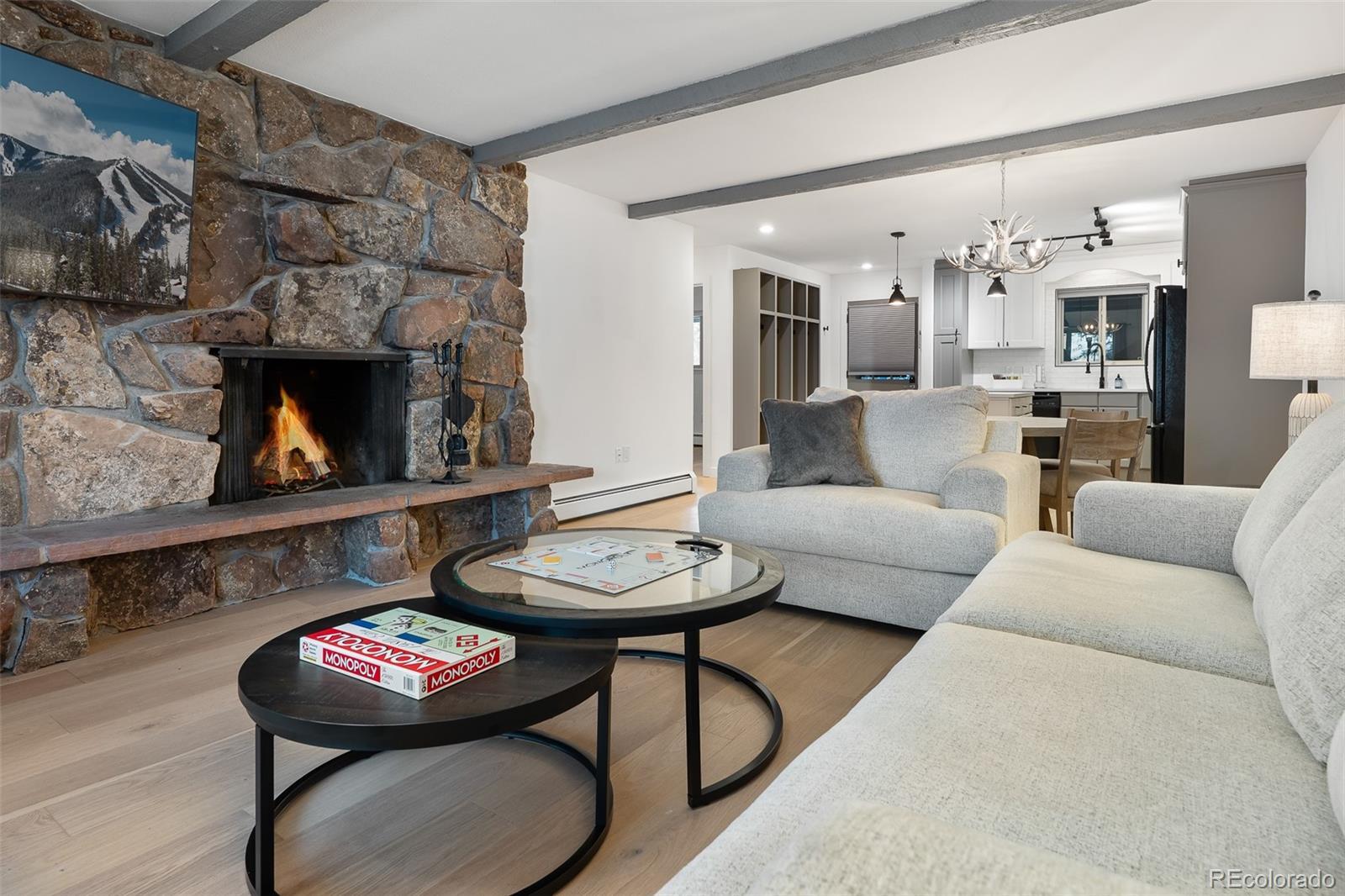 Hi Country Condos—a modern retreat in the heart of Winter Park, CO. Completely remodeled, this charming 2-bedroom, 2-bath home offers 935 square feet of thoughtfully designed FURNISHED living space. Immerse yourself in the warmth of a wood-burning fireplace with a classic, retro rocked surround. Enjoy the convenience of an open kitchen with solid white quartz countertops and an island featuring additional cabinets. The eat-in kitchen benefits from a window that adds a touch of natural light, complemented by window coverings throughout. New plumbing fixtures and lighting in all the right places. Both bathrooms feature full tile surround showers and comforting heat lamps. Relax on the adorable private terrace or unwind in the communal hot tub and indoor pool. The terrace has a gate leading to the open space behind the condo, storage here too. The unit is equipped with an in-home washer/dryer unit and recessed lighting. THREE TVs are mounted and included for your entertainment, one of which is outdoors. BRAND NEW furniture is also included! Located in a quiet area, this unit belongs to one of the best buildings, offering a private entrance and multiple on-site parking options. Ski shuttle stop is right out the door. Stroll to Main Street for food, beer & wine... location is outstanding! When driving by, look for Building #22.