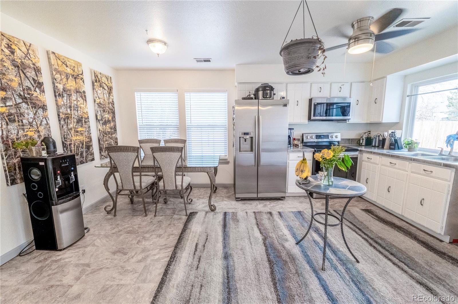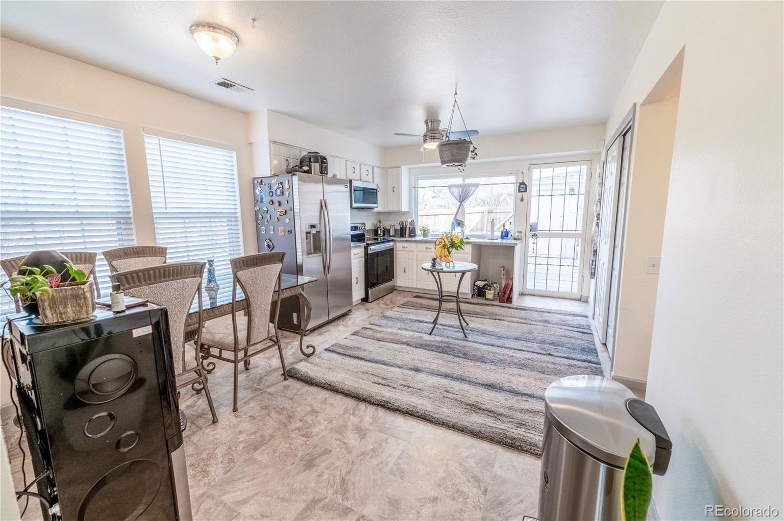Welcome to this spacious 4-bedroom, 2-bath townhome in the desirable Cherry Creek School District. With 1,524 sq. ft. of living space and a smart two-level layout, this end-unit home blends comfort, convenience, and community. The main level offers an open floor plan with natural light flowing through the living and dining areas. A cozy wood-burning fireplace anchors the living room, while the kitchen features stainless steel appliances and a breakfast nook. Two main-level bedrooms provide flexibility for guests, an office, or multi-generational living. Upstairs, you’ll find two additional bedrooms, a three-quarter bath, and a bonus loft-style space perfect for a home office, playroom, or reading nook. Step outside to a private backyard with a deck, ideal for summer barbecues or quiet evenings outdoors. Additional features include a detached 2-car garage, ceiling fans, and in-unit laundry for everyday ease. Located in The Dam community, residents enjoy access to a pool, clubhouse, and tennis courts. Nearby amenities include Heather Gardens Golf Club, Cherry Creek State Park, and the Town Center at Aurora. Easy access to I-225 provides quick connections to downtown Denver and the Tech Center. Bonus perks: this home comes with a transferable home warranty and a $10,000 seller concession, giving you room to customize and make it your own.