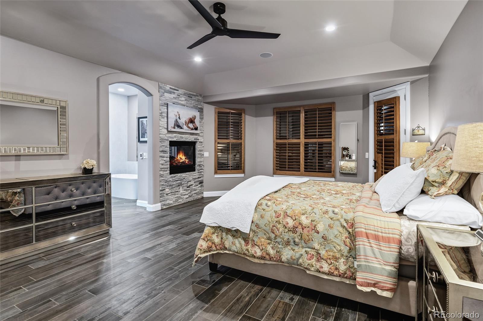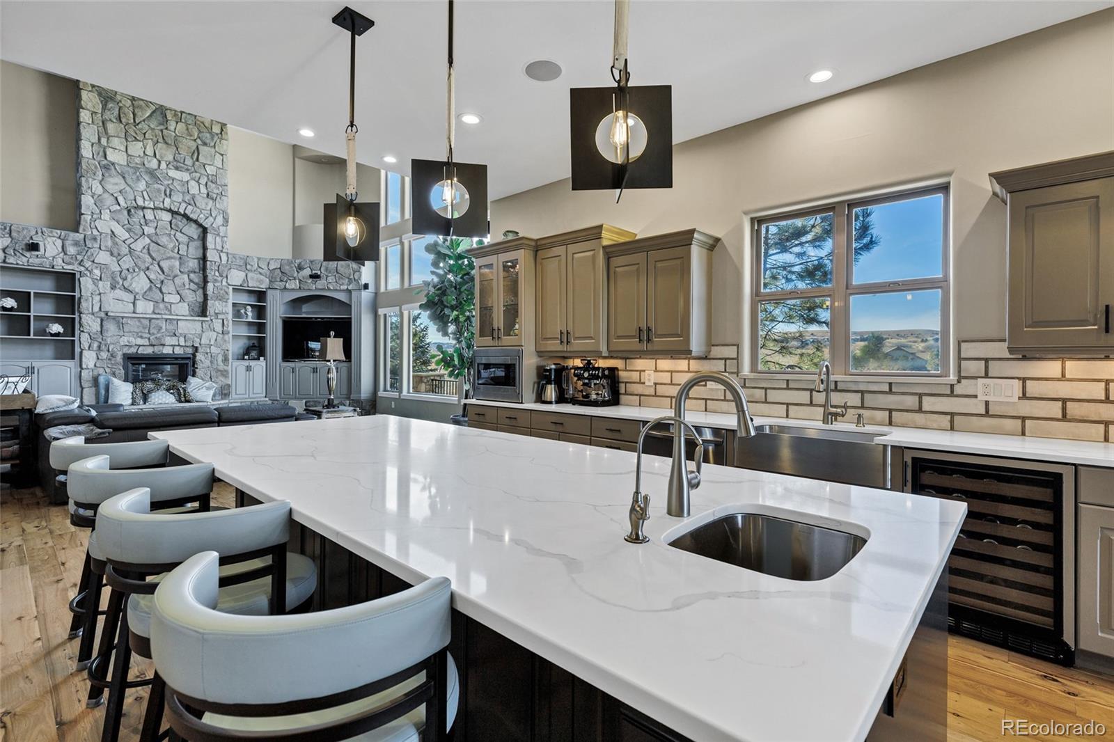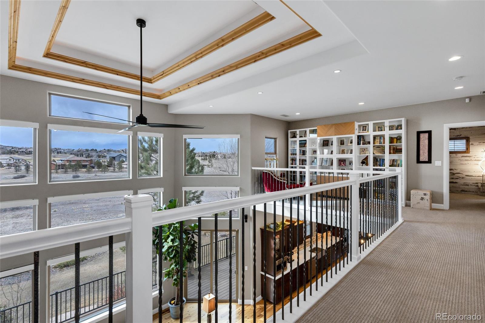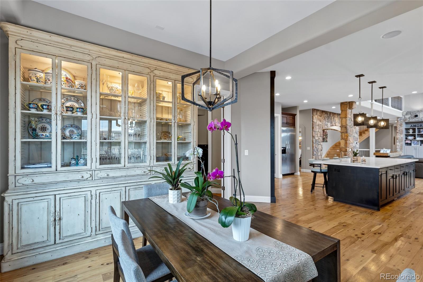 Experience elevated living at 5625 Twilight Way, a remarkable retreat within the prestigious private golf club community of Pradera. Set on nearly two acres and backing to open space, this exceptional property offers rare privacy, sweeping views, and unforgettable Colorado sunsets. From the moment you arrive, the home impresses with refined warmth and timeless elegance. Rich wood accents, expansive sun-filled windows, and thoughtfully crafted custom details are showcased throughout. A grand foyer with a striking spiral staircase opens to the great room, where stone-accented walls, a cozy fireplace, and dramatic west-facing windows create a stunning focal point. The space flows seamlessly into an elegant dining room with tray ceilings and a butler’s pantry—ideal for hosting. The chef’s kitchen blends beauty and function with custom cabinetry, high-end appliances, and an oversized island topped with white quartz countertops, perfect for everyday living and entertaining. The main-level primary suite is a true retreat, featuring a double-sided fireplace, heated floors, private deck access, a custom walk-in closet, and a spa-inspired bathroom. An additional main-floor bedroom with an en-suite bath offers flexibility for guests or multi-generational living. Downstairs, enjoy an entertainer’s haven complete with a second kitchen, stylish bar, home theater, game room with fireplace, and a dedicated wine cellar and tasting room. Outside, multiple outdoor living spaces invite you to relax and take in Colorado’s natural beauty. An impressive five-car garage provides ample room for vehicles, storage, toys, and a golf cart. A grand circular drive enhances the sense of arrival. This extraordinary home must be experienced in person to fully appreciate its comfort, craftsmanship, and captivating charm.