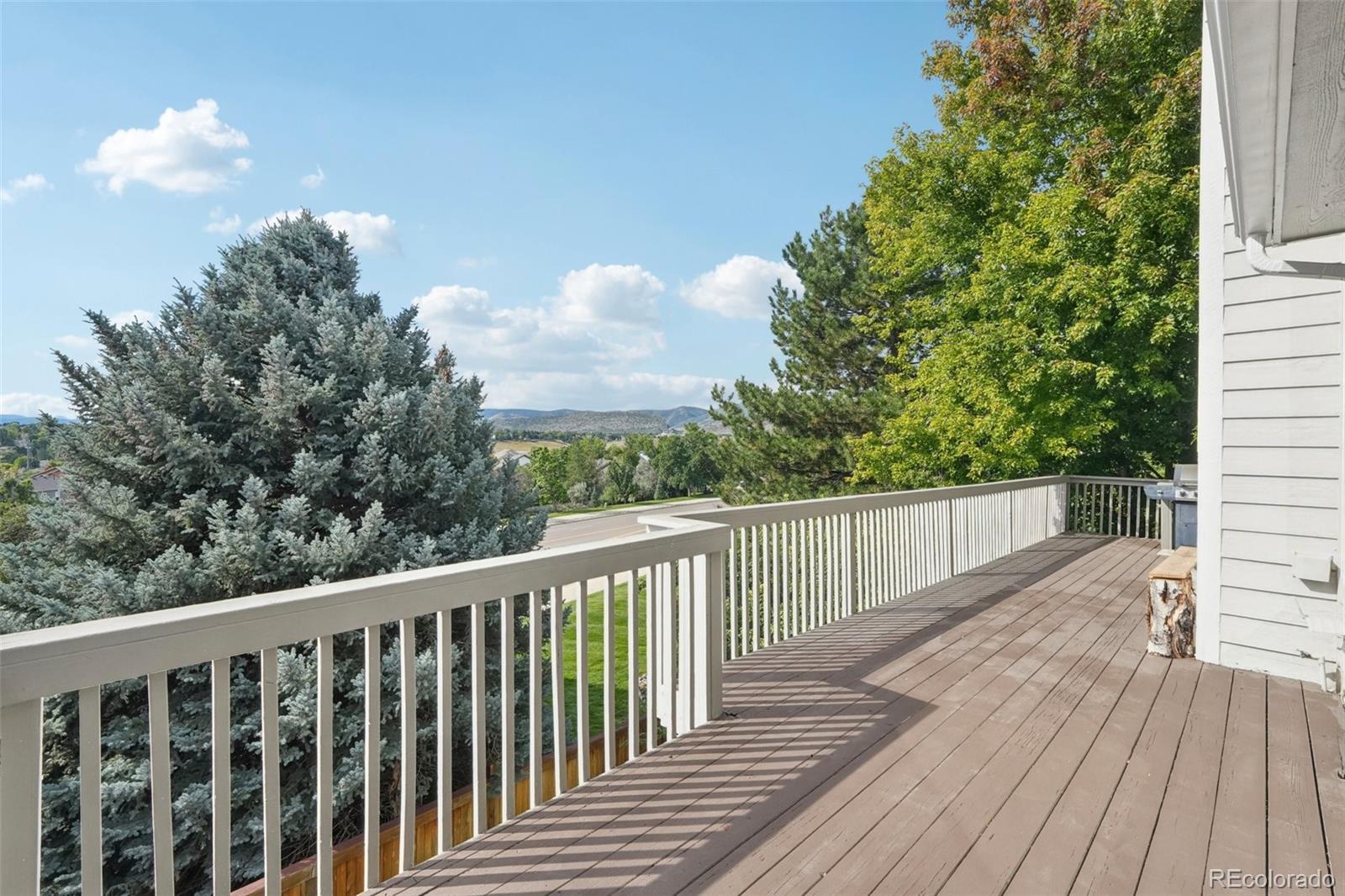 Price improvement with passive income opportunity! Don't miss the chance to own this 4 bedroom 3.5 bath home that has just been professionally renovated and offers expansive mountain and valley views! Convenient main-floor primary suite, custom WET SAUNA, and separate living quarters in the walk-out basement are unique/standout features of this house. A grand curved staircase entry leads you to abundant natural light, soaring vaulted ceilings, refinished hardwood floors, new carpet, designer ceiling fixtures and an open living room with cozy gas fireplace. Enjoy the primary suite with luxurious spa bath, modern walk-in shower, double vanities and large walk-in closet. You'll love the updated kitchen with natural stone countertops and ample storage space throughout. A newly refinished 2-story back deck spans the full width of the freshly repainted home with no neighbors directly behind! Upstairs, a catwalk leads to a loft area and two generously sized vaulted bedrooms connected by a jack-and-jill bathroom. Downstairs, escape into your own private exquisite cedar Finnish wet sauna with hand shower, dressing area, mini fridge, TV, venting, and many other thoughtful touches. Finished walk-out basement contains a full mother-in-law suite with second kitchen, newly renovated modern bathroom with Bluetooth speakers, dedicated laundry, 2 large bedrooms (5th bedroom is non-conforming), gas fireplace and its own private entrance. Perfect for family use or generating nearly $20,000 annually in passive income which increases your purchasing power! Low HOA fee of $300/yr. Located in a highly desirable neighborhood with top rated schools. Minutes from prime shopping, restaurants, Meadows Golf Club, Ridge Recreation Center. Access to major roads C470, I-70, but nicely tucked away and private. Don't miss this unique opportunity!