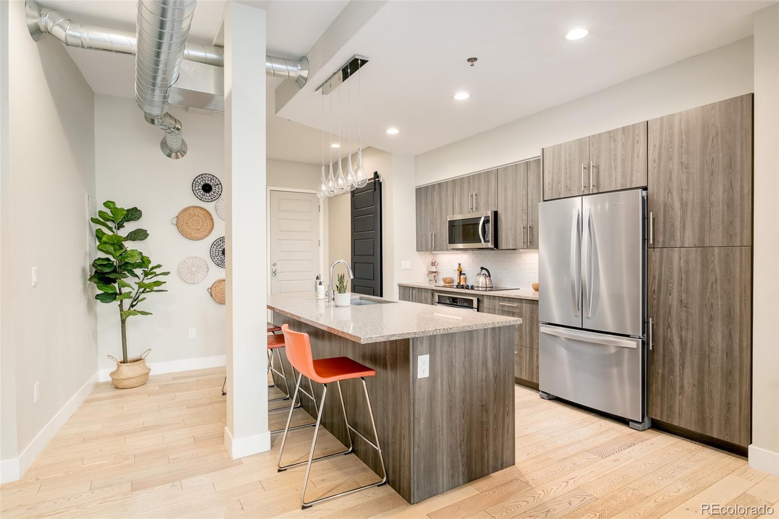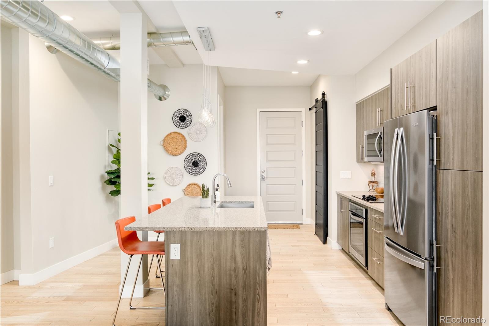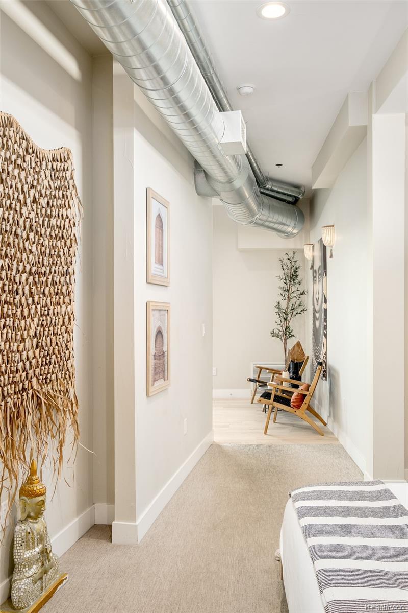 Experience modern sustainability at its finest in this exceptional Factory Flats residence, a LEED Platinum–level home designed with intention and crafted for year-round entertaining. Located in the heart of RiNo, this contemporary space blends eco-conscious features with refined design elements, offering a rare balance of efficiency, comfort, and style. Expansive windows fill the open floor plan with natural light, seamlessly connecting the interior to a covered patio with sweeping mountain views, an ideal setting for relaxing or hosting. The sleek kitchen features stainless steel appliances, quartz slab countertops, and minimalist, European-inspired cabinetry, creating a polished, functional centerpiece. The spacious bedroom features a generous walk-in closet, in-unit laundry, and a spa-like en-suite bath, elevating everyday living with ease and convenience. Throughout the home, low-VOC materials, high-efficiency HVAC, Low-E windows, AirPlus certification, WaterSense plumbing, and advanced insulation reflect a commitment to sustainable design without compromising aesthetics. Additional highlights include secure, heated, deeded parking and access to the building’s vibrant rooftop deck, a community favorite with panoramic views and artistic character. Local murals integrated throughout the building celebrate the creative spirit of the RiNo neighborhood, adding a unique sense of place. Perfectly positioned for urban connectivity, the home lies just 0.5 mi to the 38th & Blake RTD commuter rail station, 0.9 mi to Coors Field, and 0.7 mi to Curtis Park, placing downtown recreation, transit, and green space within easy reach. With RiNo’s top-tier galleries, dining, and boutiques moments away, this Factory Flats residence offers a rare blend of eco-conscious design, urban access, and refined liveability..