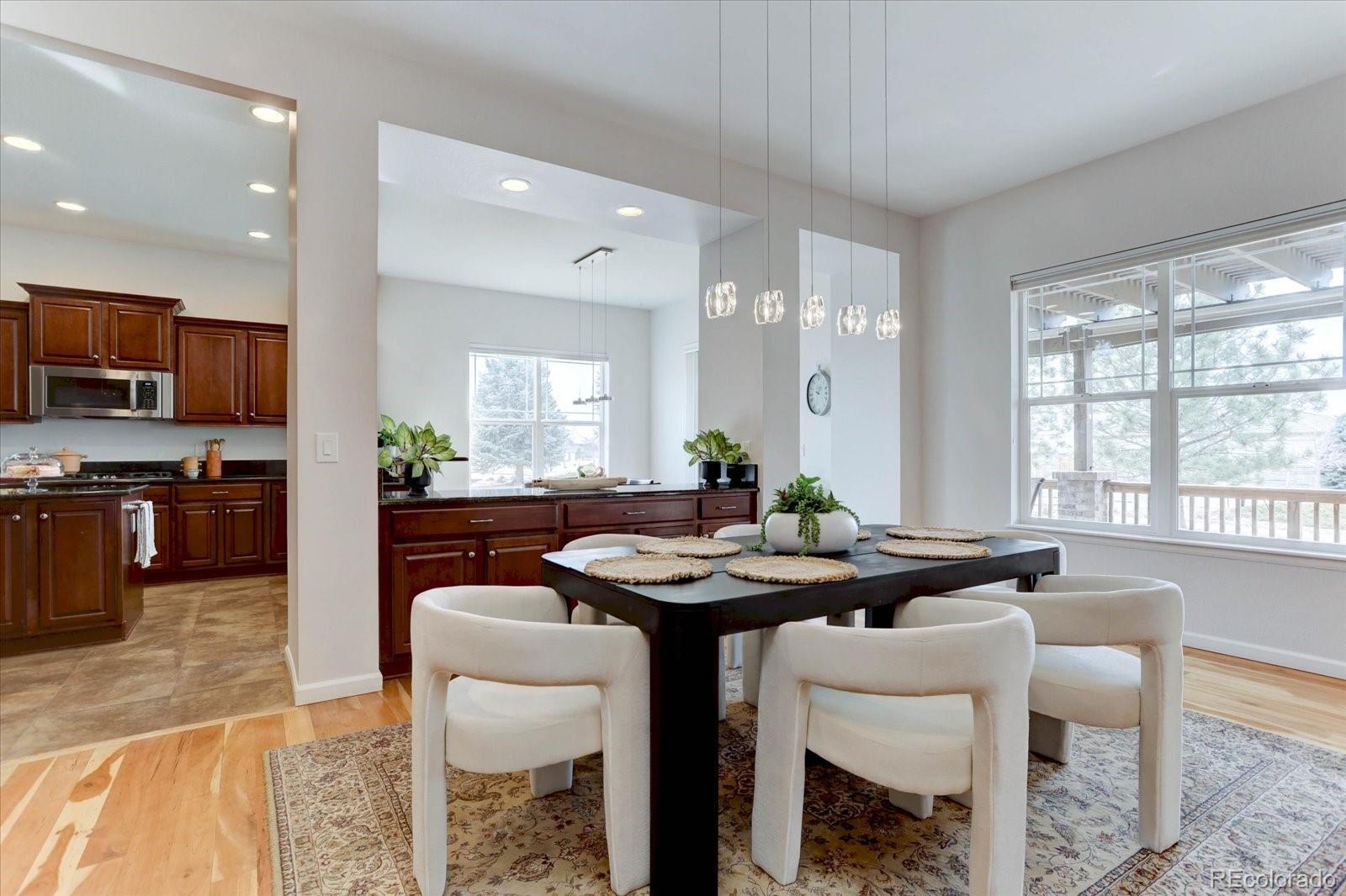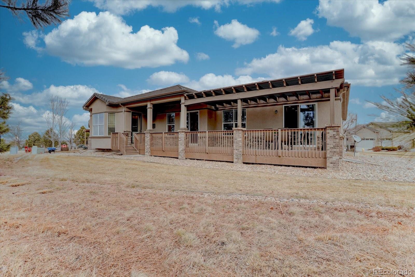 Great cul-de-sac location! Mountain views and a whole lot of comfortable living space! This Vail model Pulte home was designed with entertaining in mind. It has a gracious chef's kitchen with SS appliances, granite countertops and a large prep island with eat in area that exits to a large covered deck sheltered by large Austrian pine trees but still allowing for Rocky Mountain views! The open concept floor plan includes a dining area with alcove for your buffet or hutch, although there is a built in buffet area between kitchen and DR with additional cabinetry. Throughout the main living area is a beautiful hickory hardwood floor that offers a warm and inviting presence with an overhead ceiling fan and gas fireplace. You will love the large primary suite with access onto the covered porch, large windows and en suite with walk in closet. The guest BR on the main level is generously sized with an adjacent guest bath. The Living Room offers a spacious entertaining area with a gas fireplace, lots of natural light, beautiful flooring and open concept living. The downstairs leads to a comfortable sitting area/game or media room with a built in Murphy bed. There is another bedroom off this living space with it's own en suite with double sinks. As the basement is partially finished, there is an additional storage and utility area that could offer space for almost any hobby you might wish to engage in. This is a wonderful property in Anthem Ranch. Come for the views, but stay for the lifestyle!