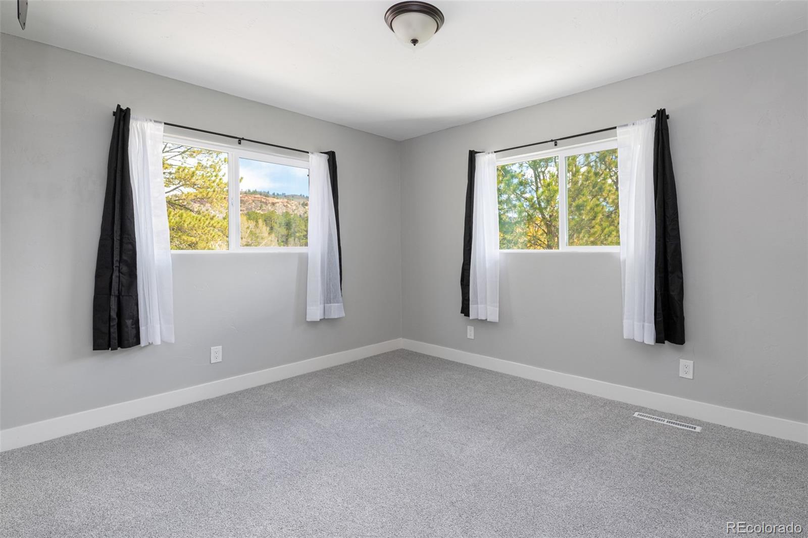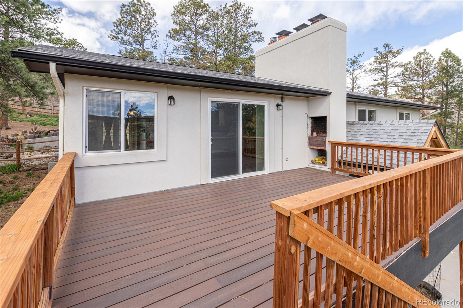 Tucked back in the trees and off the beaten path is this 2.50 acre gem. This home is one of the original homes in the Forest View Estates and Red Rocks Ranch Community. Monument Creek runs through the land and you can hear it flowing from the back deck while appreciating the majestic mountain views including Elephant Rock. The overall property provides a quiet and peaceful environment with a ton of wildlife sightings. Coming in from the front door and down the hallway, you'll notice a spacious mud room / laundry room. Garden level with lots of light to the living space, full bathroom and bedroom. This is considered a Raised Ranch floor plan. Kick off your shoes before heading up to the the main level. Real Hardwood floors throughout the Main Living room, dining room, Kitchen and also down the hallways to the second living room and 3 bedrooms. The kitchen is modern and has a clean style with beautiful glass back splash, natural light, easy to clean white cabinets, built in shelving, granite counter tops, two microwaves, an oven, stove top, pot filler, Kitchen Aid Appliances and a deep sink! The open living room has a beautiful built-in brick entertainment center, fireplace and french doors to the large deck which is great for indoor/outdoor living. The back yard is fenced off for your furry pets and includes a garden and a patio. Also an exterior door to the addition to the home, which adds a second living space with a gas fireplace and wet bar. This is the perfect entertaining spot, hobby room, TV room, kids area, gaming space or you'll find the best light to read a book in. The Primary Bedroom has large windows, new carpet, paint, a walk-in closet and a spacious 5 piece bathroom. Oversized 2 car garage, storage shed and room for many vehicles including and RV. No HOA. Perfectly located to Hwy 105 which gets you to 125 within minutes. Monument is a great place to live!