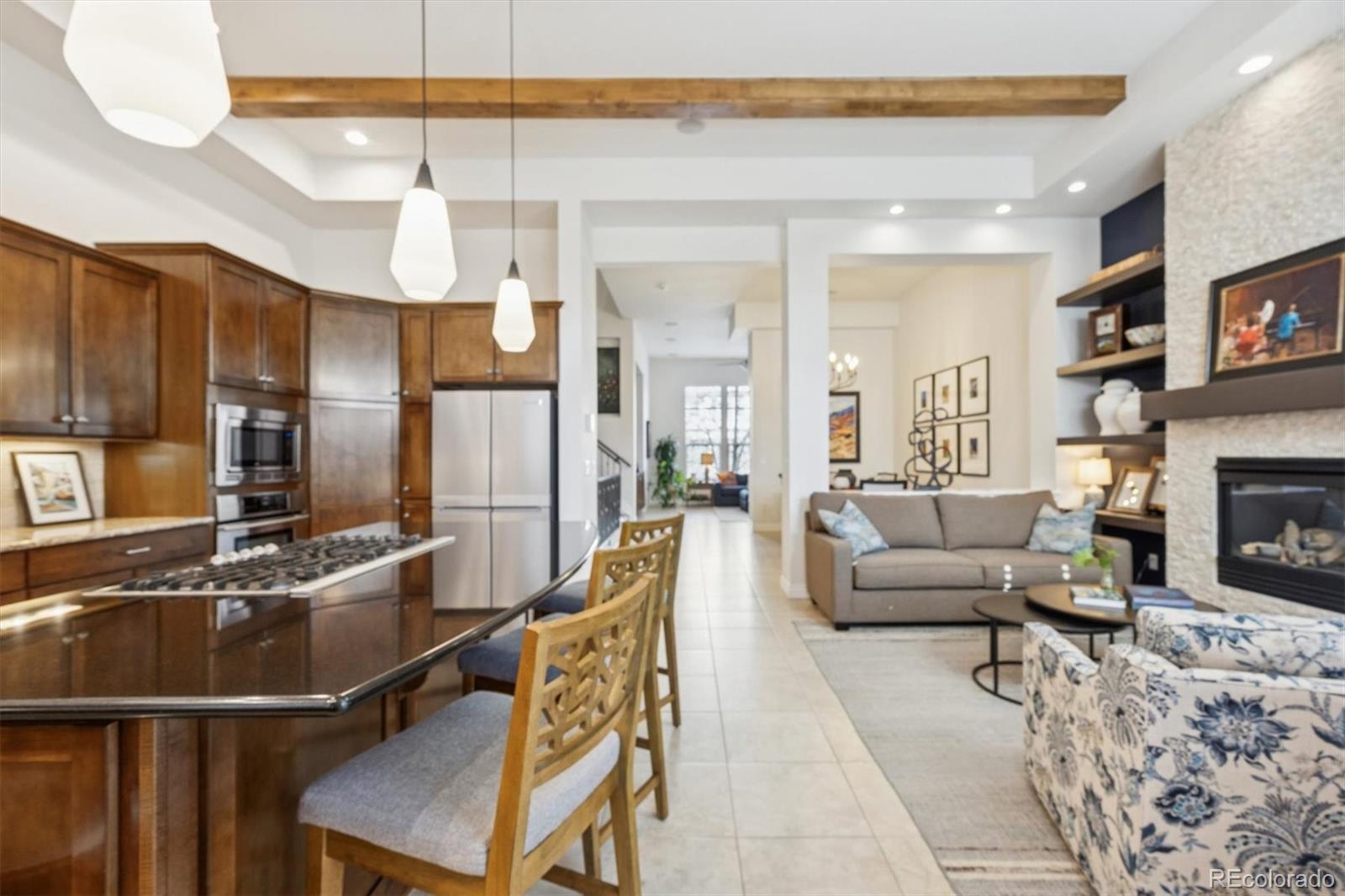 Experience elevated urban living at Vallagio in this stunning townhome designed for both style and comfort. High ceilings, large windows and an open, airy layout create a home that feels bright, expansive and effortlessly sophisticated. From the moment you enter you are greeted with quality finishes and thoughtfully designed spaces that blend elegance with everyday livability. The open-concept living and hearth rooms each feature their own fireplace - perfect for entertaining or cozy nights in. The kitchen will certainly inspire the chef in the house with rich cabinetry, premium appliances and generous slab granite counter space, making it ideal for hosting, cooking and gathering. Luxury meets comfort in the primary suite with it's own sitting area, a spa-inspired 5-piece bath and generously sized walk-in closet with custom built-ins. A second bedroom suite offers privacy and comfort for guests or family, while a main level study (or optional third bedroom) provides flexibility for working from home. High ceilings, modern finishes and custom window coverings throughout enhance the home's open, contemporary feel. Every space has been designed to maximize light, flow and functionality - making it as beautiful as it is livable. Step outside and enjoy a truly walkable lifestyle with restaurants and shops just moments away, light rail access down the block and easy access to I-25 taking you anywhere in the metro area.