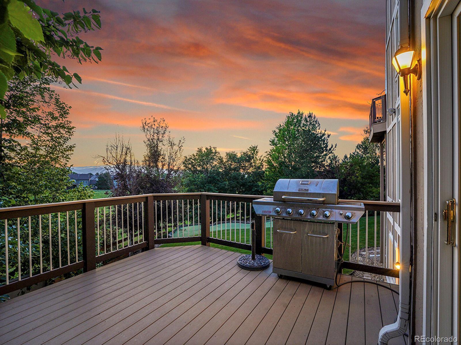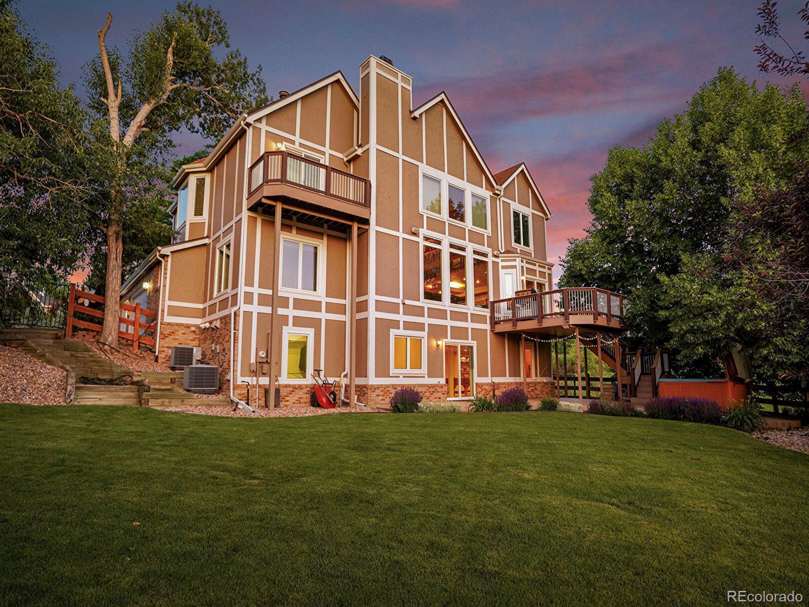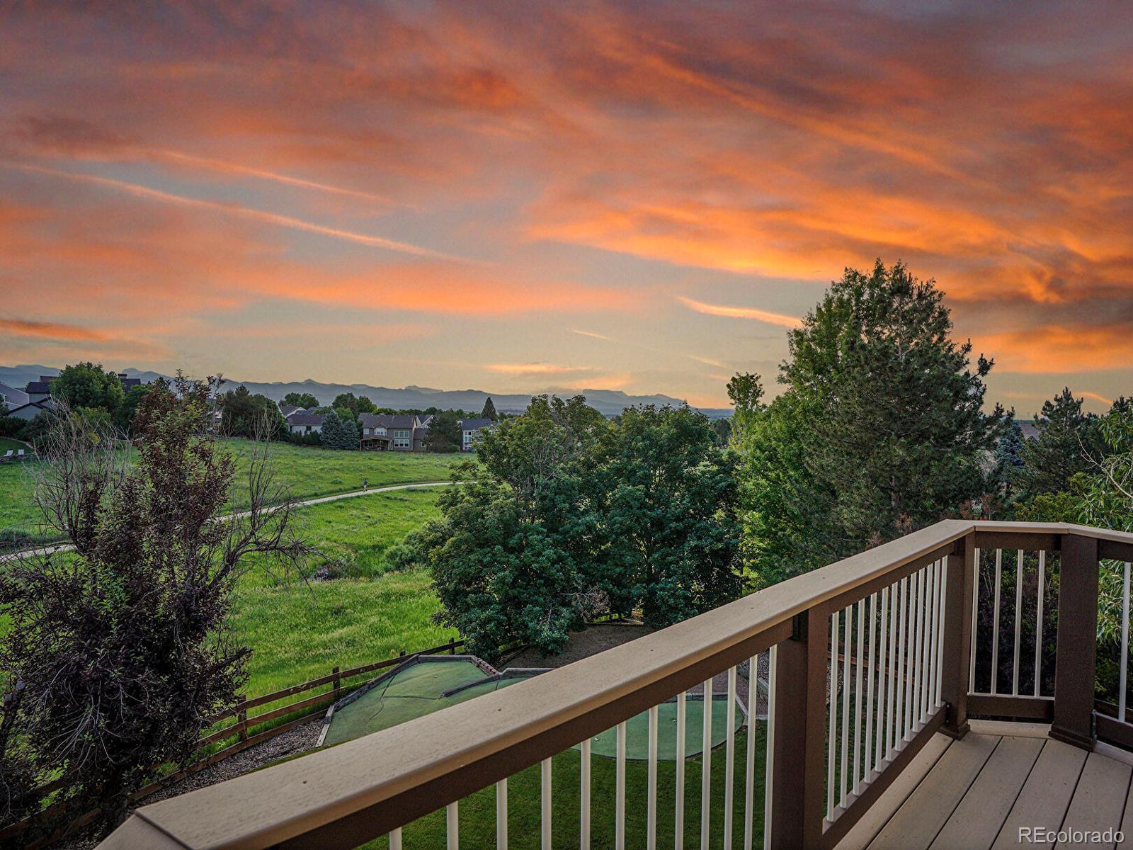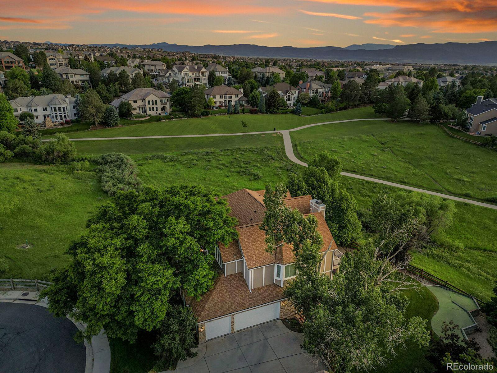 Opportunity awaits in Mansion Hills! Boasting an oversized lot with sweeping mountain views and a prime cul-de-sac location, this exceptional 5-bedroom, 5-bath home backing to open space is designed for elevated living. Enjoy a finished walkout basement, expansive mountain vistas around every corner, and a backyard made for relaxation. Inside, a dramatic foyer showcases soaring ceilings and an open layout that creates a welcoming atmosphere, flowing into the formal living and dining rooms with sunny bay windows. The kitchen offers a generous island, warm wood cabinetry, and extended peninsula that leads into open living spaces, while a casual eat-in dining area is marked by sliding glass doors leading to the back deck. Enjoy cozy weekends in front of the fireplace in the family room, framed by floor-to-ceiling greenbelt views. A nearby half bath, finished laundry, and dedicated office complete the main level. Upstairs, the primary suite features a stone-surround gas fireplace, seating area, and private balcony with stunning mountain views. The adjacent five-piece en suite boasts a soaking tub, dual-headed shower, and expansive walk-in closet. The second upper-level suite includes a bay window, en suite, and walk-in closet, while 2 additional bedrooms share a Jack-and-Jill bath. The finished walk-out basement offers flexibility for multigenerational living, featuring a private bedroom with a spacious walk-in closet, nearby ¾ bath, and a sprawling rec room with wet bar. The exemplary backyard is made for lively gatherings or unwinding under the stars, boasting an upper deck overlooking Kistler Trail, lower patio with hot tub, putting green and firepit area. Generous oversized 3-car garage. Enjoy access to miles of trails, Southridge Rec Center, Backcountry Wilderness Area. Located under 15 minutes to Park Meadows Mall and Chatfield State Park, with easy access to the foothills via C-470 for endless recreation.