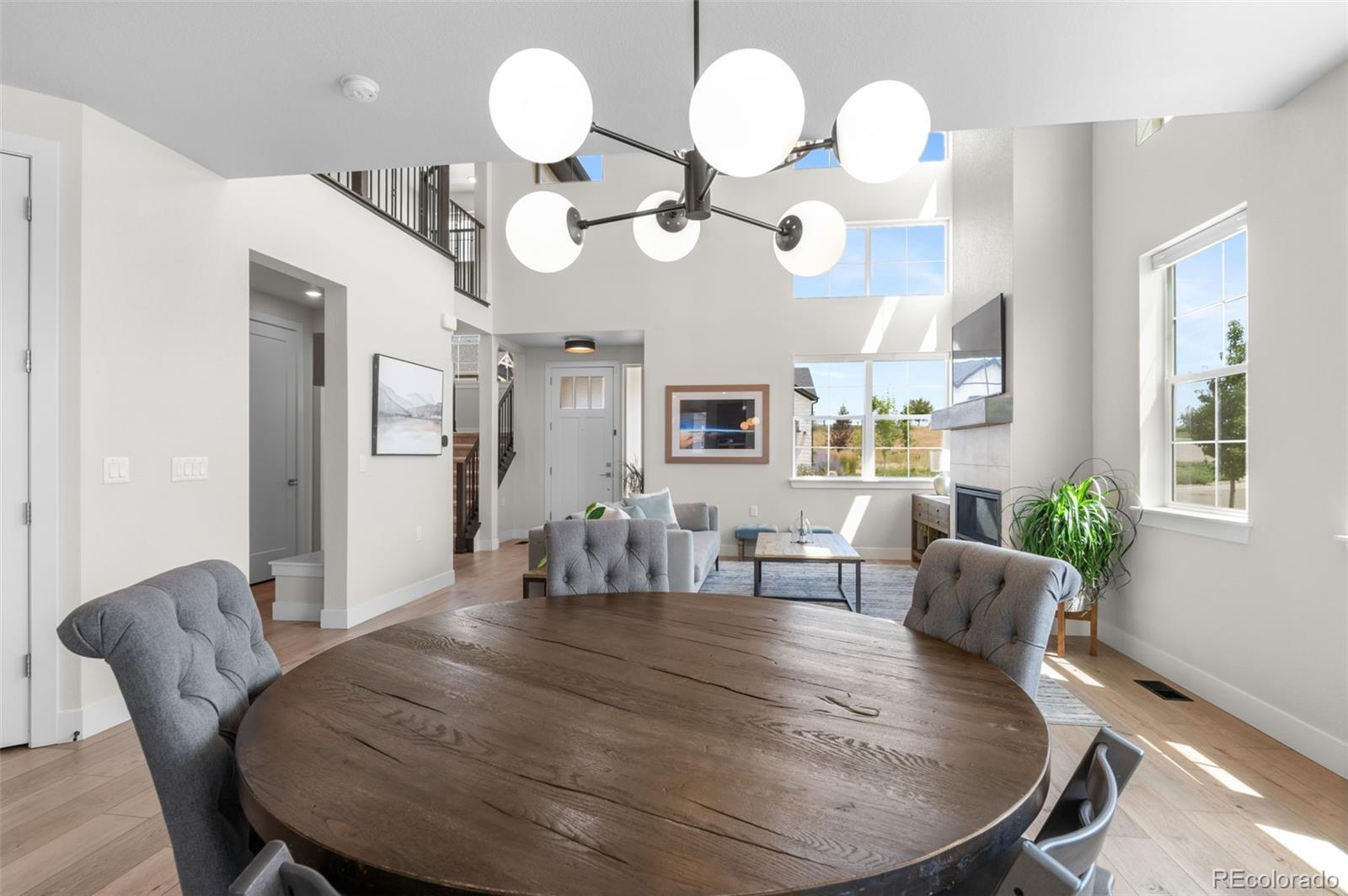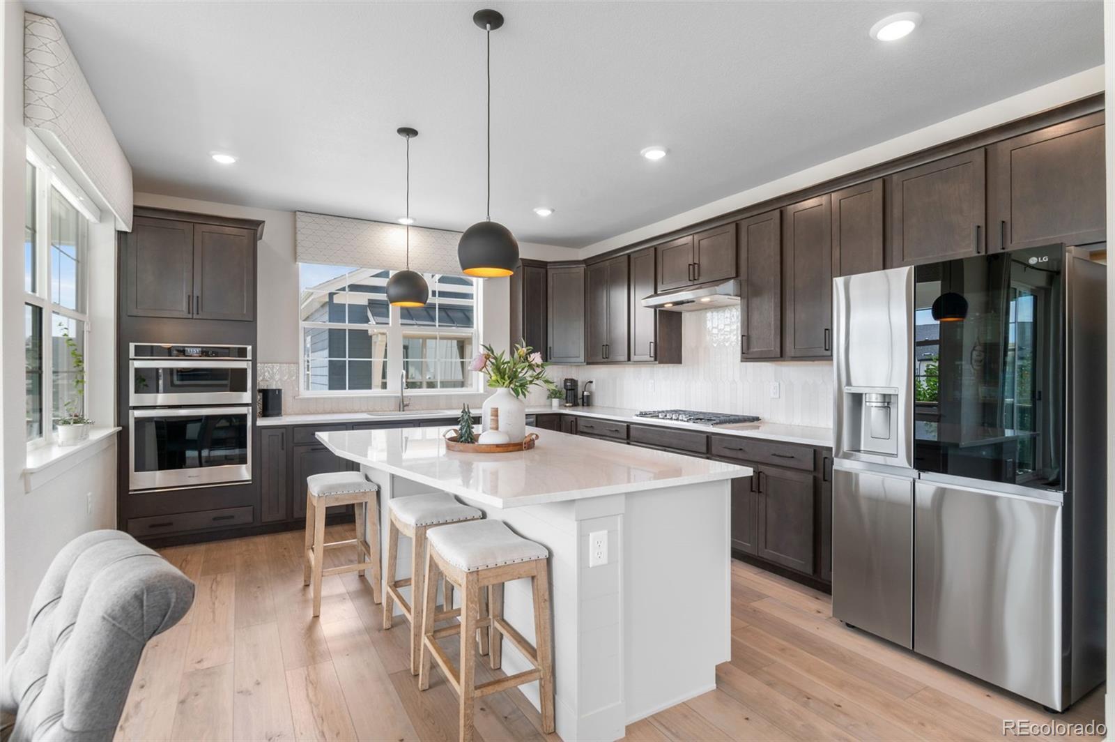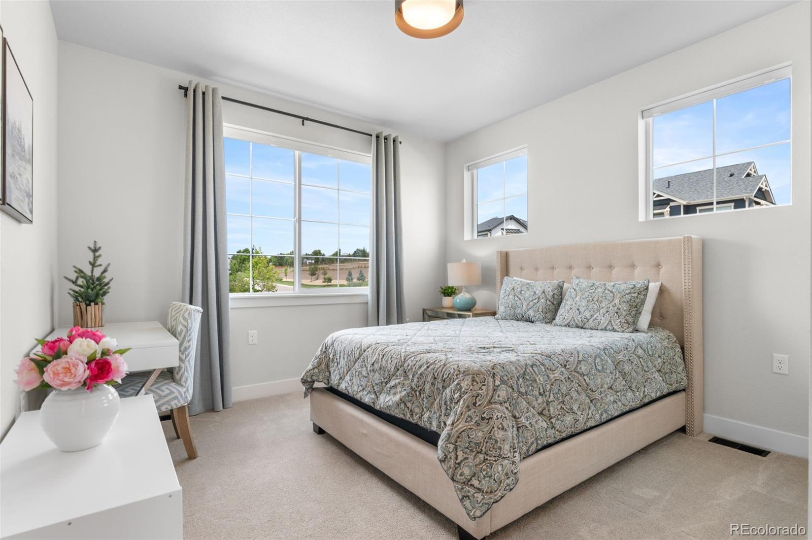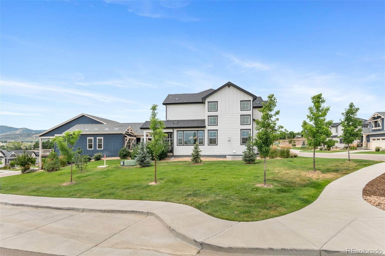 Modern Farmhouse with designer upgrades in Silver Leaf blends contemporary design with low-maintenance living. As the former model home, this property showcases premium upgrades and thoughtful finishes throughout. From the striking black-and-white elevation to the double-height ceilings and abundant natural light, every detail was crafted to impress. The floor plan may be the perfect 2-story plan. A main-floor bedroom with a walk-in closet offers convenience and flexibility, whether for guests, a home office, or generational living. Spacious Great Room with vaulted ceilings and a large Chandelier. Open-concept main living area with the kitchen open to the dining and living spaces. The heart of the home is the open-concept kitchen, complete with 42” upgraded cabinets, Quartz 3cm counters, enhanced tile, a ship-lap wrapped light grey island, and a walk-in pantry. The 2nd floor features a catwalk open to the vaulted Great Room, separating the spacious primary suite from two other bedrooms with a separate full bath. The primary suite shows a designer accent wall, an en-suite bathroom, and a spacious walk-in closet. The finished basement level adds even more versatility with 2 bedrooms, a full bath, and expansive recreation room—perfect for hosting family and friends. The 2nd bedroom could be used as a flex space, a dedicated office, or workout room. Enjoy seamless indoor-outdoor living with a covered patio. Silver Leaf is a Littleton gem. The community concept features modern, active living with low-maintenance yards and open lawn spaces. Lawn care and snow removal are included. Situated just minutes from Foothills Recreation Center, scenic trails, bike paths, and downtown Littleton, this home offers the ideal blend of low-maintenance living and vibrant community access. Don’t miss your chance to own this exceptional, move-in-ready home in one of the area’s most desirable neighborhoods.