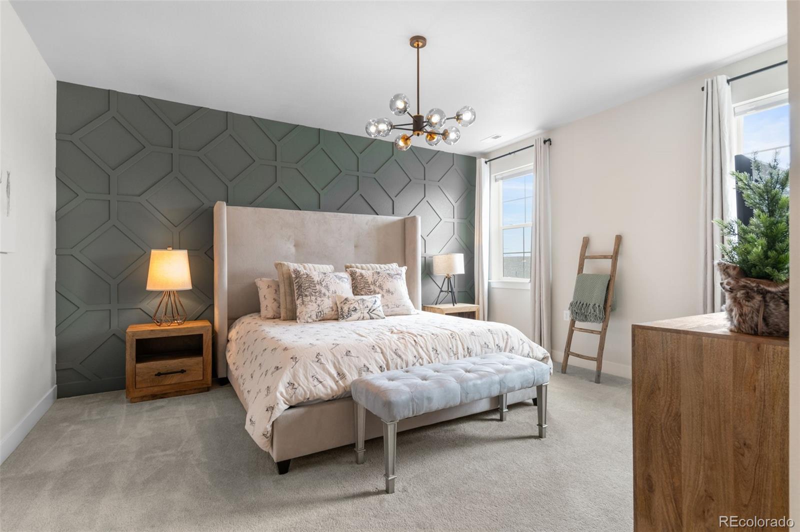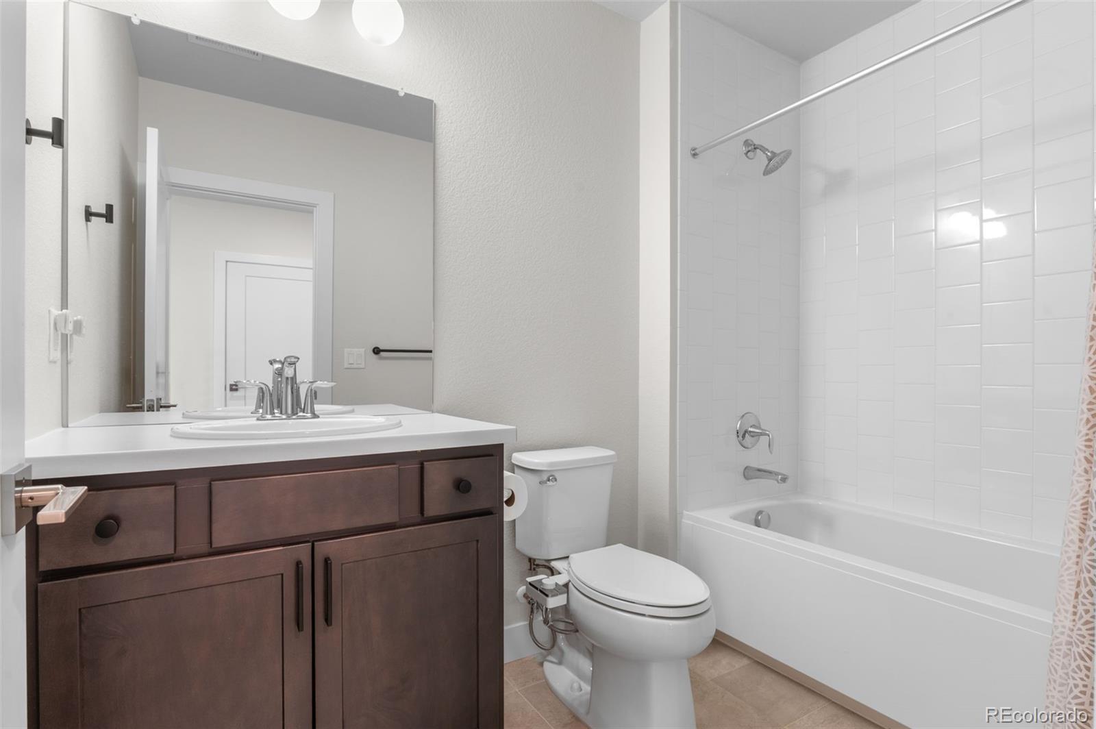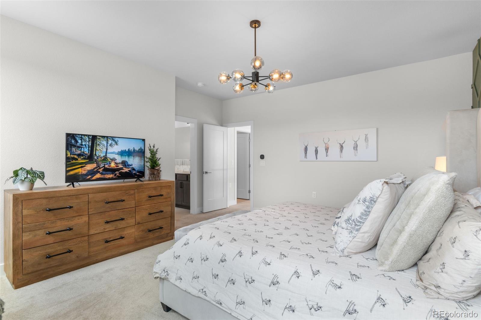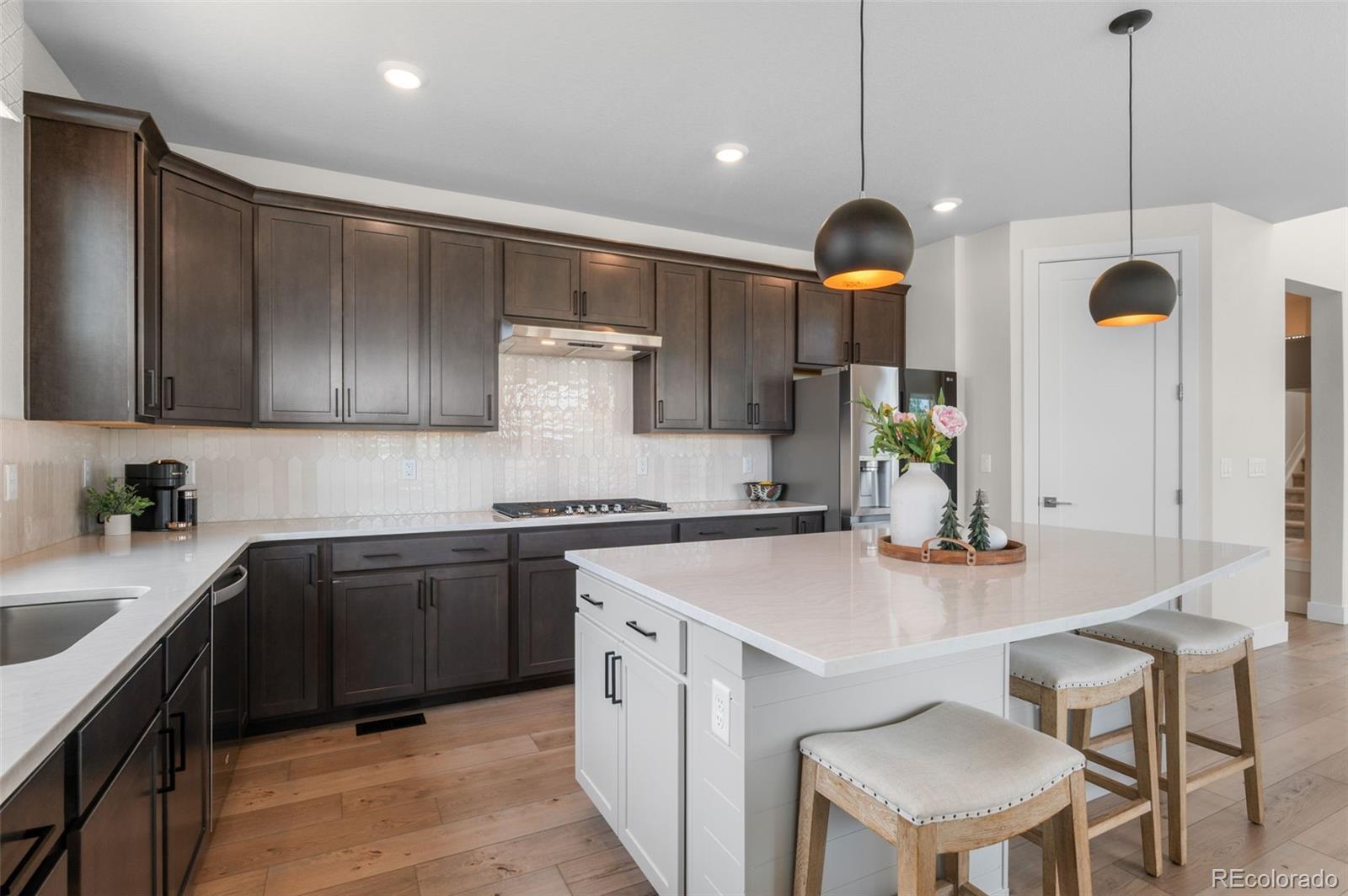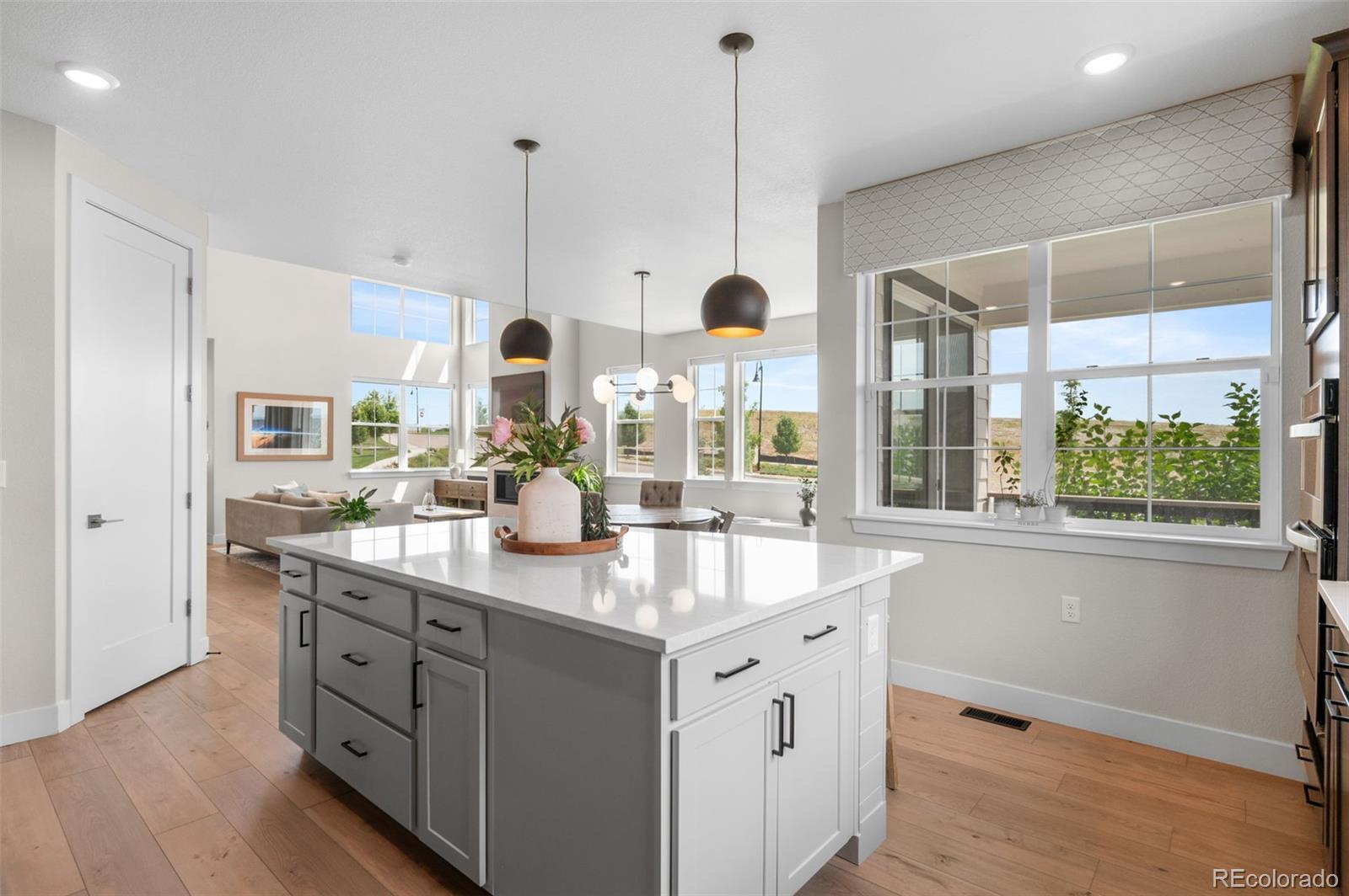 Modern Farmhouse with designer upgrades in Silver Leaf blends contemporary design with low-maintenance living. As the former model home, this property showcases premium upgrades and thoughtful finishes throughout. From the striking black-and-white elevation to the double-height ceilings and abundant natural light, every detail was crafted to impress. The floor plan may be the perfect 2-story plan. A main-floor bedroom with a walk-in closet offers convenience and flexibility, whether for guests, a home office, or generational living. Spacious Great Room with vaulted ceilings and a large Chandelier. Open-concept main living area with the kitchen open to the dining and living spaces. The heart of the home is the open-concept kitchen, complete with 42” upgraded cabinets, Quartz 3cm counters, enhanced tile, a ship-lap wrapped light grey island, and a walk-in pantry. The 2nd floor features a catwalk open to the vaulted Great Room, separating the spacious primary suite from two other bedrooms with a separate full bath. The primary suite shows a designer accent wall, an en-suite bathroom, and a spacious walk-in closet. The finished basement level adds even more versatility with 2 bedrooms, a full bath, and expansive recreation room—perfect for hosting family and friends. The 2nd bedroom could be used as a flex space, a dedicated office, or workout room. Enjoy seamless indoor-outdoor living with a covered patio. Silver Leaf is a Littleton gem. The community concept features modern, active living with low-maintenance yards and open lawn spaces. Lawn care and snow removal are included. Situated just minutes from Foothills Recreation Center, scenic trails, bike paths, and downtown Littleton, this home offers the ideal blend of low-maintenance living and vibrant community access. Don’t miss your chance to own this exceptional, move-in-ready home in one of the area’s most desirable neighborhoods.