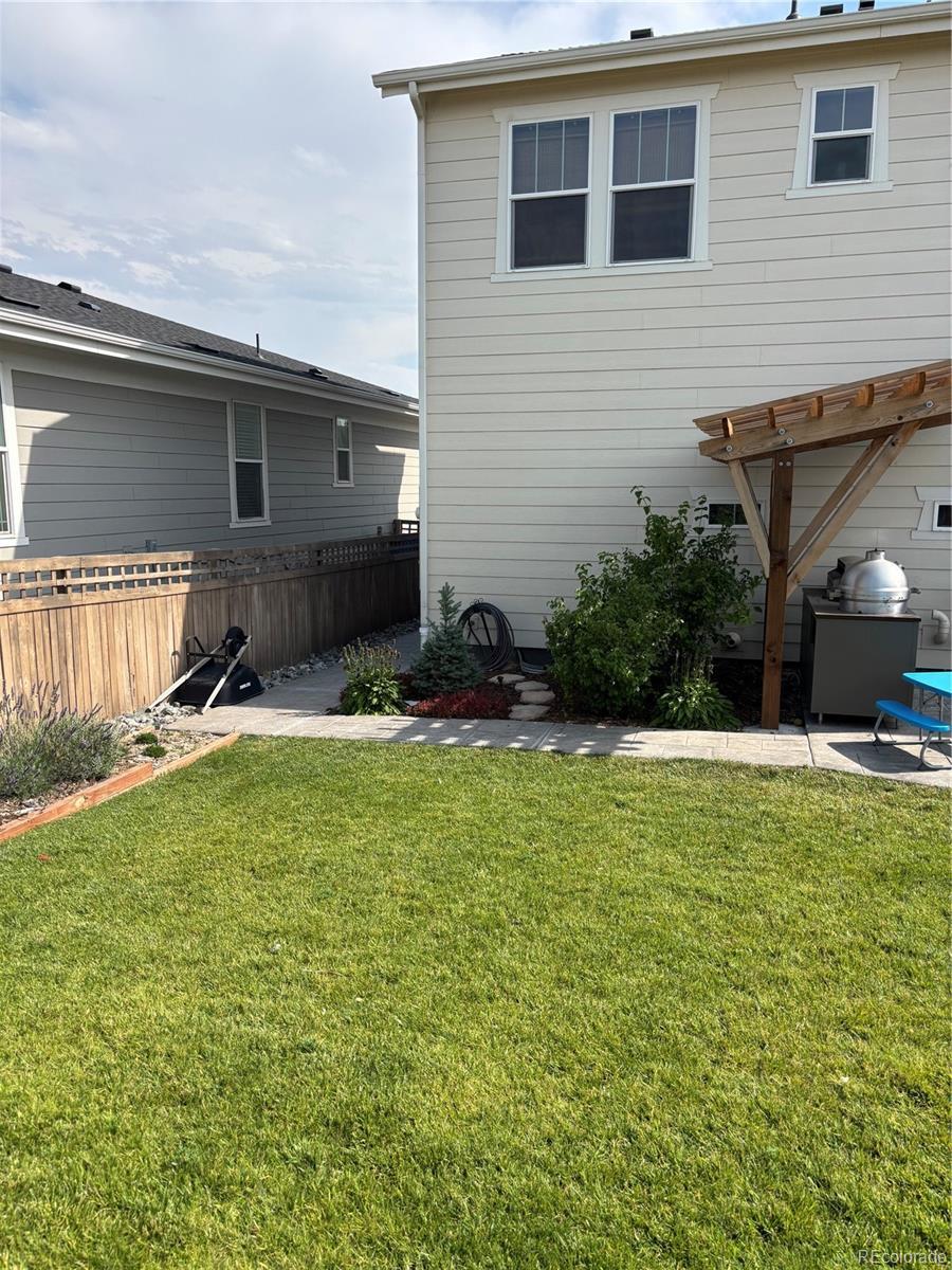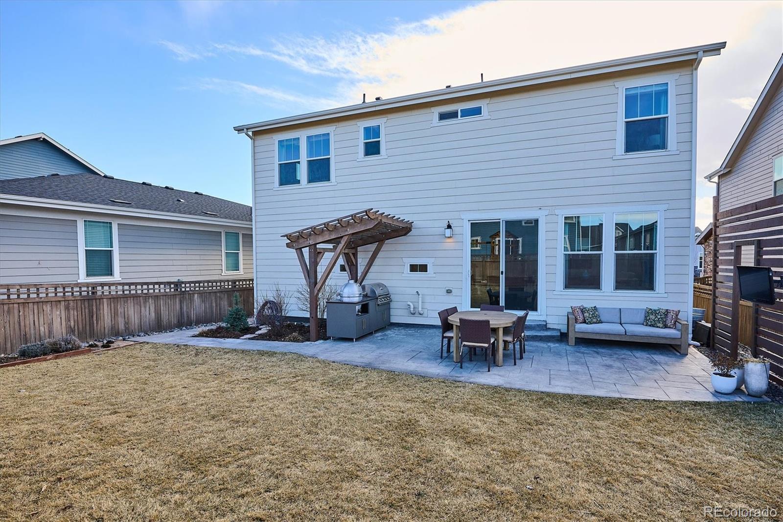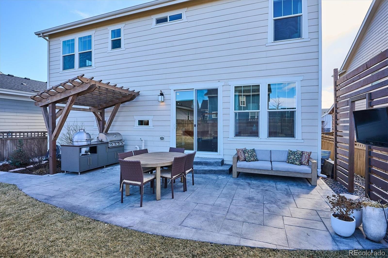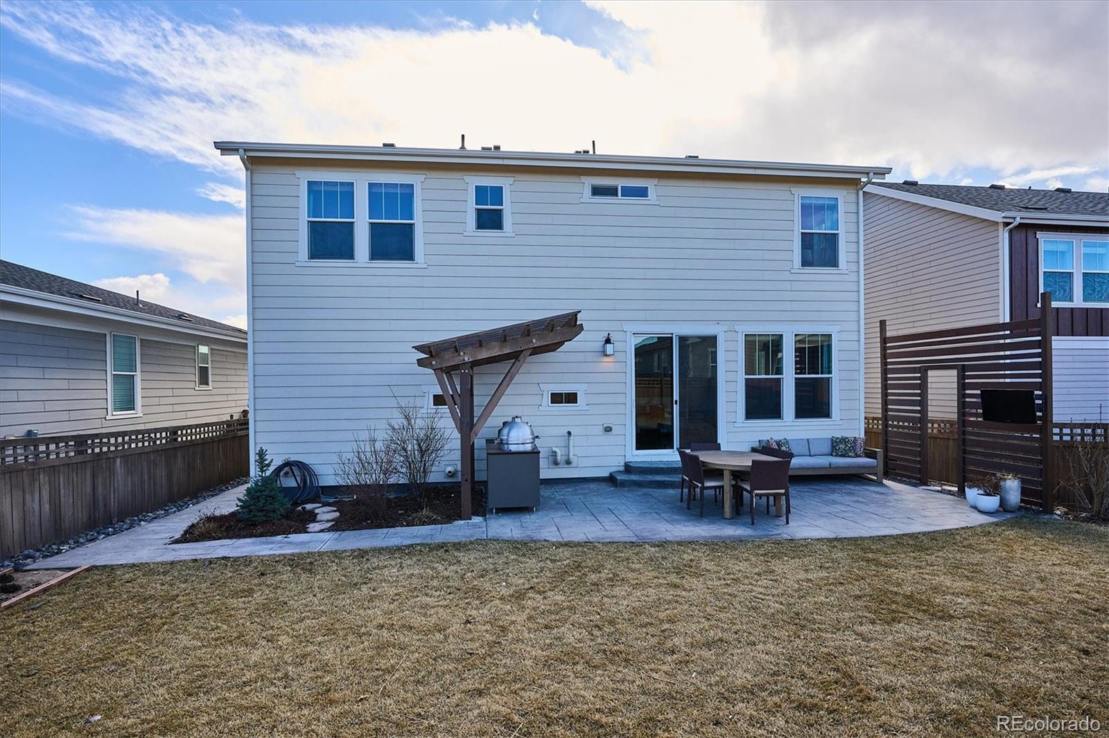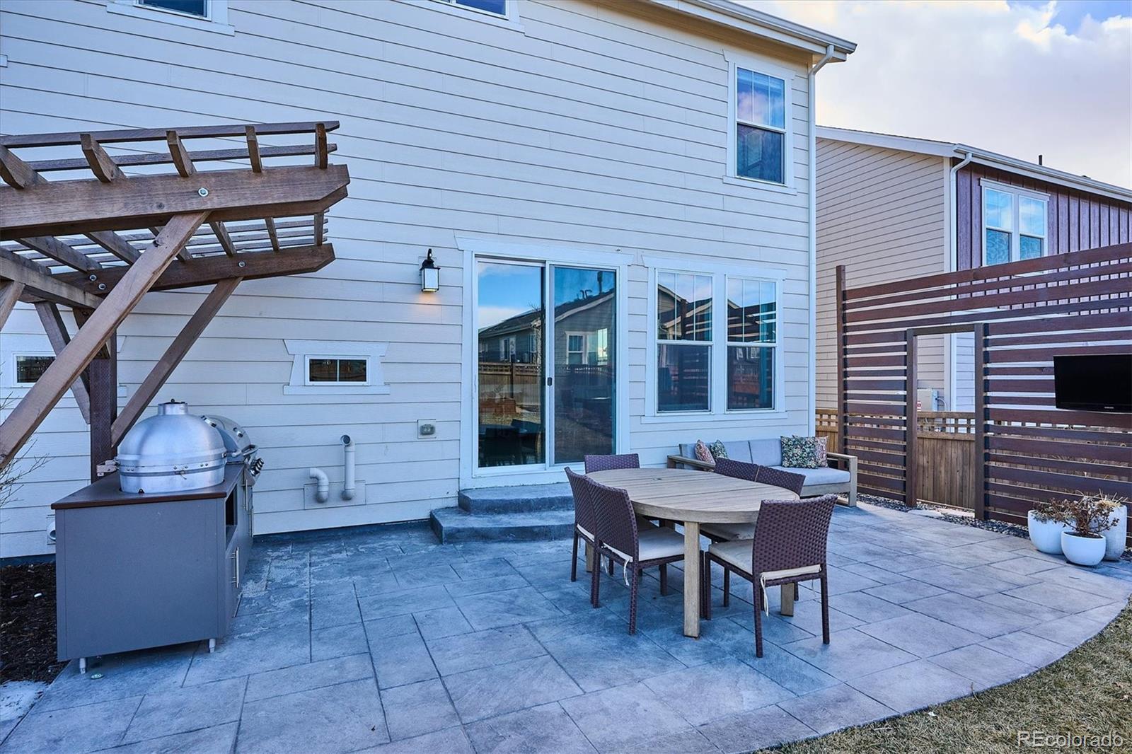 Welcome to this beautifully designed south-facing home in the vibrant Painted Prairie community, where modern style and thoughtful details come together splendidly. With 3 bedrooms, a spacious loft, & a private enclosed main-floor office, this home offers flexibility for the way you live, work, & gather. From the moment you step inside, the warmth of hardwood floors and the open, airy layout invite you in. The bright great room flows seamlessly into the kitchen, creating a natural gathering space filled with light & connection, perfect for quiet mornings, lively dinners, or entertaining. The custom kitchen serves as the heart of the home, featuring quartz countertops, a chic tile backsplash, extended cabinetry, & a generous walk-in pantry designed for both beauty and function. Upstairs, the loft offers a additional living space ideal for relaxing, working, or play, complete with custom cabinetry for added storage & a gorgeous wood detailed wall. Down the hall you’ll find two sunny secondary bedrooms, a full bath, and the convenient 2nd floor laundry room that adds ease to daily routines. The primary suite is a true retreat, highlighted by custom woodwork paneling, a spa-inspired bathroom, and a beautifully finished custom closet designed to simplify & elevate. The full unfinished basement with 9-foot ceilings presents endless possibilities. Outdoor living is just as inviting, with full professional landscaping, raised garden beds w/irrigation system, stamped concrete patio & wraparound walkway, pergola, sun shade, TV & outdoor kitchen complete with smoker and grill, ideal for enjoying Colorado evenings and gathering under the open sky. A new roof installed in 2024 and owned solar panels (to be paid off with an acceptable offer) provide both peace of mind and long-term efficiency. Addt'l features include fiber internet wiring, scuff-defense paint, custom window coverings throughout, ceiling fans in all bedrooms, keyless entry, added garage storage & bike hangars.