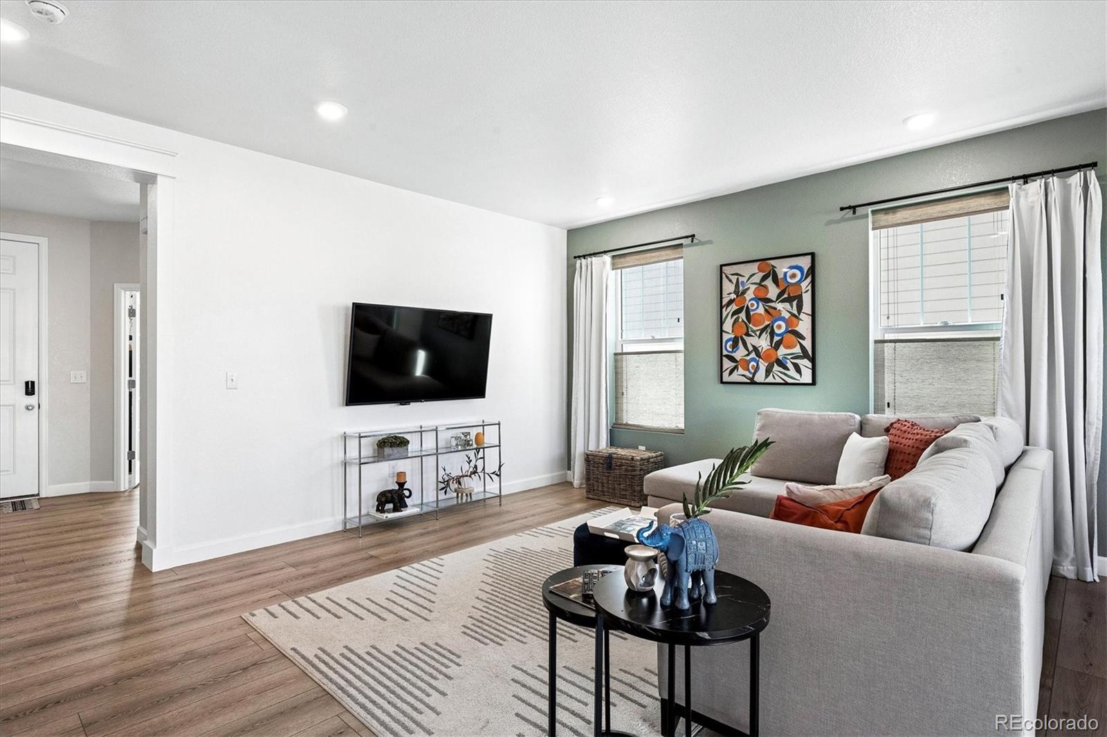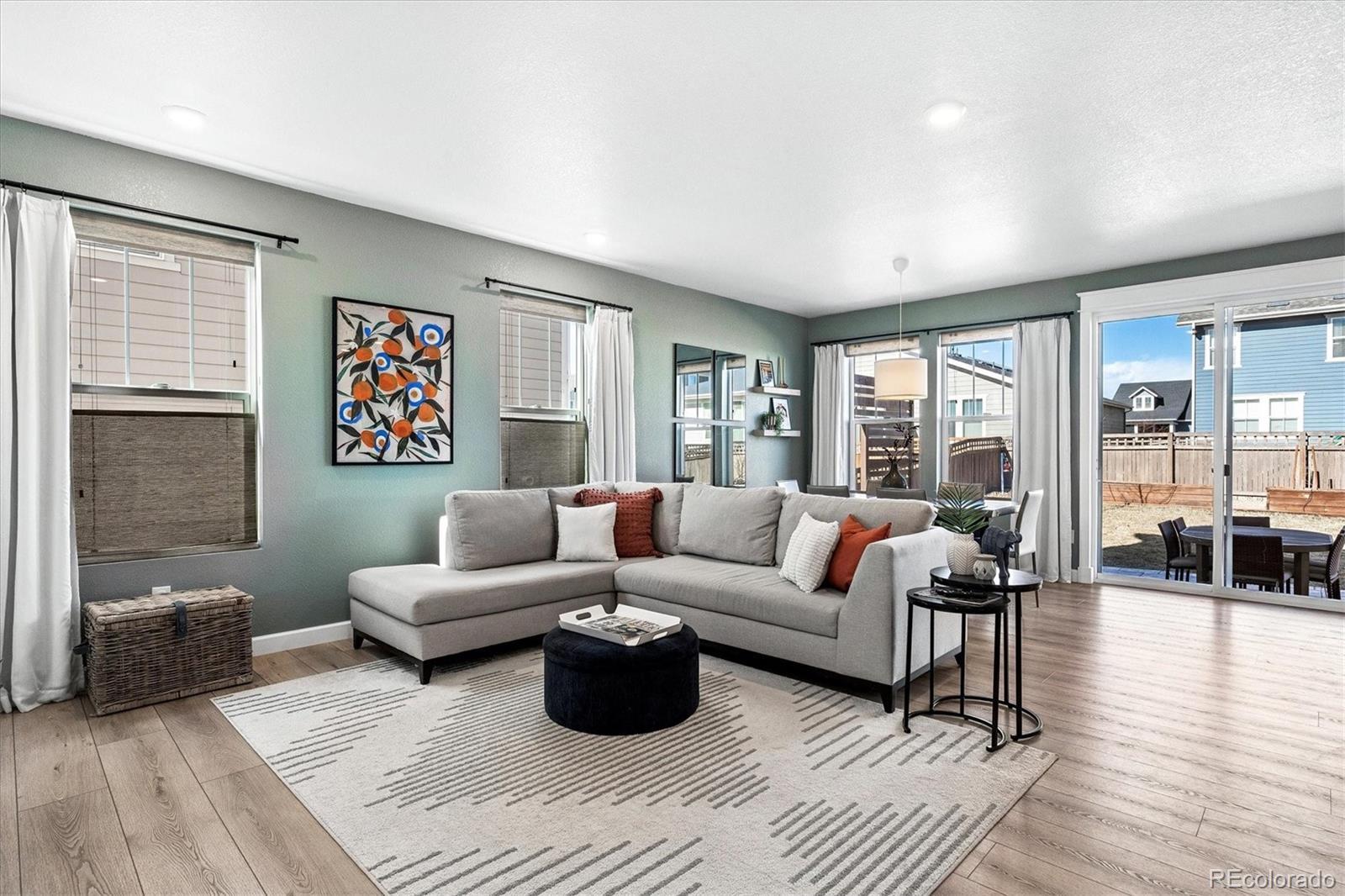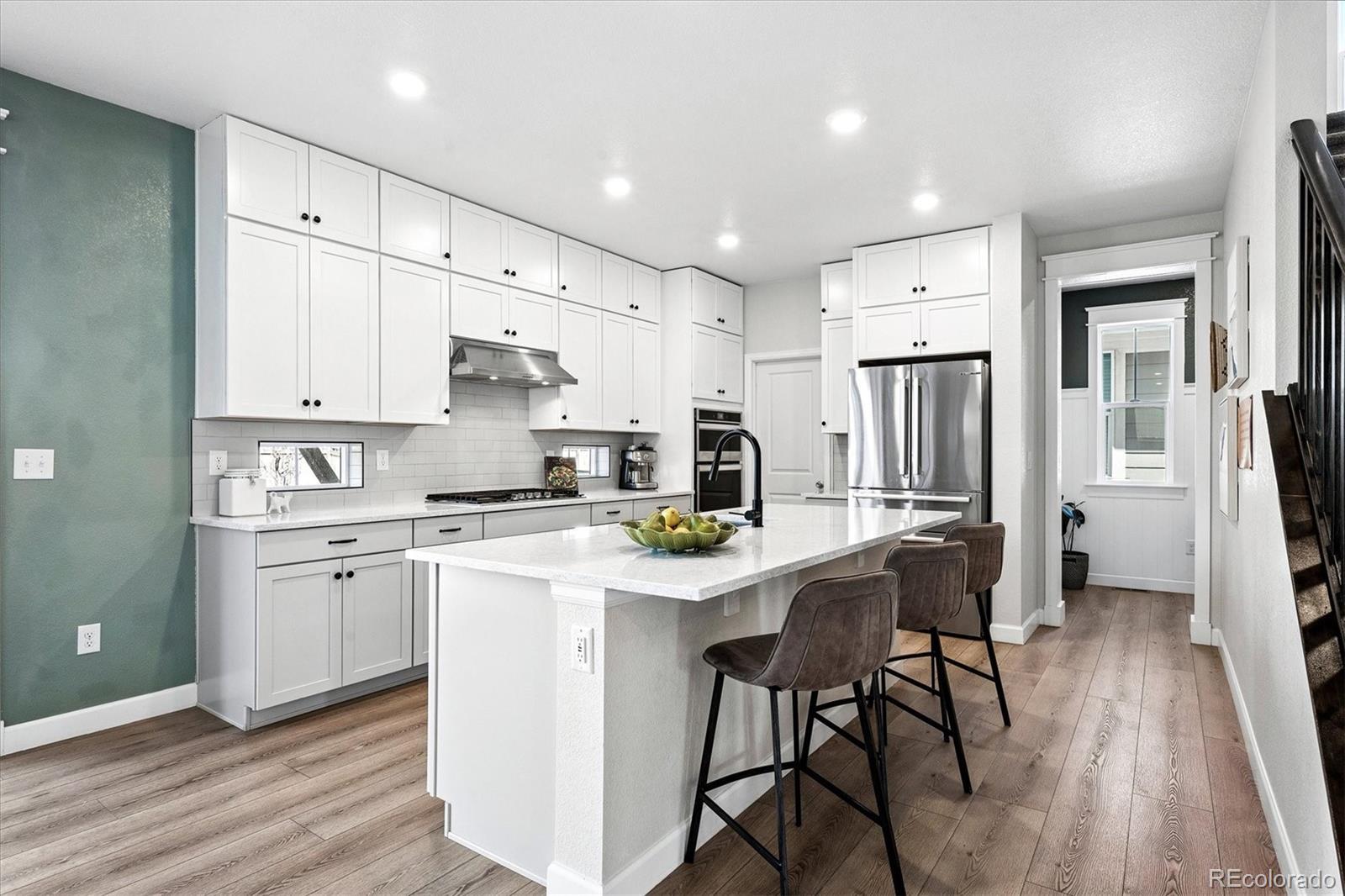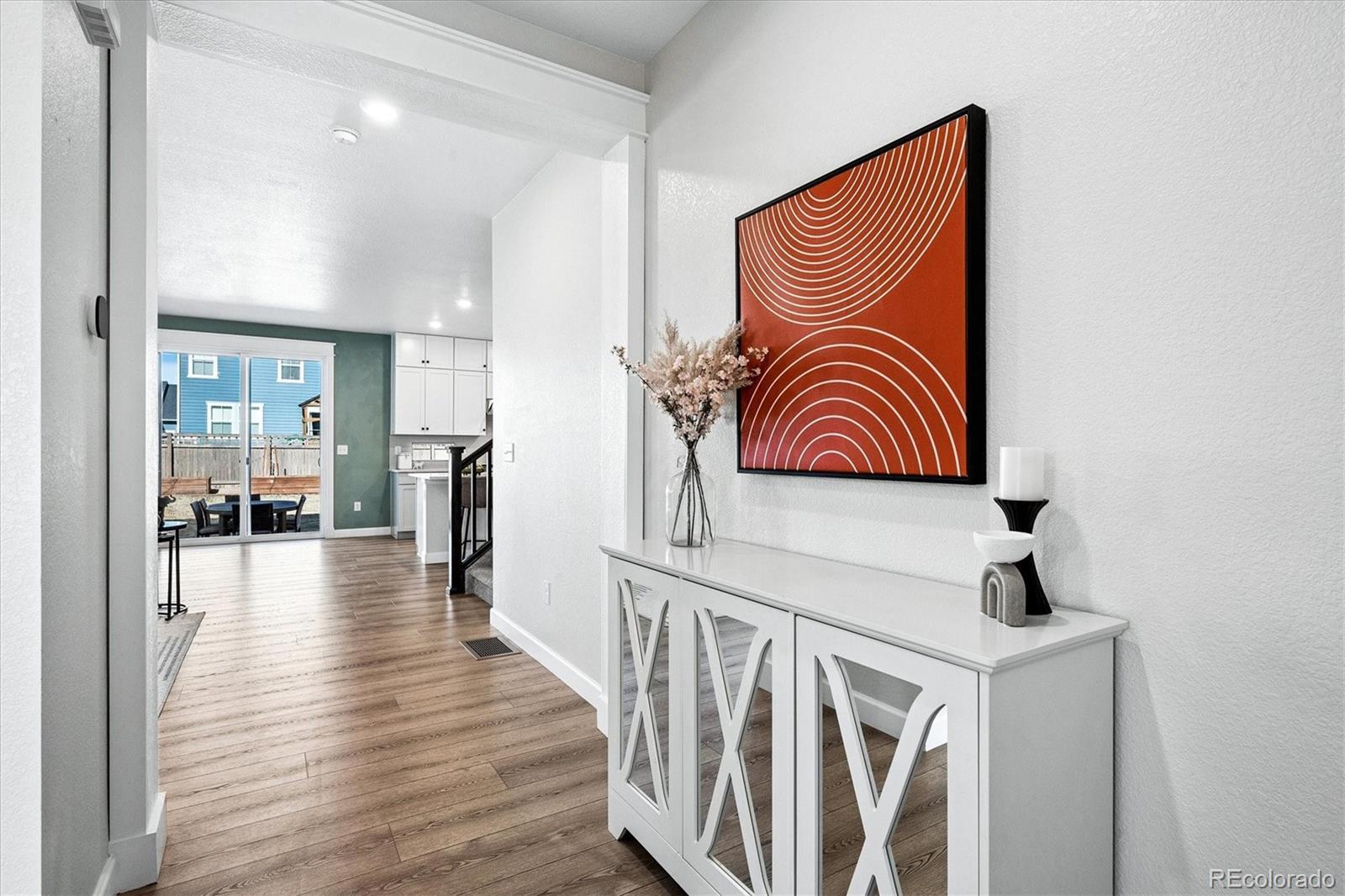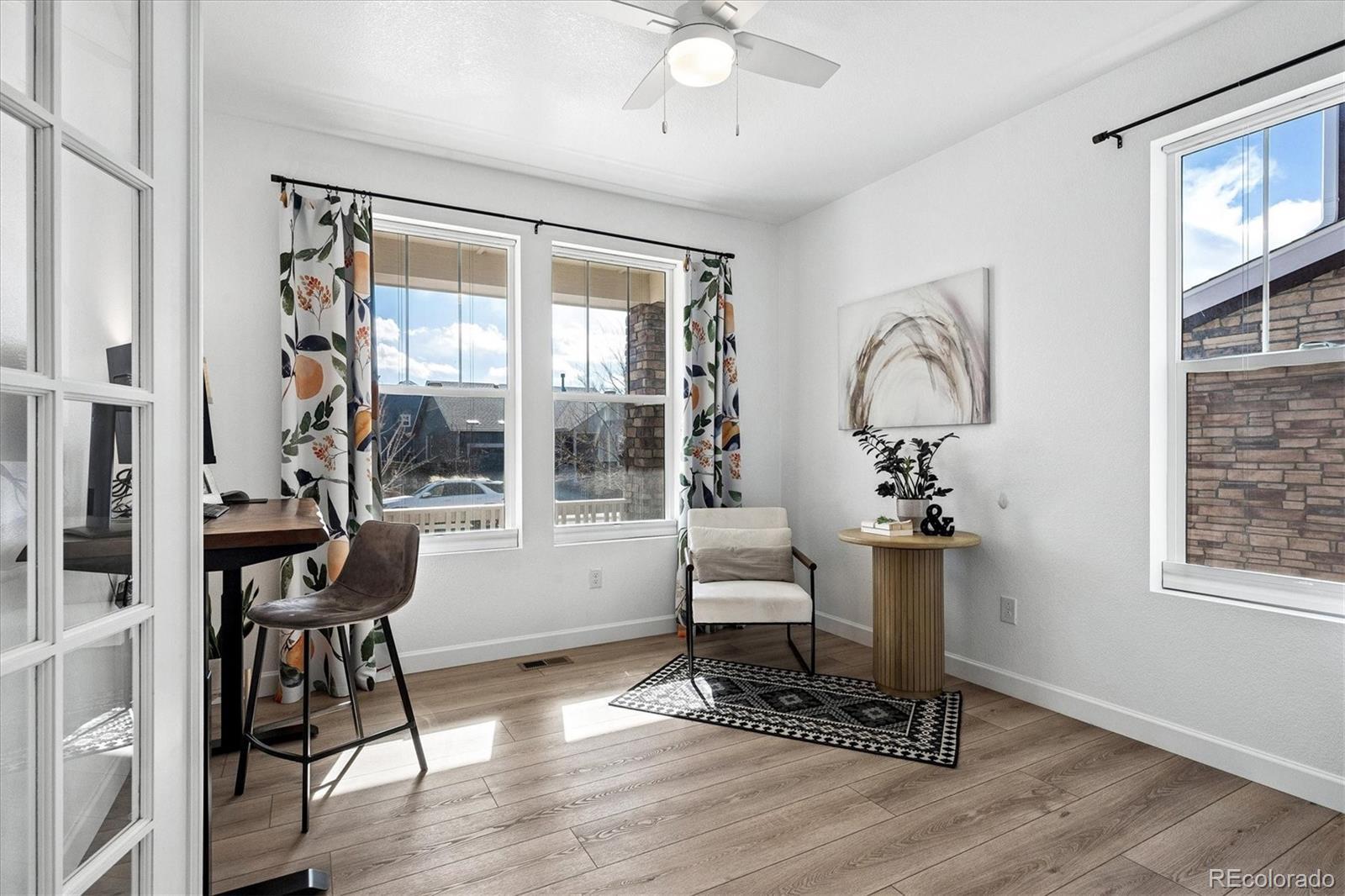 Welcome to this beautifully designed south-facing home in the vibrant Painted Prairie community, where modern style and thoughtful details come together splendidly. With 3 bedrooms, a spacious loft, & a private enclosed main-floor office, this home offers flexibility for the way you live, work, & gather. From the moment you step inside, the warmth of hardwood floors and the open, airy layout invite you in. The bright great room flows seamlessly into the kitchen, creating a natural gathering space filled with light & connection, perfect for quiet mornings, lively dinners, or entertaining. The custom kitchen serves as the heart of the home, featuring quartz countertops, a chic tile backsplash, extended cabinetry, & a generous walk-in pantry designed for both beauty and function. Upstairs, the loft offers a additional living space ideal for relaxing, working, or play, complete with custom cabinetry for added storage & a gorgeous wood detailed wall. Down the hall you’ll find two sunny secondary bedrooms, a full bath, and the convenient 2nd floor laundry room that adds ease to daily routines. The primary suite is a true retreat, highlighted by custom woodwork paneling, a spa-inspired bathroom, and a beautifully finished custom closet designed to simplify & elevate. The full unfinished basement with 9-foot ceilings presents endless possibilities. Outdoor living is just as inviting, with full professional landscaping, raised garden beds w/irrigation system, stamped concrete patio & wraparound walkway, pergola, sun shade, TV & outdoor kitchen complete with smoker and grill, ideal for enjoying Colorado evenings and gathering under the open sky. A new roof installed in 2024 and owned solar panels (to be paid off with an acceptable offer) provide both peace of mind and long-term efficiency. Addt'l features include fiber internet wiring, scuff-defense paint, custom window coverings throughout, ceiling fans in all bedrooms, keyless entry, added garage storage & bike hangars.