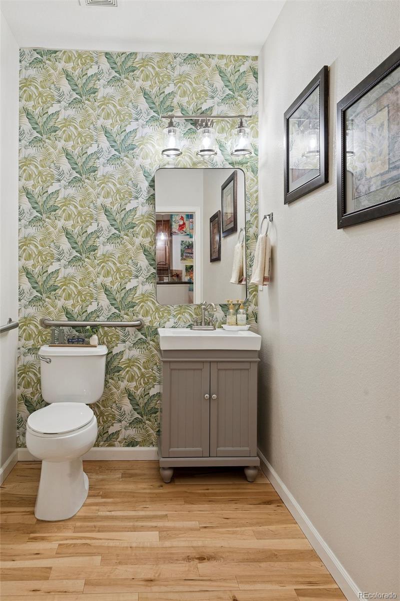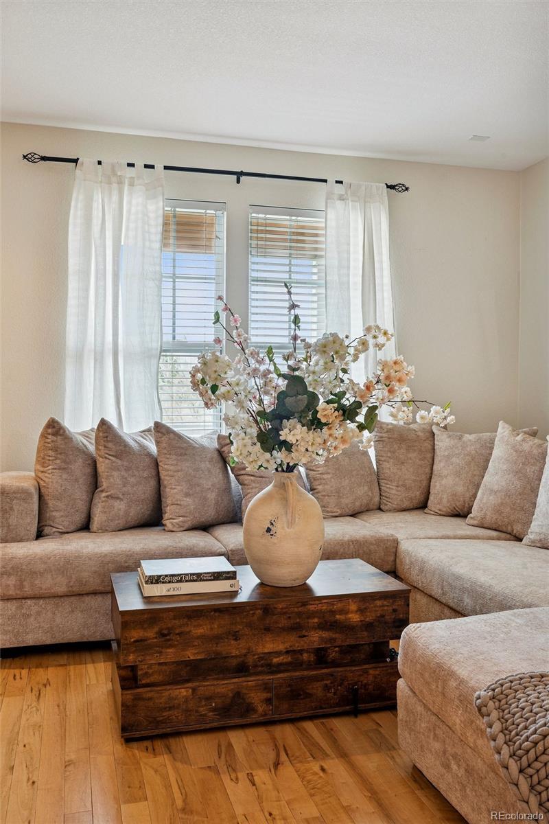 Light-filled 3-bedroom townhome in Saddle Rock East facing open space. Enjoy a covered front porch with peaceful views and a walking trail right outside your front door. Move-in ready, the main level features hardwood floors, an open kitchen with granite countertops, upgraded cabinetry, stainless steel appliances, a center island, and a sunny breakfast nook. A built-in desk provides a perfect home office setup, along with a separate dining or sitting area and a convenient half bath. Upstairs offers three bedrooms and two bathrooms, including a spacious primary suite with a five-piece bath, soaking tub, dual vanities, and walk-in closet. Two secondary bedrooms overlook open space, and the laundry room is ideally located on the upper level. The full basement with high ceilings is ready to finish, currently provides plenty of storage and additional space for hobbies. A private patio off the kitchen is ideal for outdoor dining and leads to a two-car detached garage. Community amenities include a pool and tennis courts, all minutes from shopping, dining, and major commuter routes, E-470, Arapahoe Rd, easy access to DIA, Southlands Shopping Mall, Saddle Rock Golf Course, and more.