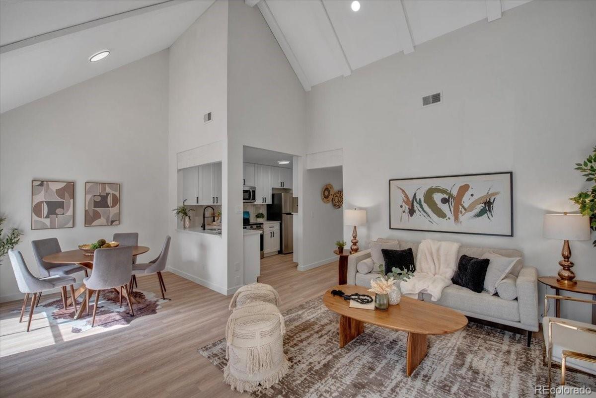 Welcome to this beautifully updated residence in The Aspens, where modern finishes meet everyday functionality. Natural light pours into the open living and dining areas, highlighting fresh interior paint and brand-new luxury vinyl plank flooring throughout the main spaces, complemented by new carpet in the bedrooms. The fully renovated kitchen features sleek white shaker cabinetry, brand new stainless steel appliances, and generous storage — designed for both style and practicality. Down the hallway, you’ll find a spacious laundry room and a completely updated full bathroom with a new tub and contemporary finishes. The primary suite offers a peaceful retreat with a large walk-in closet and a private en-suite bath. A private two-car garage located directly below the unit provides convenient access and exceptional storage space. Additional attic access from the hallway adds even more flexibility for storage needs. Move-in ready and thoughtfully upgraded, this home offers comfort, convenience, and modern appeal in a desirable community.