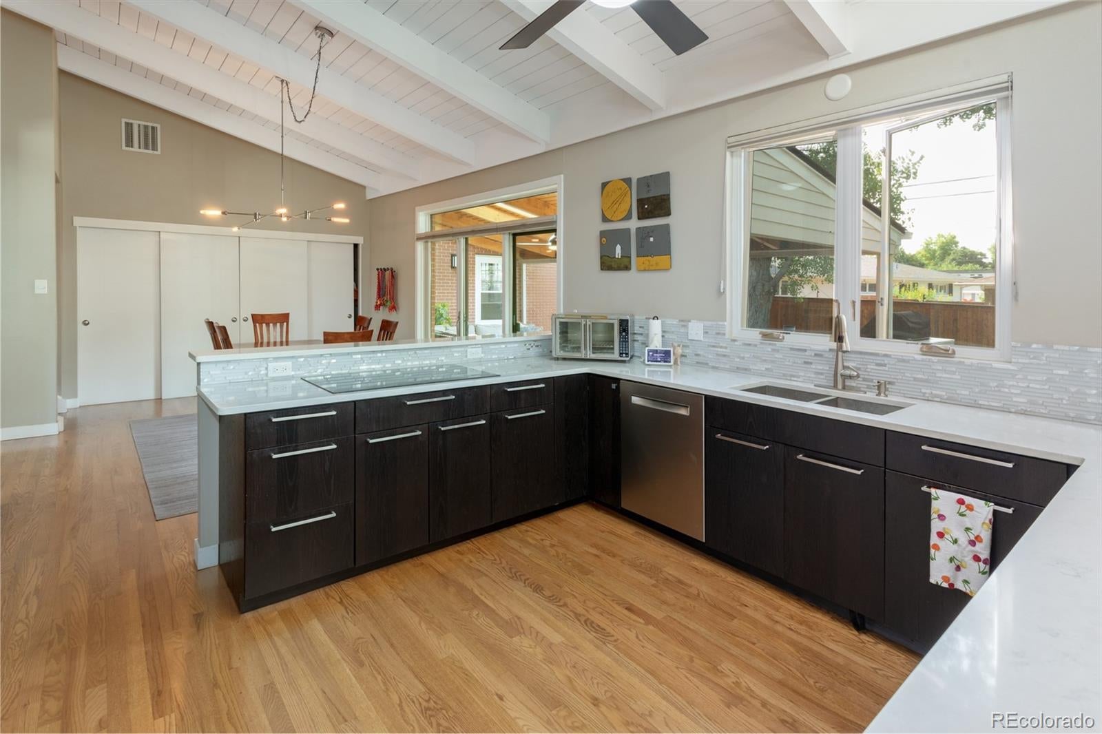 This charming mid-century home in Denver's sought-after Southern Hills, sits on a generous, oversized lot with mature trees blending timeless appeal with modern potential. Boasting 4 bedrooms, 3 baths, and 2,549 square feet of living space, perfect for families who love the University Park vibe near Slavens Elementary. Picture vaulted ceilings in the living room, a cozy fireplace, hard wood floors, time spent with the family playing games, eating, and laughing. The massive backyard is begging for barbecues, relaxing with a glass of wine and kids, enjoy the inground trampoline with your friends and neighbors. The updated kitchen has some amazing features that echo throughout the living room, dining room and family room. The skylight not only provides bright natural light, but also automaticlly closes when it begins to rain. The primary bedroom, library and primary bathroom have also had some recent upgrades that are absolutely beautiful. The other bedrooms provide a sanctuary and plenty of private space. Cold climate heat pump. Don't miss this hidden gem!