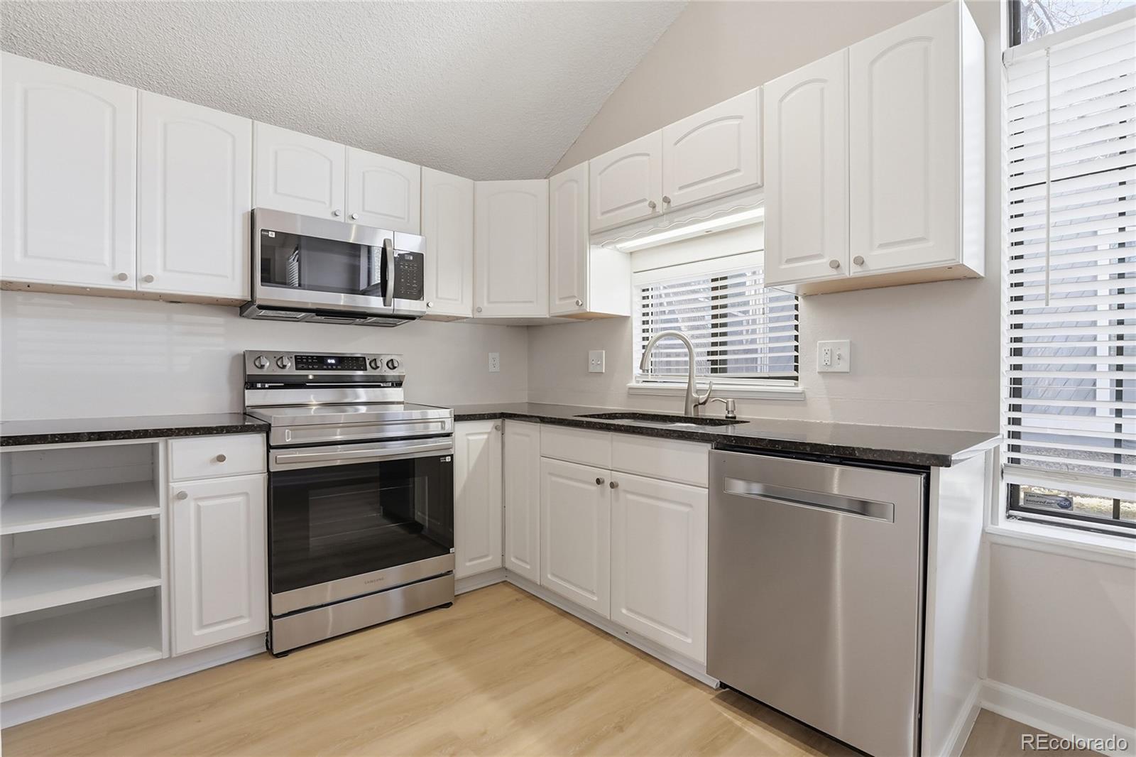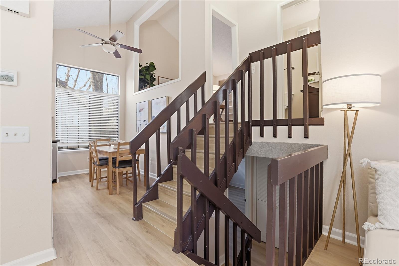 Rare listing in highly desirable Denver Tech Center area in Cherry Creek School District and hard to find at this price point! Close to shopping, Highways, Light Rail, Malls, and Restaurants. Decorator paint colors warm the walls in this surprisingly large-feeling, cluster patio home. Beautiful new laminate wood flooring, stainless steel appliances, granite countertops, a large pantry, remodeled baths with tile floors, vaulted ceilings, new six-panel doors, and extra-large closets in all rooms. A huge loft with custom-built-in shelves in addition to three bedrooms. Great, private, fenced backyard for entertaining with a new deck, eating area, and yard. The unfinished basement has a large laundry area, plenty of storage, and an additional room for working out, hobbies, or a possible office. Great use of space; a great home at a great value. Priced to sell quickly and it will!