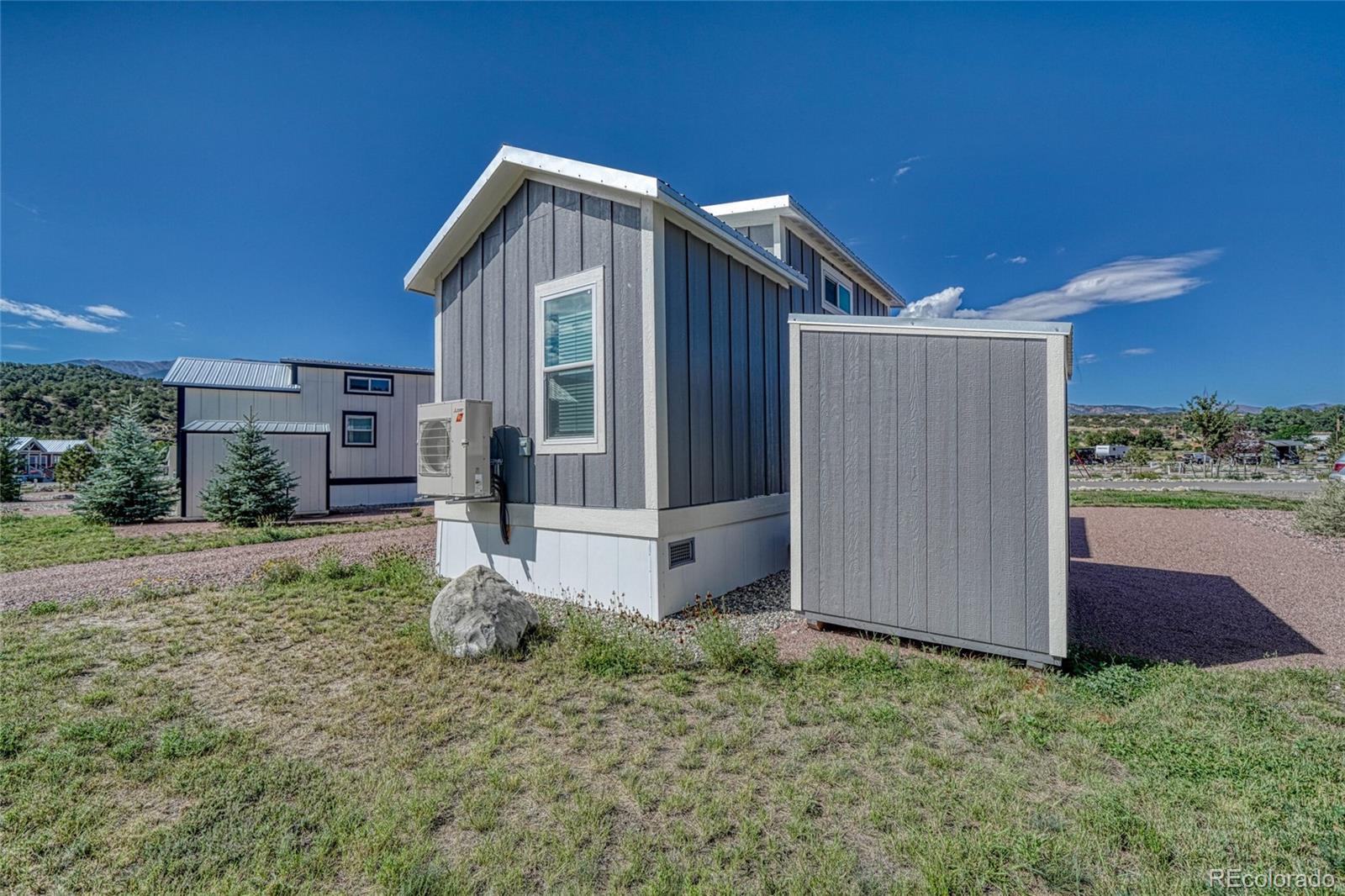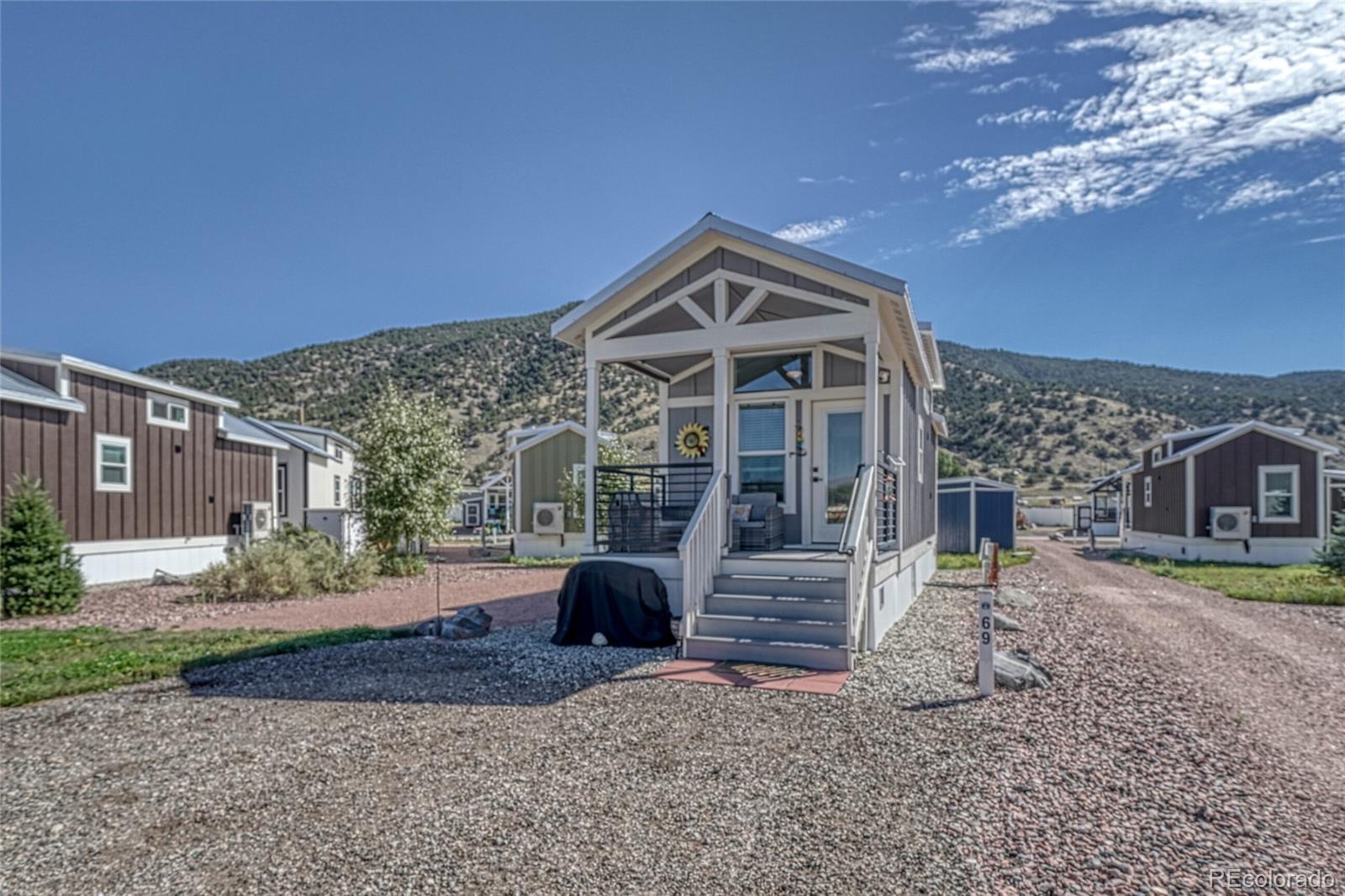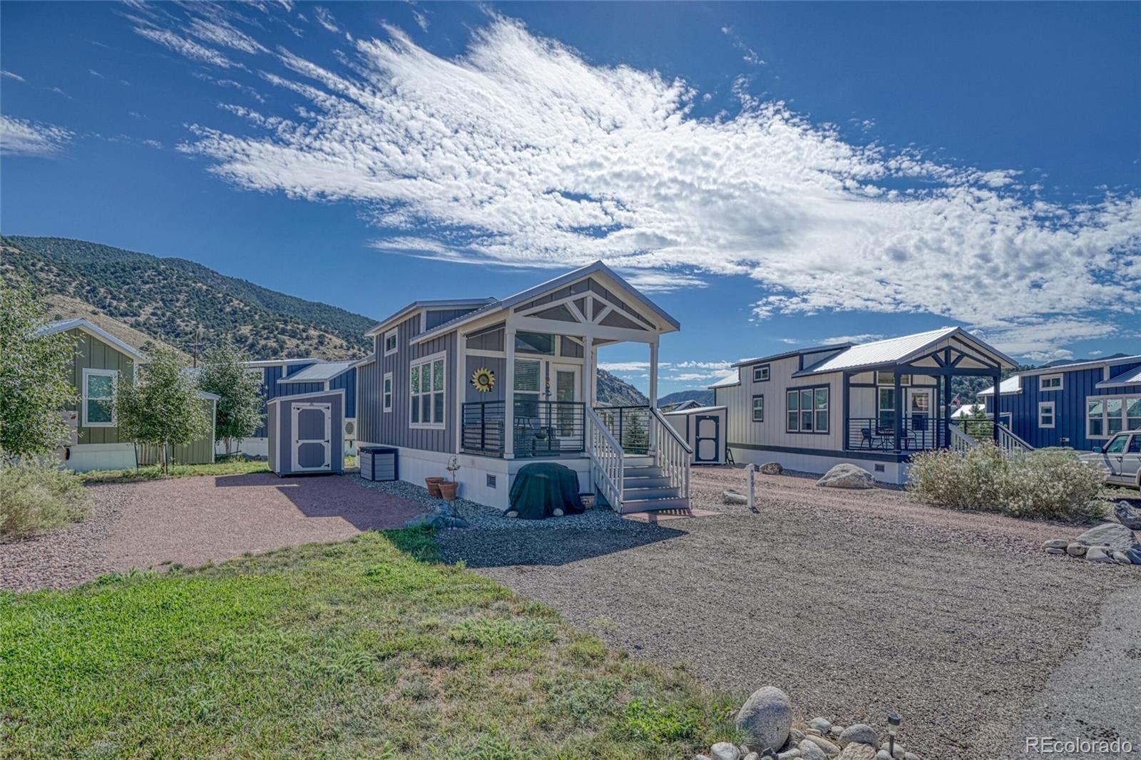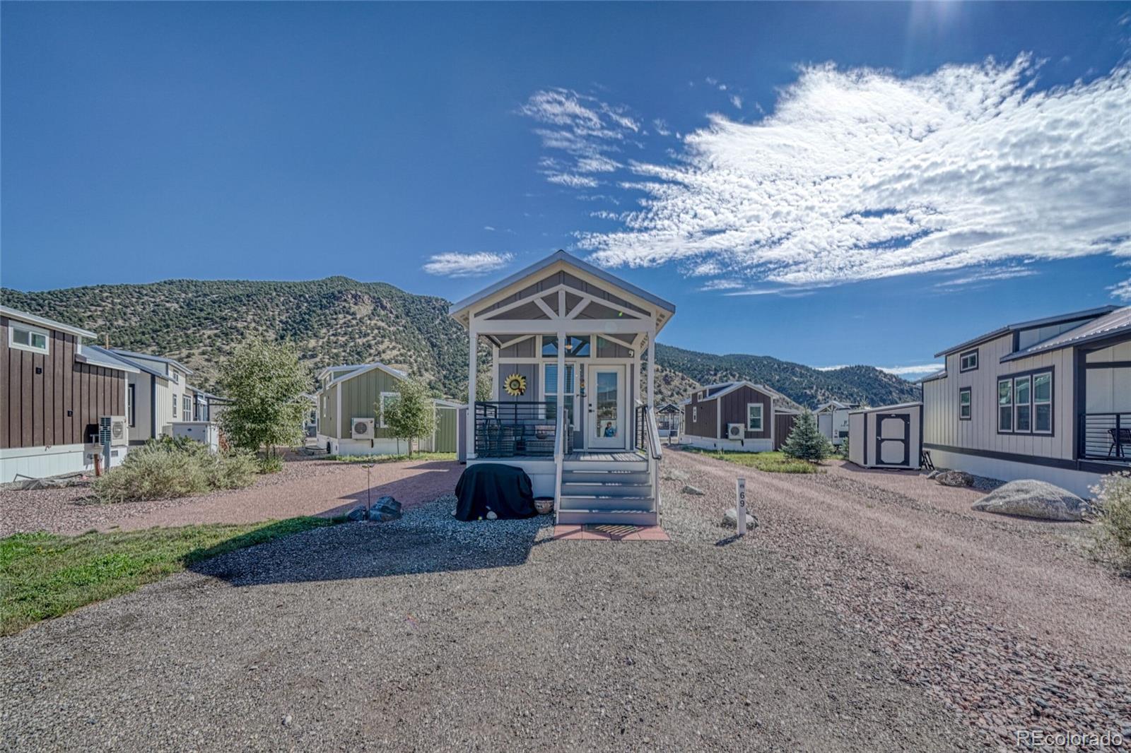 Continental Divide Park Model Home * Large Lot with west-facing Mountain Views * Upgraded Extras. Fabricated by Fading West in Buena Vista, CO this fully electric 397 sf, 1 bed/1bath park model offers in-unit laundry, ample storage, open floor plan, dining area, dishwasher, private bedroom, roomy 3/4 bath and a low-ceiling loft. Efficient floor plan includes: living area with designated wiring for entertainment; newly designed kitchen with quartz countertops, stainless steel appliances, dishwasher, oversize sink, open shelving, room for a small table; 3/4 bath offers single vanity, quartz countertop and FIBO shower surround; private bedroom with barn door closets and built-in dresser. Added extras maximize storage and enhance the tiny lifestyle: pull out storage in cabinet and below sink, drying rack in laundry area, low profile hooks behind door, plus exterior roll-up sunshades and dog gate on front porch. This unit has big mountain views to the west and is on a large pie-shaped lot that allows for extra privacy on all sides. Park Model has 2'x6' exterior walls, engineered wood siding, comes skirted with exterior steps and a covered front porch. 2 off-street parking spaces, a 6'x10' storage shed and basic landscaping are included. With over 1,600' of Arkansas River frontage the Salida RV Resort offers mountain views, playground, a riverside park/trails, boat launch, picnic area, pickle ball court, and dog run. Resort Clubhouse offers communal space, billiards, locker rooms, group room, fitness area. High speed internet is available. Monthly lot rent is $700/month and includes: clubhouse amenities, water, sewer, trash, snow removal, landscaping maintenance. Designed with an eye to affordable luxury and a desire to build community, the Salida RV Resort is a 4-season park situated in the heart of the Arkansas River Valley. The SRVR offers excellent proximity to a full spectrum of outdoor activities and is 2.5 miles from Salida's vibrant Downtown Historic District.