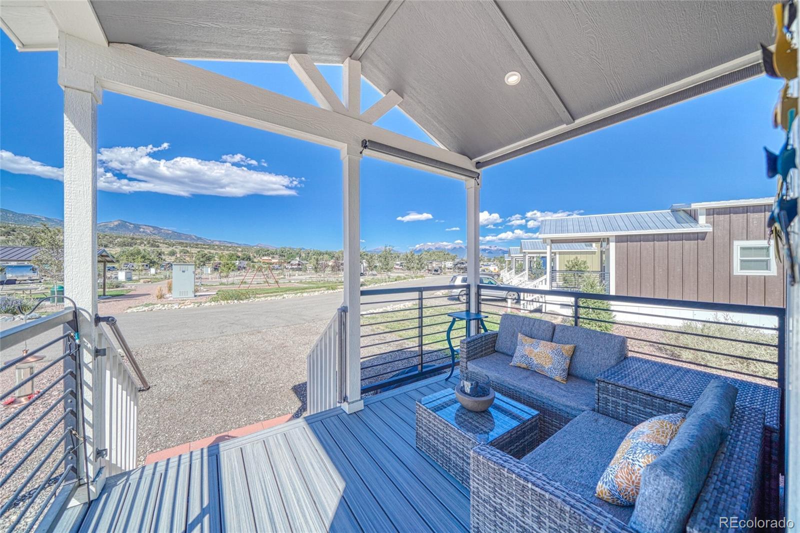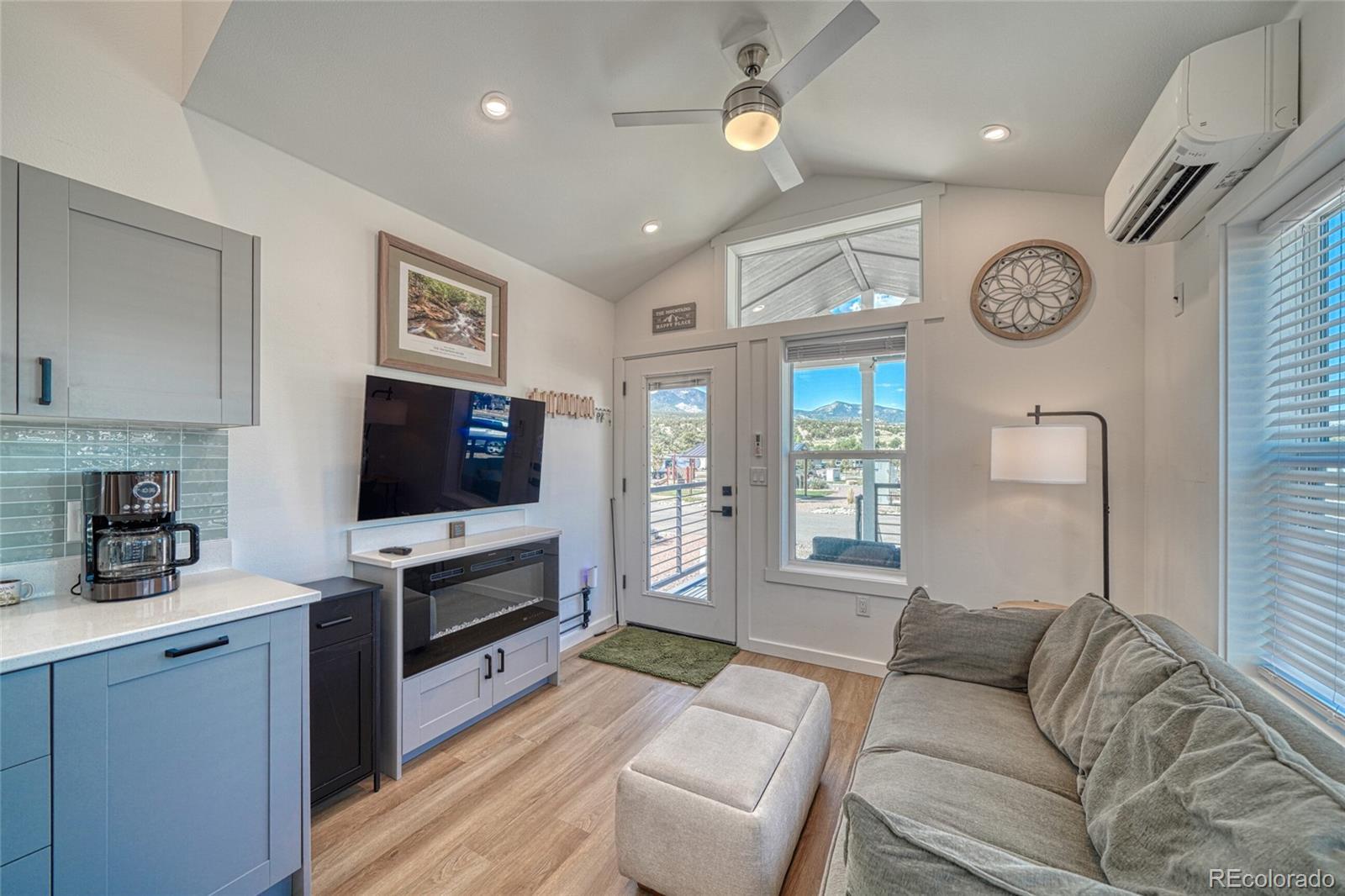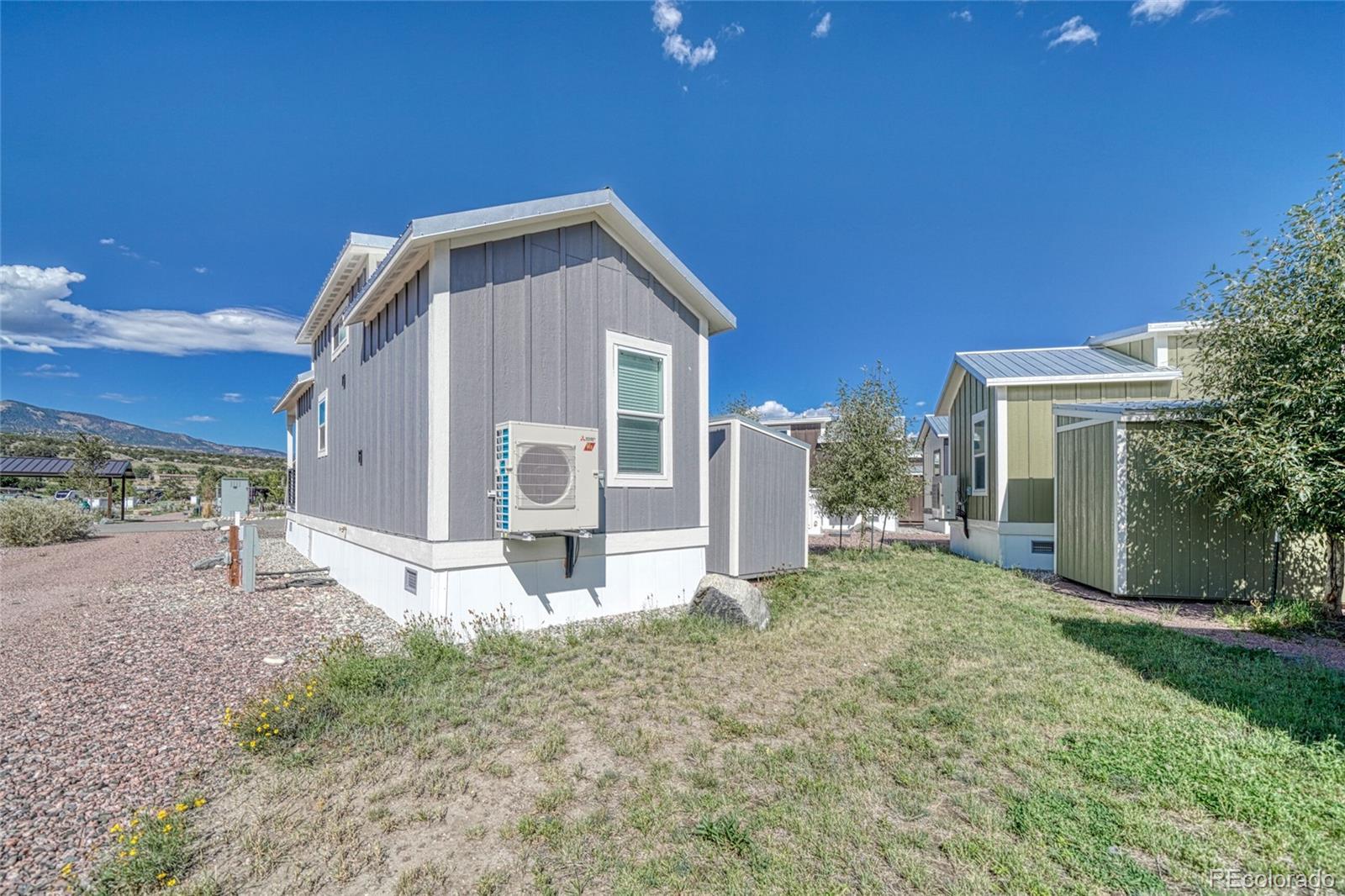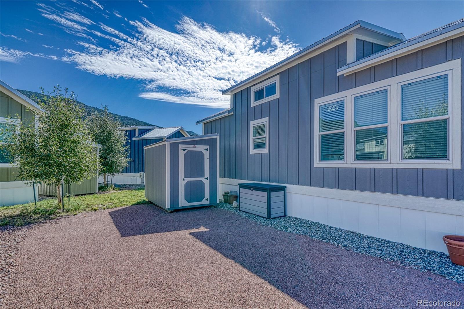 Continental Divide Park Model Home * Large Lot with west-facing Mountain Views * Upgraded Extras. Fabricated by Fading West in Buena Vista, CO this fully electric 397 sf, 1 bed/1bath park model offers in-unit laundry, ample storage, open floor plan, dining area, dishwasher, private bedroom, roomy 3/4 bath and a low-ceiling loft. Efficient floor plan includes: living area with designated wiring for entertainment; newly designed kitchen with quartz countertops, stainless steel appliances, dishwasher, oversize sink, open shelving, room for a small table; 3/4 bath offers single vanity, quartz countertop and FIBO shower surround; private bedroom with barn door closets and built-in dresser. Added extras maximize storage and enhance the tiny lifestyle: pull out storage in cabinet and below sink, drying rack in laundry area, low profile hooks behind door, plus exterior roll-up sunshades and dog gate on front porch. This unit has big mountain views to the west and is on a large pie-shaped lot that allows for extra privacy on all sides. Park Model has 2'x6' exterior walls, engineered wood siding, comes skirted with exterior steps and a covered front porch. 2 off-street parking spaces, a 6'x10' storage shed and basic landscaping are included. With over 1,600' of Arkansas River frontage the Salida RV Resort offers mountain views, playground, a riverside park/trails, boat launch, picnic area, pickle ball court, and dog run. Resort Clubhouse offers communal space, billiards, locker rooms, group room, fitness area. High speed internet is available. Monthly lot rent is $700/month and includes: clubhouse amenities, water, sewer, trash, snow removal, landscaping maintenance. Designed with an eye to affordable luxury and a desire to build community, the Salida RV Resort is a 4-season park situated in the heart of the Arkansas River Valley. The SRVR offers excellent proximity to a full spectrum of outdoor activities and is 2.5 miles from Salida's vibrant Downtown Historic District.