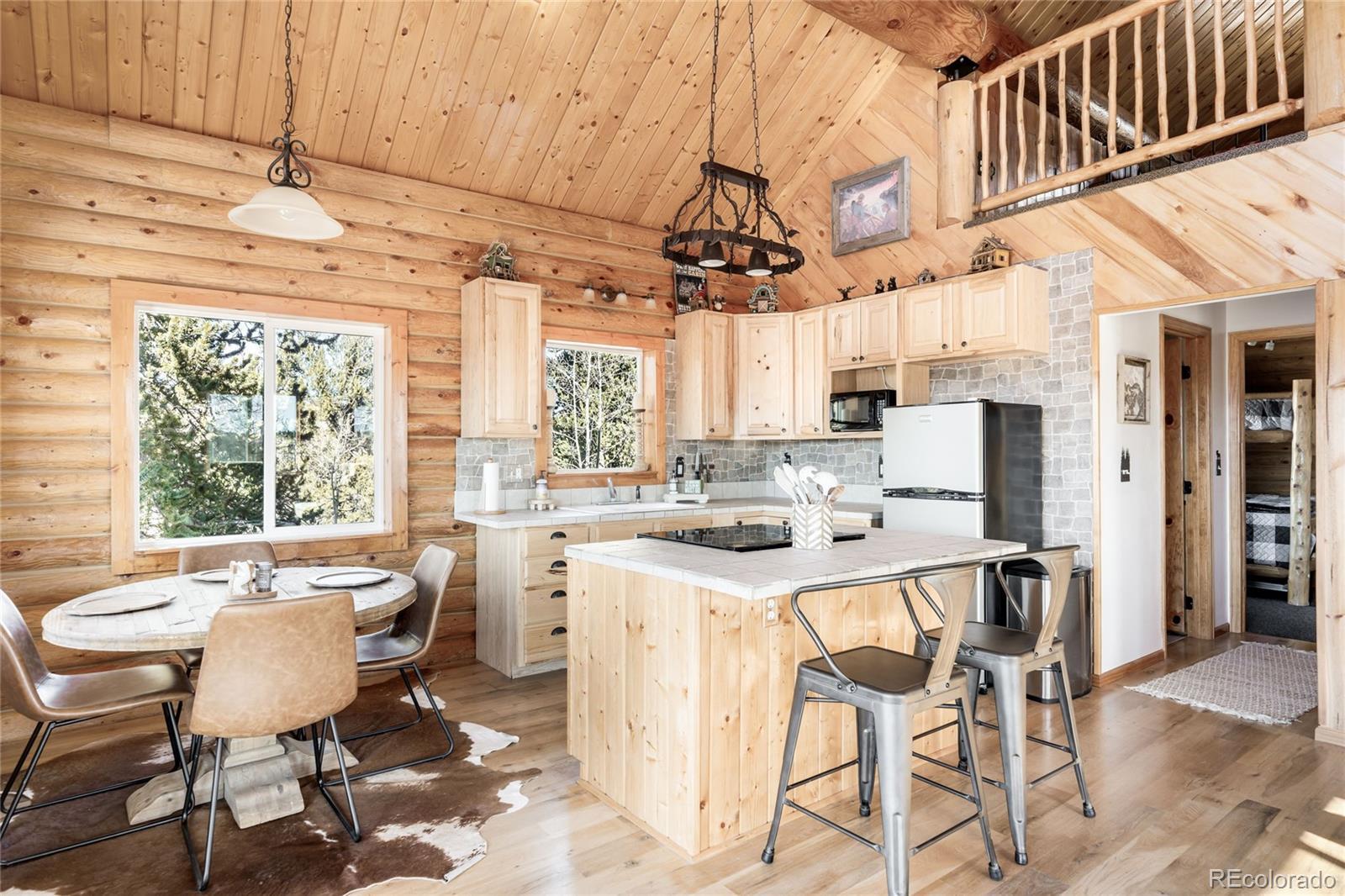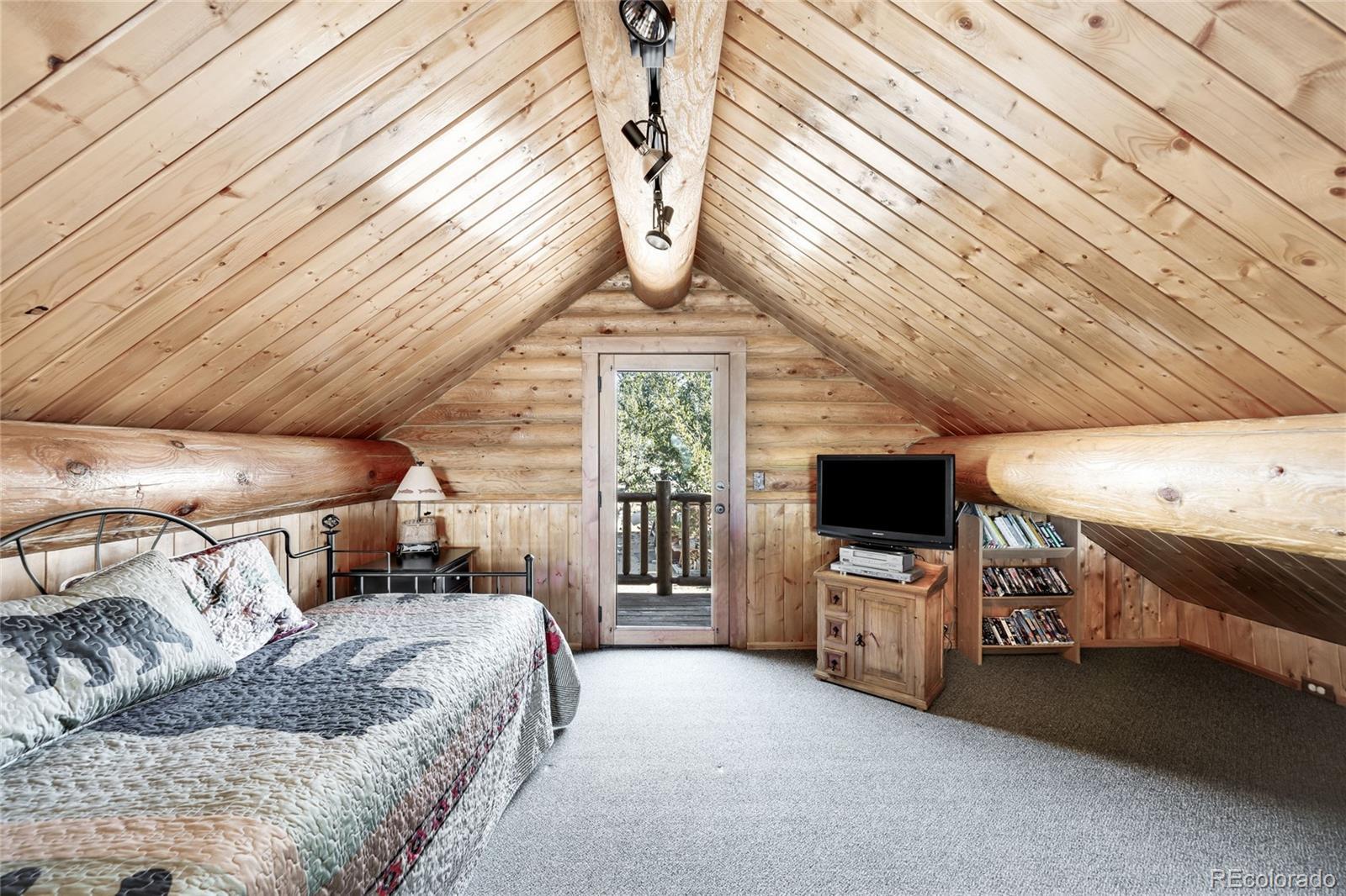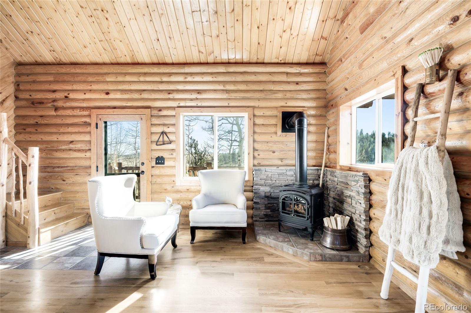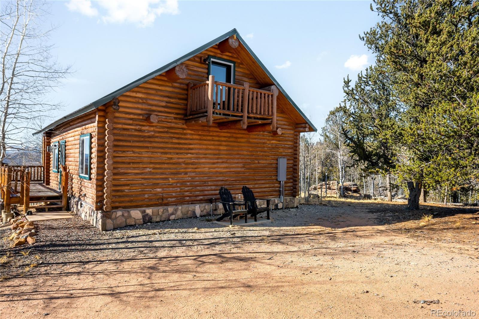 Unobstructed views on six acres of blissful landscape, this private oasis brings to life the dream of off-grid living. A wraparound porch envelops this log cabin, creating the perfect perch for enjoying panoramic views. Inside, an open-concept floorplan is awash with natural light from generous windows and tongue-in-groove accents that maintain a rustic, yet elevated atmosphere. Vaulted ceilings crown the living and kitchen area while a wood stove grounds the space with a warm, inviting aura. This motif continues into the two main-level bedrooms that share a sleek and modern bathroom. The open staircase ascends to a flexible loft area with balcony access — ideal for additional bedroom space, living area, and more. Here, residents enjoy forested views with opportunities to spot wildlife. Outside, a storage shed adds convenient storage while a number of cleared areas are ideal for outdoor lounging and recreation. Close proximity to Highway 285 provides easy access to mountain adventures in Breckenridge and the urban conveniences of the Front Range.