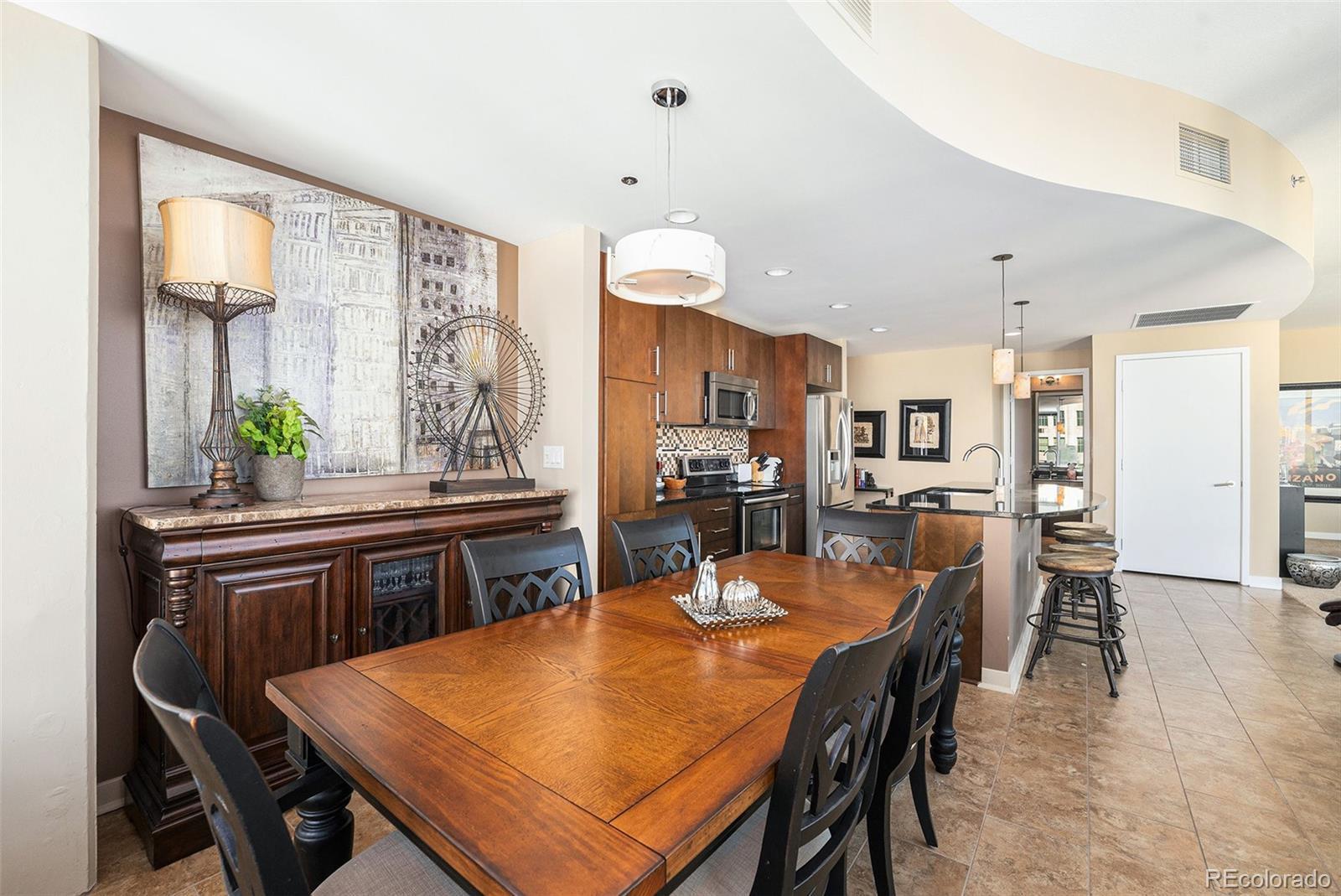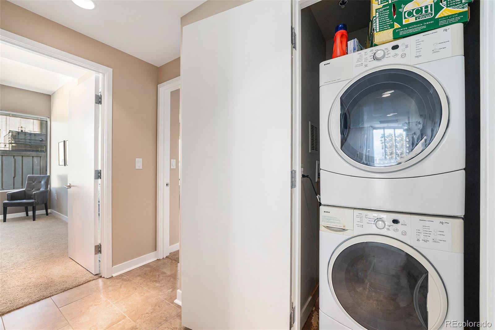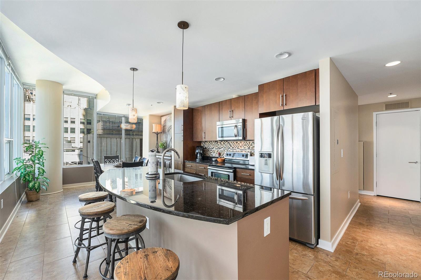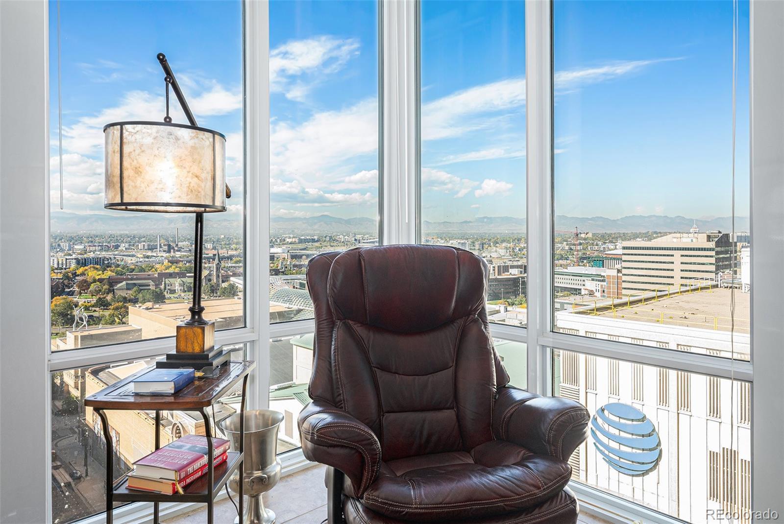 Stylish Downtown Retreat with Floor-to-Ceiling Views. If you want the best view of mountain sunsets in downtown Denver, we are serving it up right here. This rare southwest corner residence at the iconic Spire combines modern design, brilliant natural light, and panoramic views of the city and Front Range. Enjoy an open-concept layout with finished ceilings (not exposed concrete), floor-to-ceiling windows, and a sleek kitchen featuring 42-inch walnut cabinets, stainless steel appliances, and an eye-level microwave. Two spacious bedrooms offer ample closet space, including a primary suite with walk-in closet and five-piece bath. Laundry closet is conveniently tucked into the back hallway. A true downtown retreat where comfort, style, and skyline views meet unforgettable sunsets.