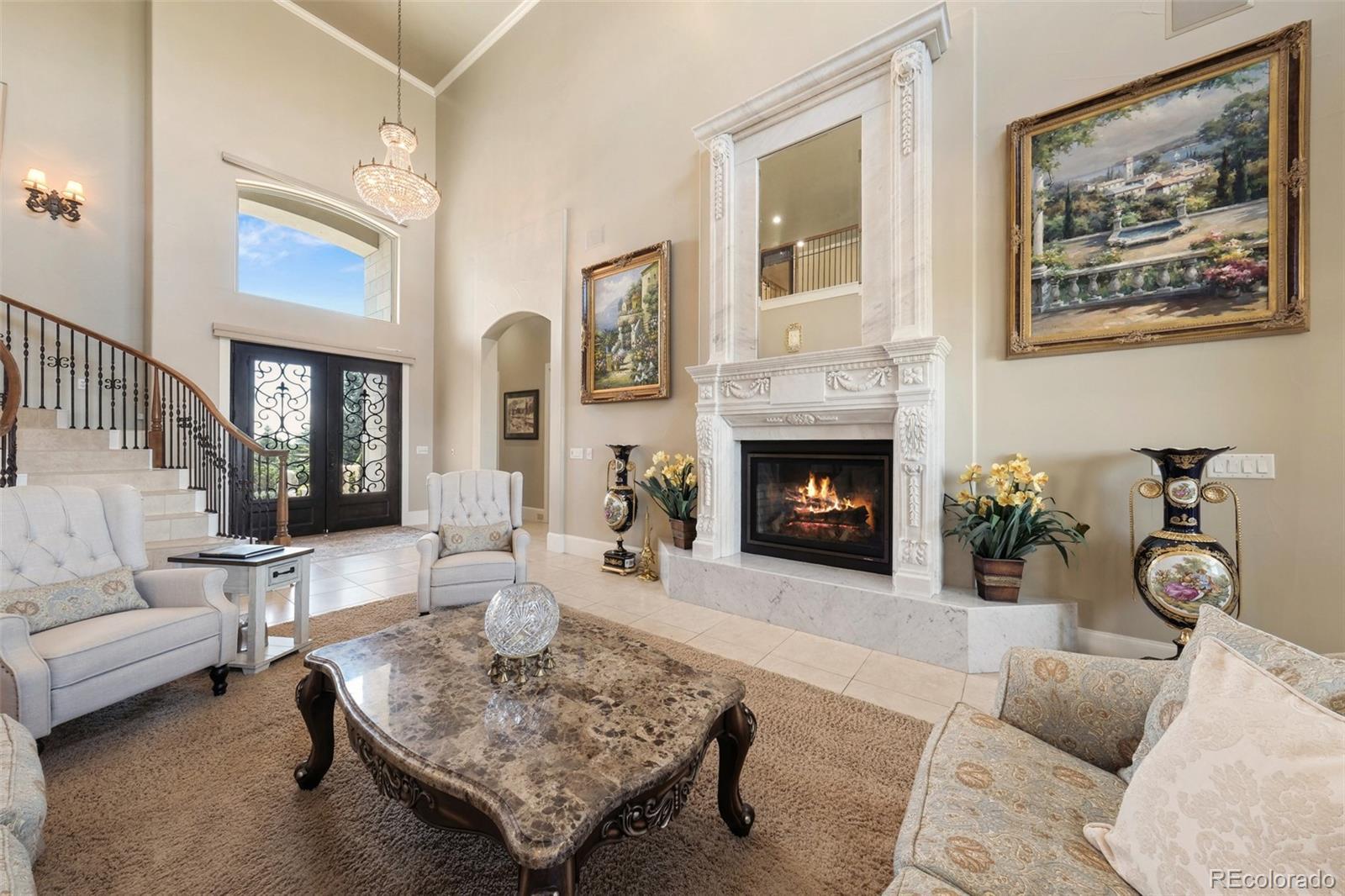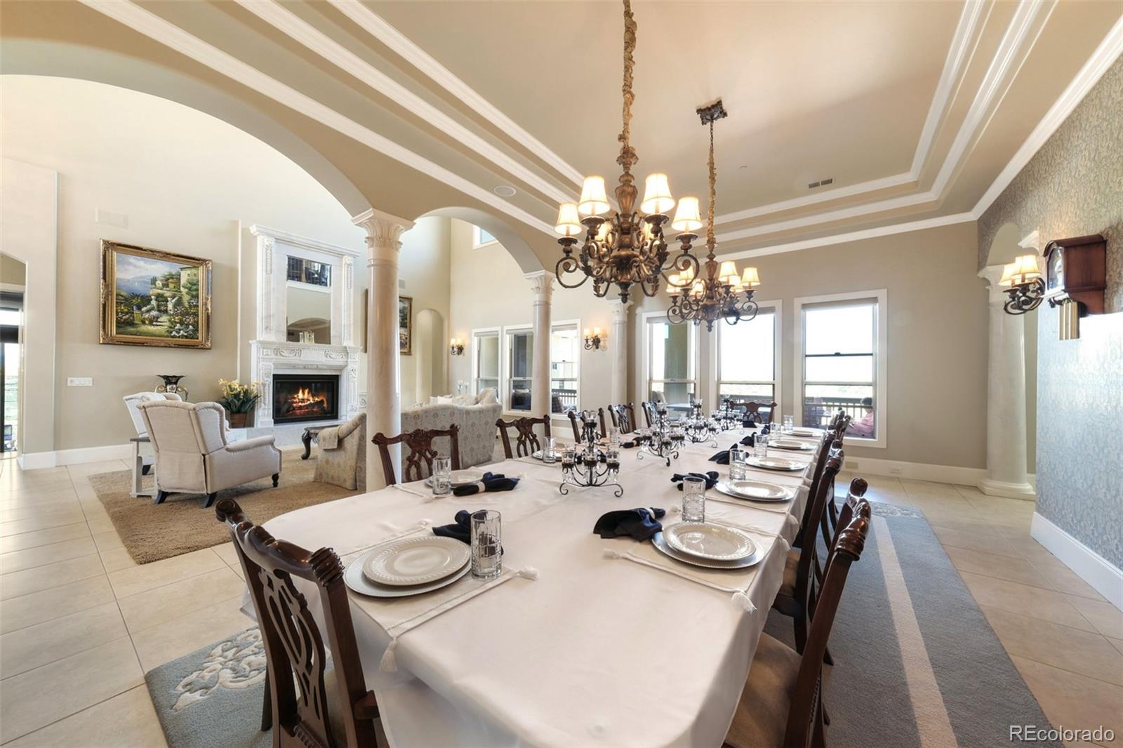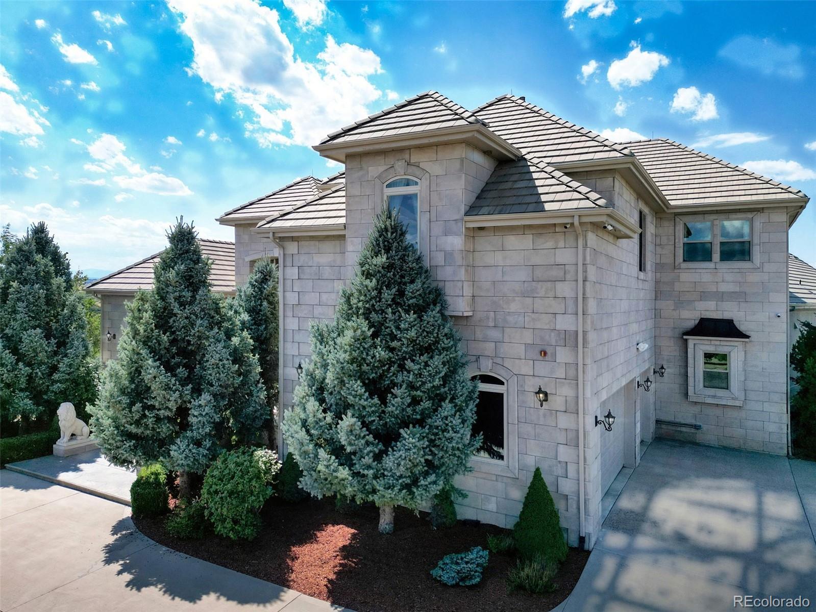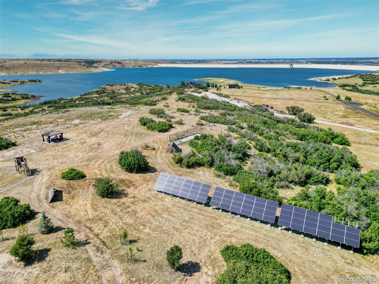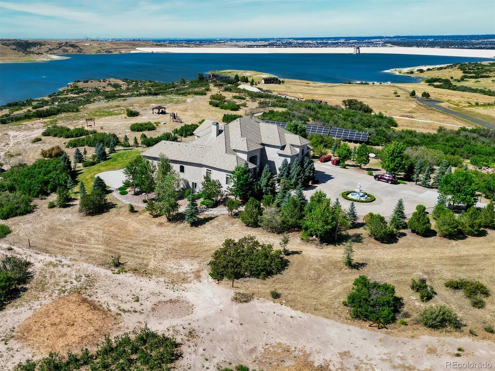 A rare Colorado sanctuary designed for privacy, resilience, and inspired living. This European chateau inspired estate spans 26.47 acres bordering Rueter Hess Reservoir within gated Castle Park Ranch, an exceptional retreat just 12 minutes to Castle Rock and 20 minutes to Park Meadows. The privately maintained road and unincorporated Douglas County setting provide privacy and flexibility, ideal for buyers dividing time among multiple homes or cities. Its central Front Range location offers access to Colorado’s signature pursuits including skiing, hiking, hunting, mountain biking, fly fishing, and year round recreation, while remaining well suited for private retreats and entertaining in a secure, scenic setting. Resort style grounds include a lighted sport court, outdoor kitchen with TV, fire features, hot tub, zip line, batting cage, and a gazebo with a wood burning fireplace. Mature, irrigated landscaping frames sweeping lake and long range mountain views from one of Castle Rock’s most elevated vantage points. Purpose built for efficient ownership and self sufficiency, the property features an integrated solar array with battery storage, whole house generator, private well, on site fuel reserves, and an interior fire suppression sprinkler system. A greenhouse and garden support independent living, while the well permit allows domestic use, livestock watering, and irrigation up to one acre. Inside, a dramatic entry and expansive windows showcase the scenery. Multiple fireplaces, a chef’s kitchen, private bedroom suites including a luxurious primary, and flexible spaces for office or recreation complete the home. Agricultural tax status through grazing designation reduces property taxes. Adjacent to PWSD managed open space with controlled access to trails, water recreation, and natural scenery. Repositioned for today’s market, with flexibility for buyers who want to personalize a property of this caliber. Ask about options.