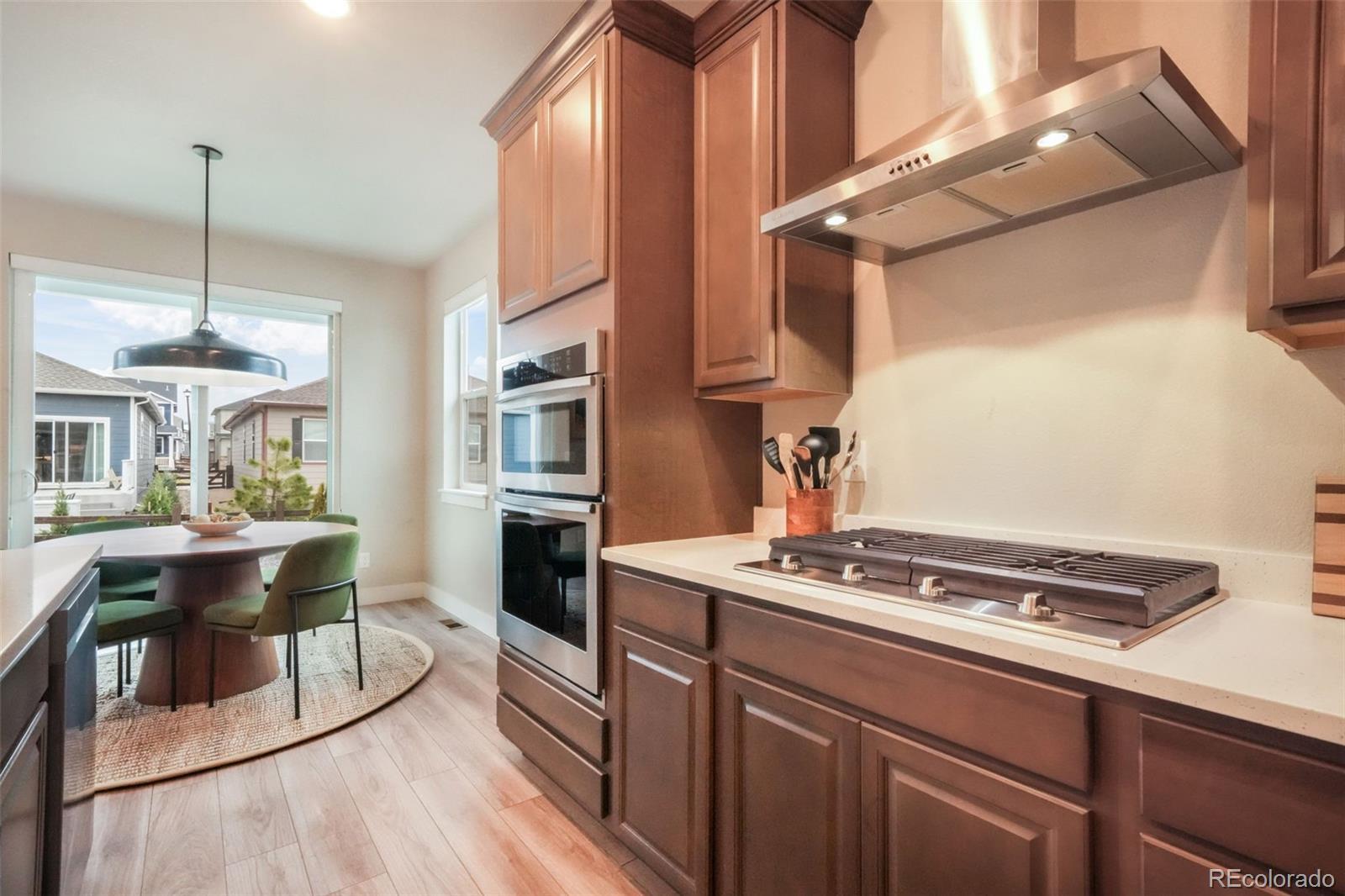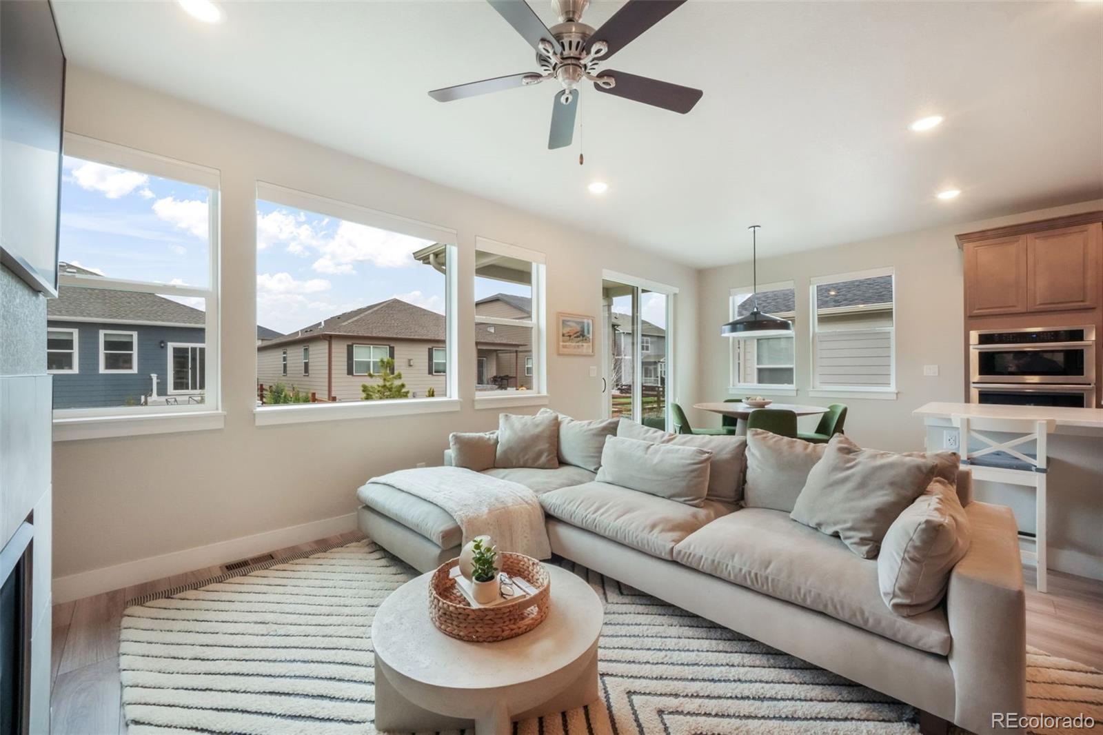 Welcome to this beautifully upgraded ranch style home in desirable Willow Springs Ranch designed for effortless main level living and filled with thoughtful, high end touches throughout. From the moment you step inside, you’ll appreciate the neutral color palette, LVP flooring, and the attention to detail in the wood window sills, expertly framed doors, and elevated baseboards. The open concept layout is ideal for everyday living and entertaining, offering a spacious living room with a gas fireplace and TV prewire, a dining area with sliding glass door to the backyard, and a stunning kitchen. The kitchen showcases quartz countertops, a large island with a single basin sink, a pantry with built in counter height cabinetry, stainless steel appliances including a gas range with hood, dishwasher, in wall oven and microwave, and a smart refrigerator. A built in boot bench and high end washer and dryer with folding table add both function and style to daily routines. The primary suite offers a peaceful retreat with a sliding barn door for added privacy, dual sinks, a step-in shower with floor to ceiling tile, and a generous walk in closet. Two additional bedrooms share a full hall bath, which features tile extending to the ceiling in the shower—no detail has been overlooked. In place of a pony wall, you will find an upgraded bannister. Outside, the fenced yard and completed landscaping offer a turn key experience. This is not your average home in Willow Springs Ranch, it's a polished, inviting space that blends comfort, style, and quality in every corner. Welcome home!
