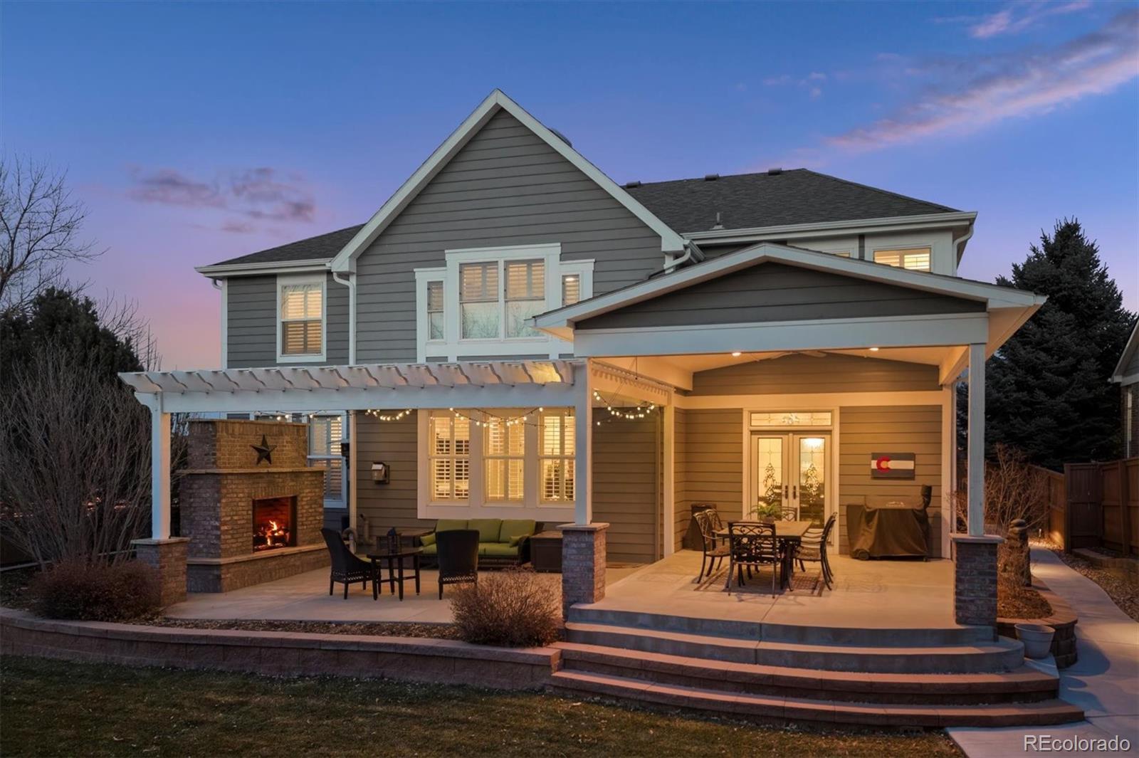 Thoughtfully designed with elegance and comfort in mind, this traditional home is located in the highly sought-after Weatherstone community of Highlands Ranch and offers 5 bedrooms plus a study and 5 bathrooms, creating a perfect balance of functionality and refined living. Enter through the covered porch, leading into an open-concept living space ideal for both everyday enjoyment and entertaining. The updated kitchen anchors the home with a large island and seamless flow into the eat-in dining area as well as a formal dining or living space—perfect for gatherings both large and intimate. Step outside to an expansive, private backyard featuring a covered patio, pergola, built-in gas fireplace, and mature trees and vegetation, creating a serene outdoor retreat. Inside, thoughtful upgrades include vinyl flooring throughout the main level, shutters throughout the home, an updated kitchen, and a luxurious five-piece primary bathroom with an oversized walk-in shower, soaking tub, and spacious walk-in closet. The finished basement adds exceptional value with an exercise room complete with a built-in sauna, offering the ultimate space for wellness, leisure, and relaxation.