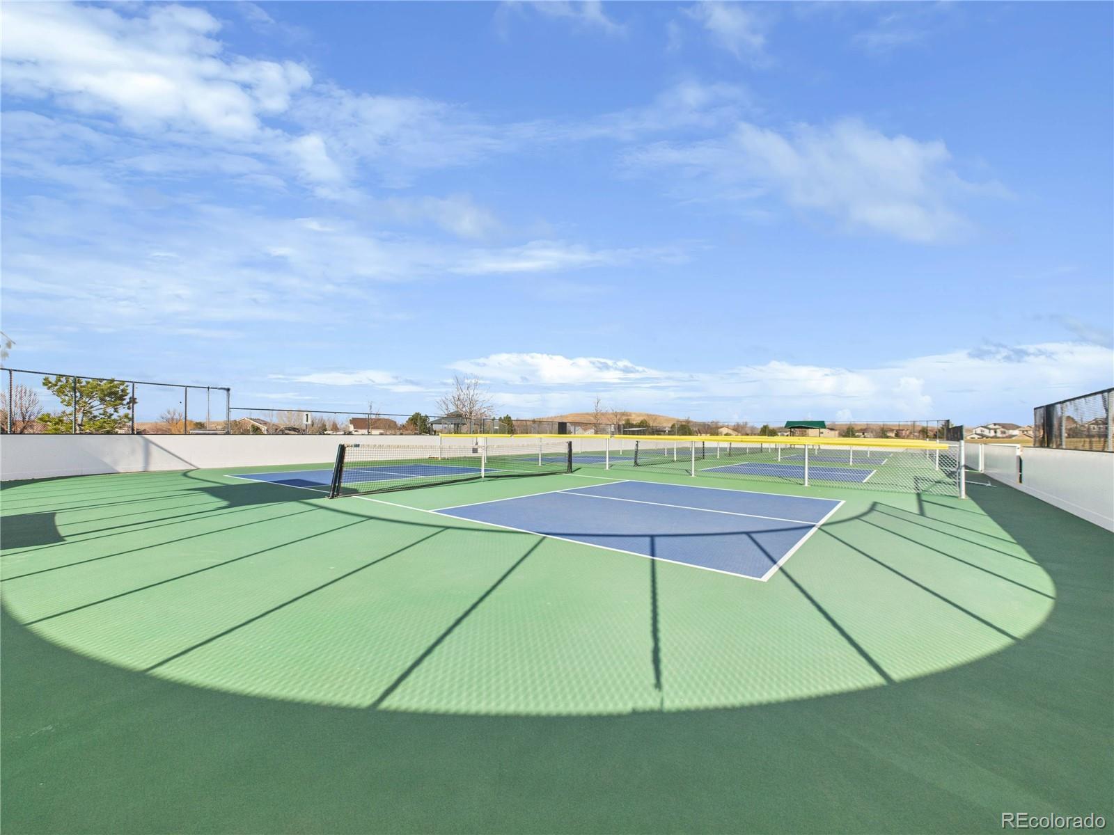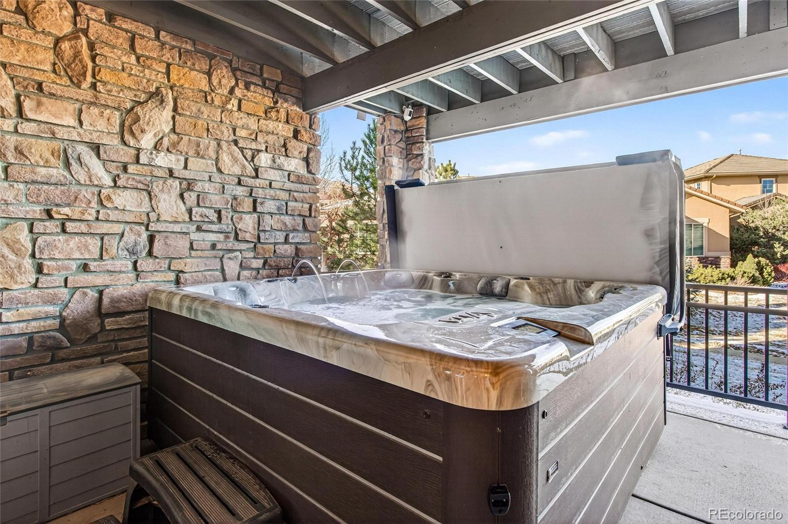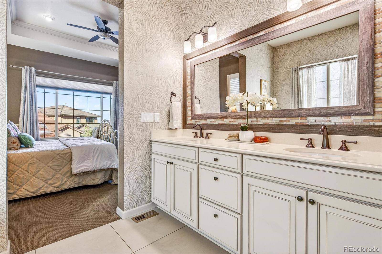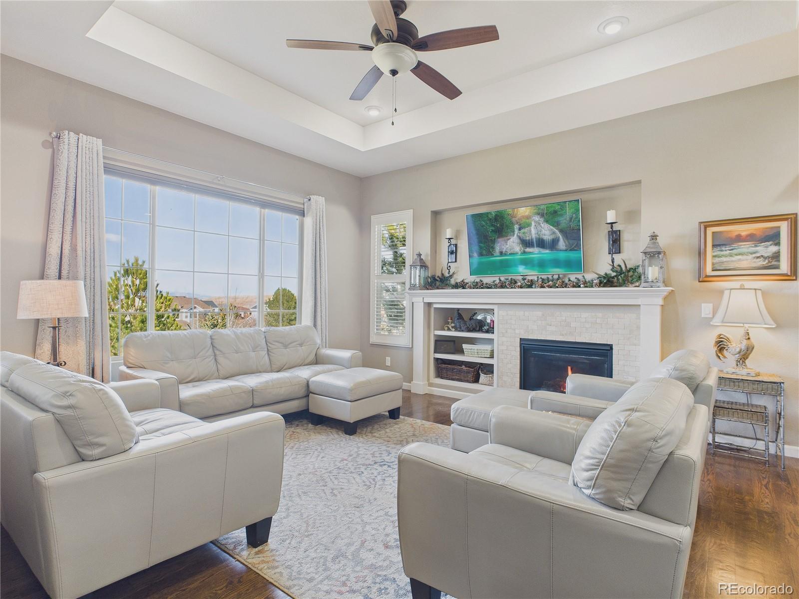 You will love his thoughtfully appointed ranch-style home w/ fantastic layout and nice views. The open floor plan is enhanced by wood flooring and an abundance of windows, creating a bright, airy atmosphere that flows easily from room to room. The kitchen is designed for both daily living and entertaining, offering an expanded island, gas cooktop, and a large walk-in pantry. It opens naturally to the living room, where a gas fireplace adds warmth and visual appeal. A flexible bonus room provides space for a home office, library, or dining room, allowing the home to adapt to your needs. The main-level primary suite is a peaceful retreat with coffered ceilings, plantation shutters, and a spa-inspired bath featuring a soaking tub and a spacious glass-enclosed shower. A second bedroom and full bathroom, along with a convenient laundry/mudroom with a utility sink just off the garage, complete the main floor. The finished walk-out basement extends the living space with a large family and entertaining area, a third bedroom, and another full bathroom. A custom wine cellar and built-in wet bar with a bar refrigerator and dishwasher create an ideal setting for hosting, while an oversized storage room provides ample space for organization. Outdoor living is a highlight, with a three-panel sliding door leading to a covered deck featuring a built-in gas fireplace. Enjoy mountain views, sunsets, and hot air balloons drifting by on summer and fall mornings. Additional features include a fully finished garage with epoxied flooring, hardwired ADT security system with video doorbell, and integrated Sonos surround sound. The HOA handles exterior landscaping and snow removal and offers access to an impressive range of amenities, including the Colorado National Golf Course, pickleball,pools, a fitness center, clubhouse, trails, and parks—all conveniently located near shopping, dining, and major highways. Come discover this GEM. WELCOME HOME!