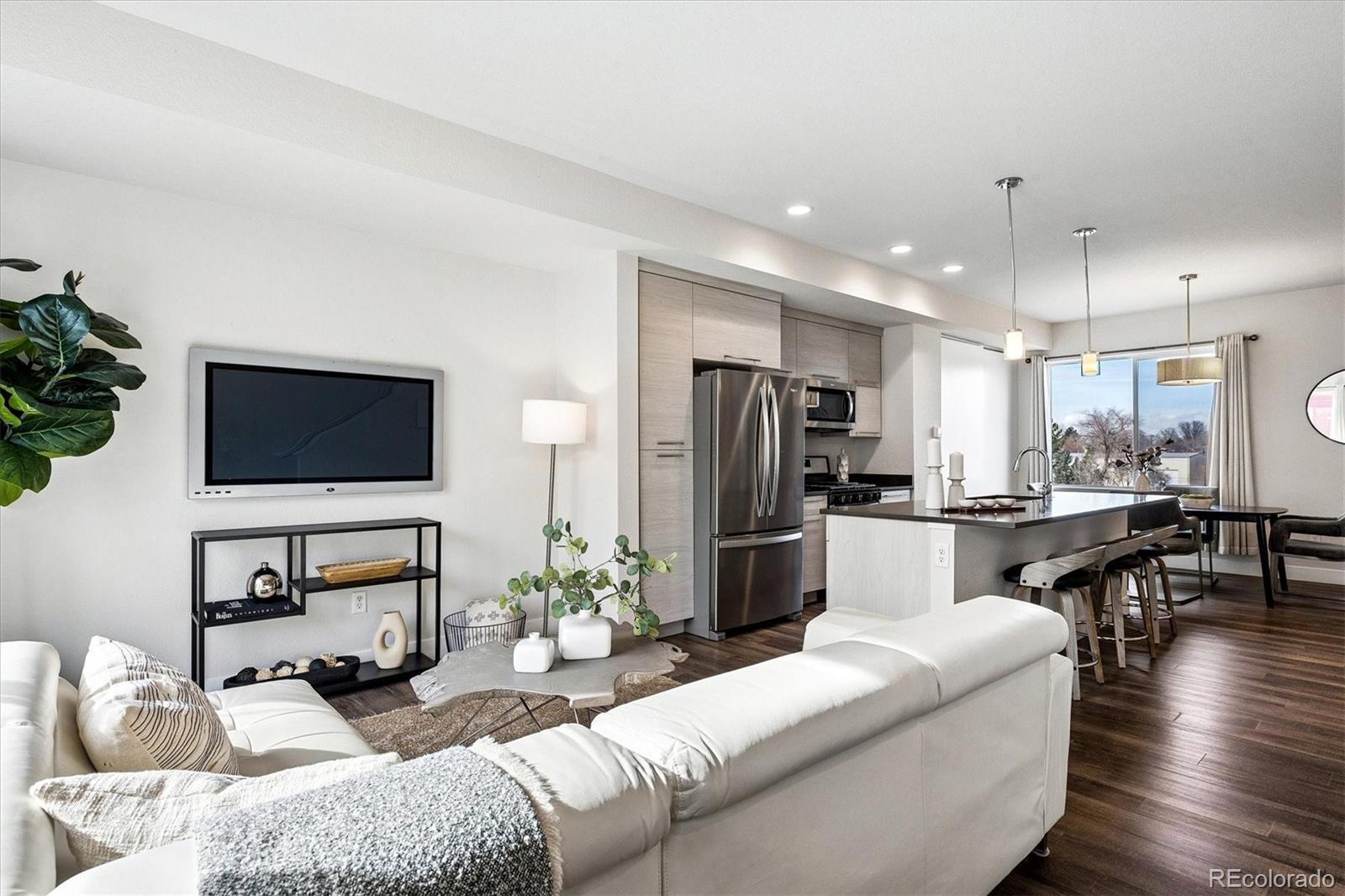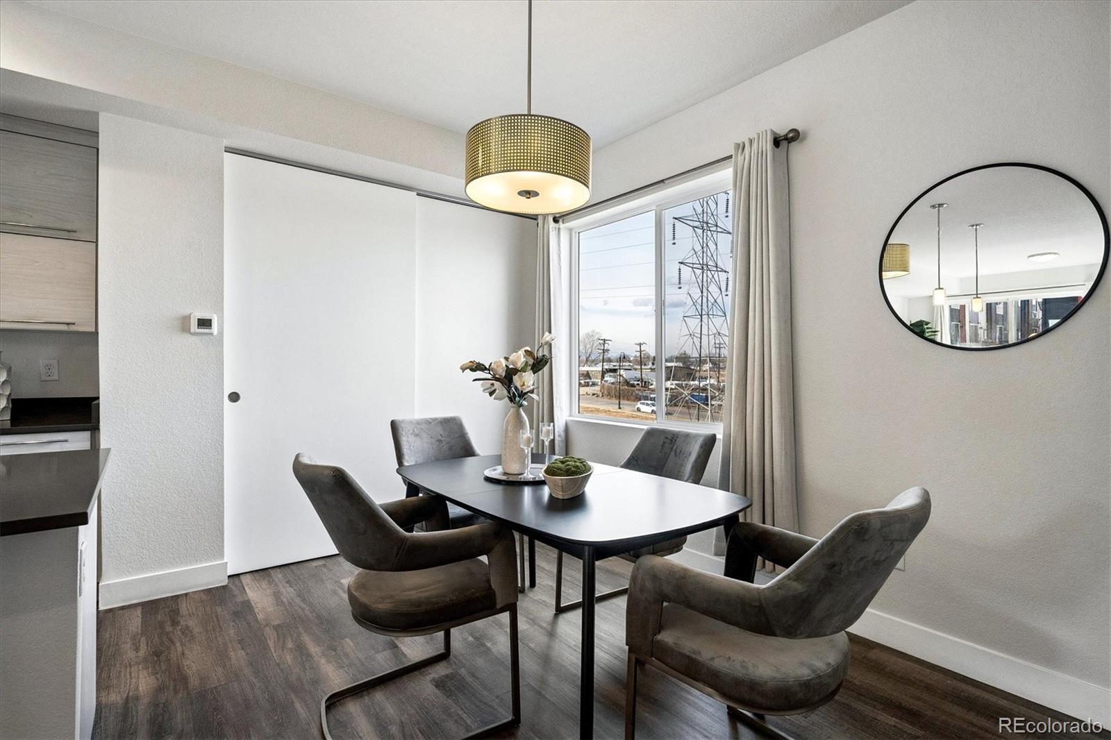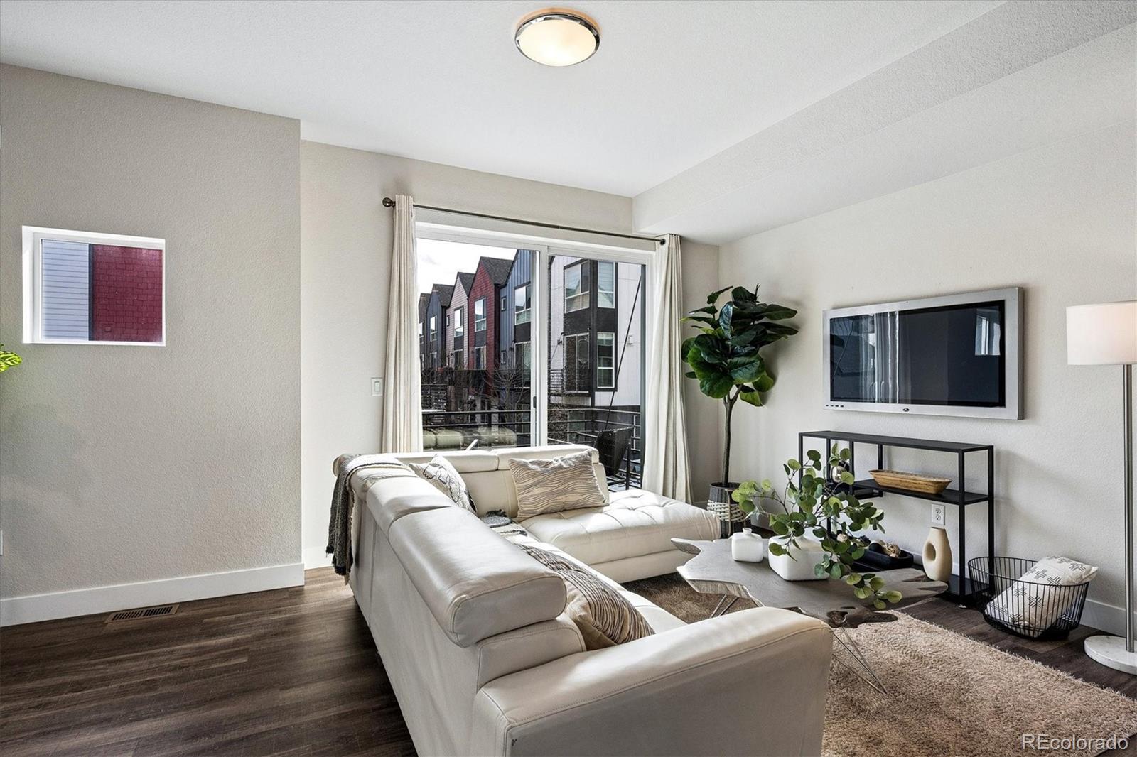 The light rail station is a mere minutes from your front door. This spacious 3 bedroom townhome has a flexible floorpan and attached one car garage. Convenience and access are key to the lifestyle in this modern walk-up Townhome. Enjoy mountain views, easy access to bike trails, the light rail, and its close proximity to Edgewater and all the vibrancy of Sloans Lake. Large and open main floor plan is perfect for cooking, relaxing and entertaining. Designer LVT flooring throughout the main floor. Large kitchen island with quartz countertops with stainless steel appliances plus incredible storage. Cabinets have been outfitted with pull-out drawers, and the closet pantry has had an organization systems added for efficient storage. Two en suite bedrooms on the upper level have convenient laundry machines in the hallway. The 3rd and lower level bedroom offers flexibility as office, studio, or flex space with access to the backyard patio. Easy living, convenient location, No HOA thanks to the special taxing district.