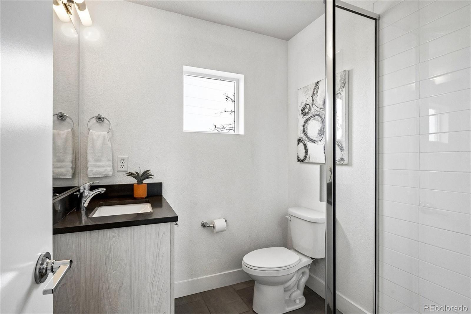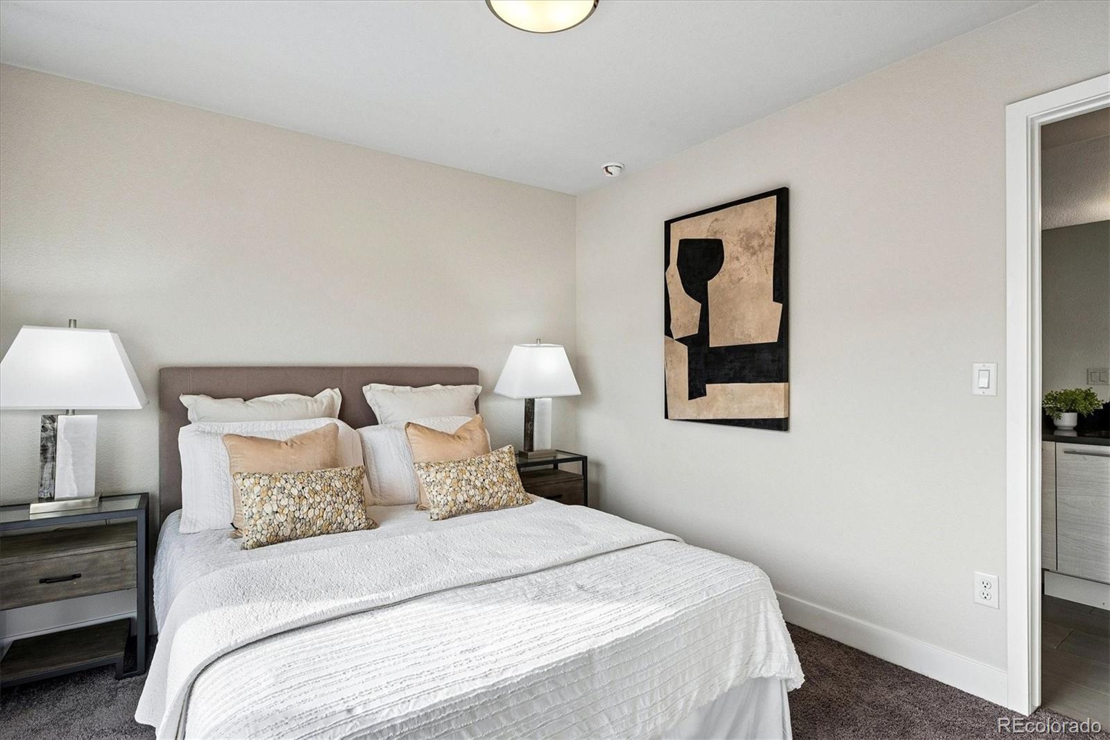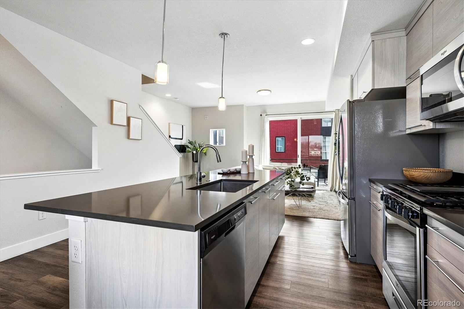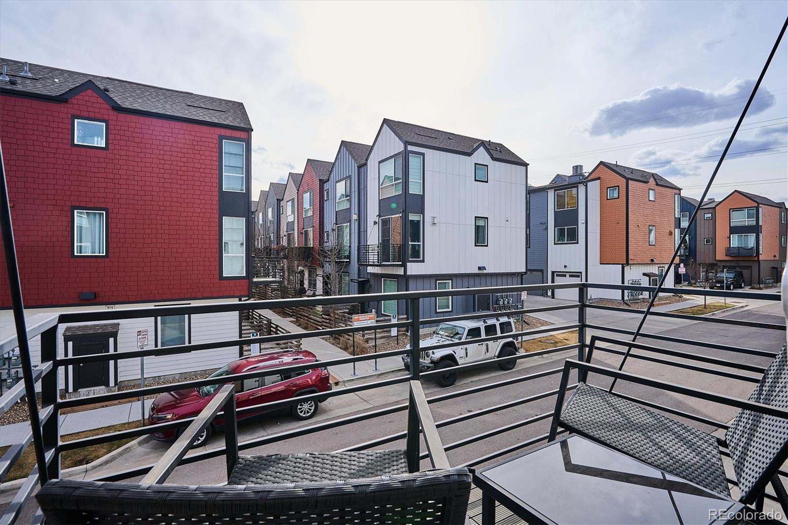 The light rail station is a mere minutes from your front door. This spacious 3 bedroom townhome has a flexible floorpan and attached one car garage. Convenience and access are key to the lifestyle in this modern walk-up Townhome. Enjoy mountain views, easy access to bike trails, the light rail, and its close proximity to Edgewater and all the vibrancy of Sloans Lake. Large and open main floor plan is perfect for cooking, relaxing and entertaining. Designer LVT flooring throughout the main floor. Large kitchen island with quartz countertops with stainless steel appliances plus incredible storage. Cabinets have been outfitted with pull-out drawers, and the closet pantry has had an organization systems added for efficient storage. Two en suite bedrooms on the upper level have convenient laundry machines in the hallway. The 3rd and lower level bedroom offers flexibility as office, studio, or flex space with access to the backyard patio. Easy living, convenient location, No HOA thanks to the special taxing district.