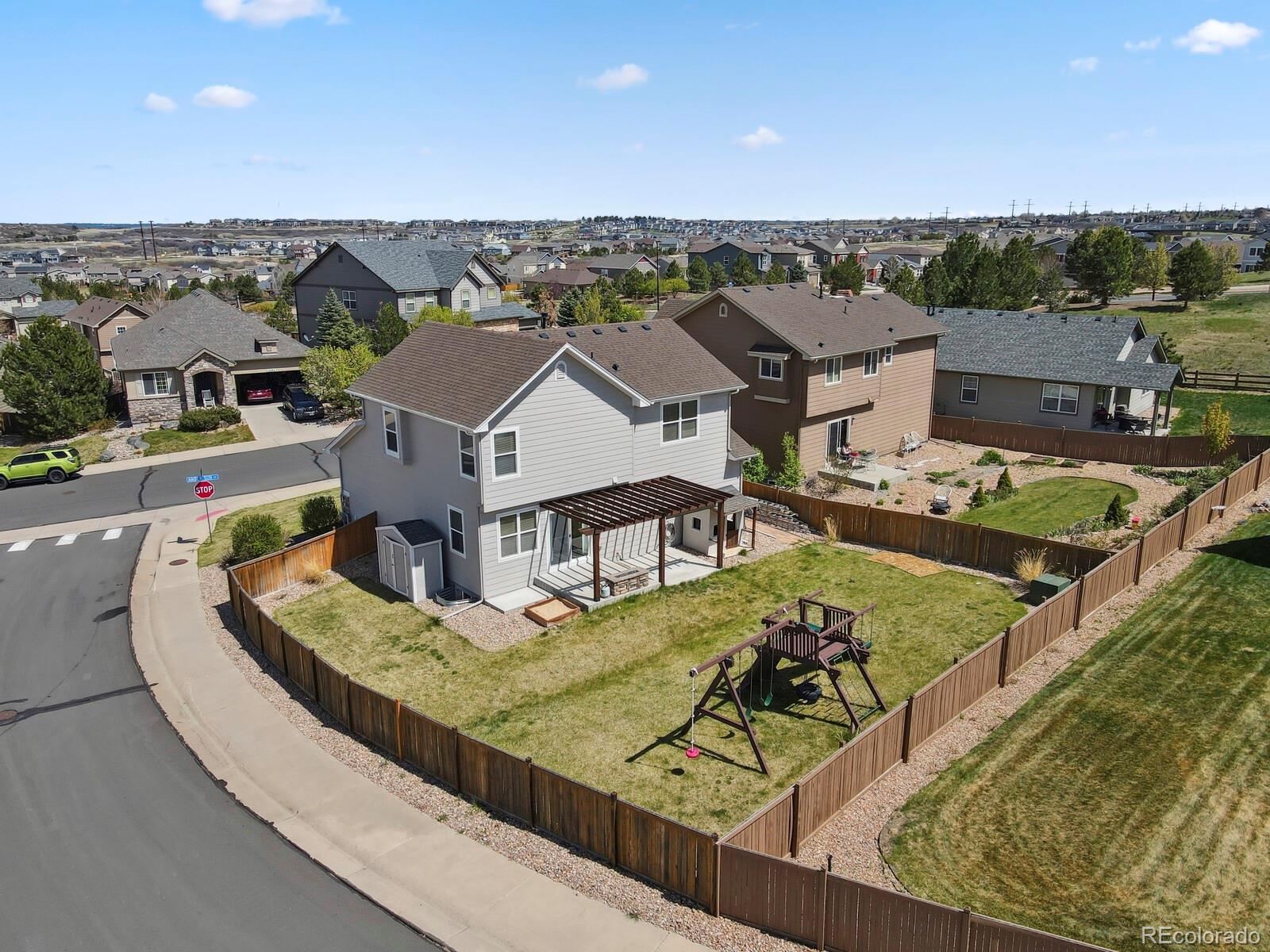 Move-In Ready Corner Lot Gem with Designer Touches and Spacious Layout! Step into this beautifully maintained and professionally staged home, perfectly situated on a fully fenced corner lot. The open-concept main level features soaring ceilings, rich wood flooring, granite countertops, and custom cabinetry—ideal for entertaining or relaxing in style. Upstairs, the spacious primary suite offers a luxurious retreat with a large walk-in closet and dual-sink vanity. Two additional bedrooms and a full bathroom complete the upper level, providing comfort and flexibility for family or guests. The lower level impresses with a generously sized den featuring built-ins and a wet bar—perfect for game nights or a cozy movie lounge. A fourth bedroom and full bath with a walk-in shower add even more versatility. The extra-deep two-car garage provides ample space for vehicles and storage. This turnkey home offers both style and functionality in a location near schools, shopping, parks and trails, all within easy access to I25.