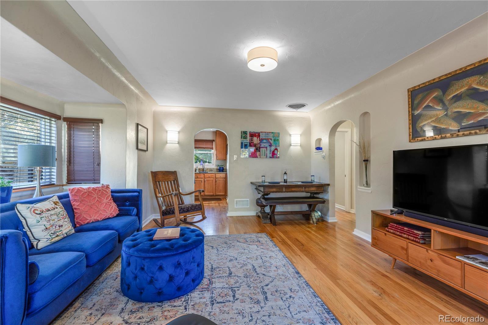 Across from City Park & City Park Golf Course, this bungalow blends classic character with modern charm in an ideal location. Elevated from the street, a xeriscaped yard features native grasses & year-round blooms leading to a private front porch. Walk through the contemporary entry door to arched doorways, cove ceilings, & hardwood floors. Sunlight fills the living room through large east & south-facing windows. The main level offers two bright bedrooms with generous closets & a full bathroom. The kitchen includes stainless steel appliances, granite tile counters, ample prep space, & abundant storage. From here, a few steps down lead to cozy basement. The lower level feels spacious with higher-than-typical ceilings & family room ideal for relaxing or entertaining. A wet bar with mini-fridge & under-stair storage adds convenience. The master suite has a walk-in shower, & dual-sink vanity. The utility room has a full-sized washer & dryer, water heater & new furnace. Step outside to a large private fenced backyard with a flagstone patio for entertaining alongside flower beds. Zoning allows for an ADU (buyers should verify specs with the City of Denver). The home could also function as two separate rental units with minor modifications. Parking is easy: a concrete driveway fits 2 cars and connects to the alley through a private gate. New Furnace (2025) and water heater.(2023) The attached single-car garage & outbuilding provide additional storage. This location offers easy access to City Park, the Denver Museum of Nature & Science, Gates Planetarium, & City Park Jazz in the summer. Enjoy stunning views of the skyline & mountains from the golf course clubhouse, with glimpses of both from the kitchen/backyard. Downtown, RiNo, LoDo are minutes away & I-70 offers connections to DIA & Colorado’s mountain resorts. This lovely home blends historic charm, thoughtful updates, & exceptional living in one of Denver’s most vibrant neighborhoods. https://youtu.be/lFEwuOEqZvU
