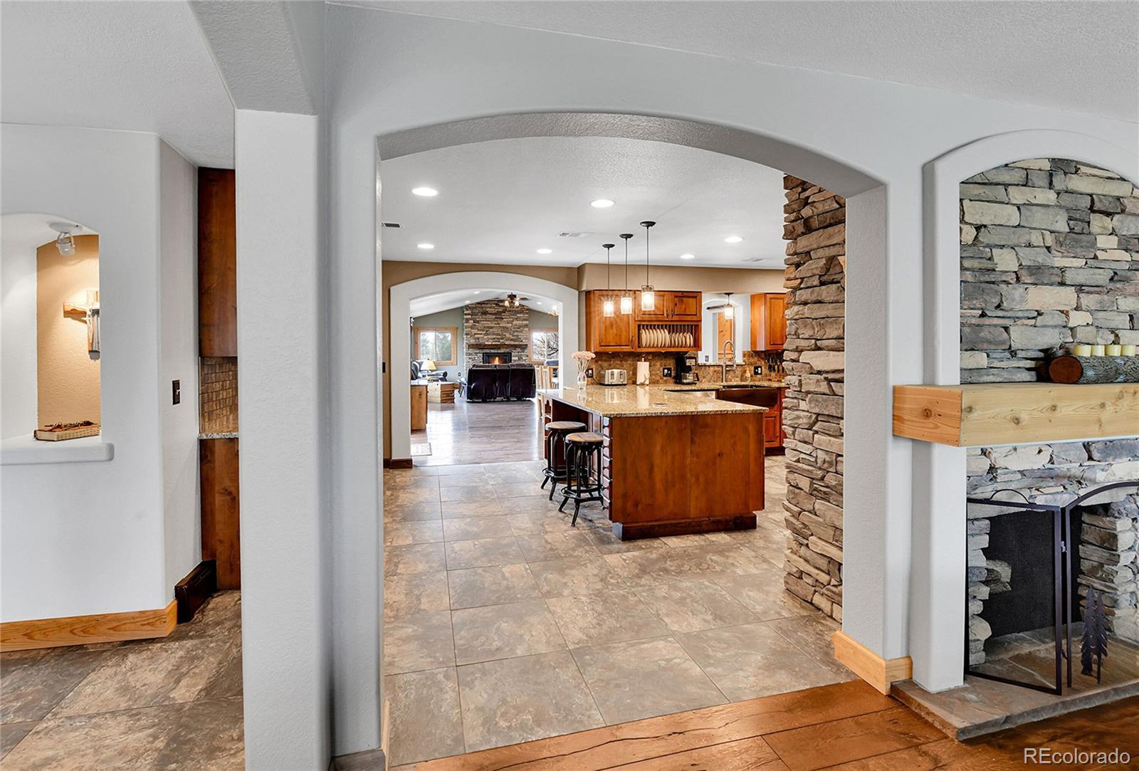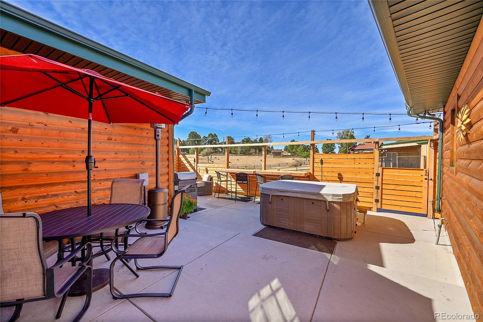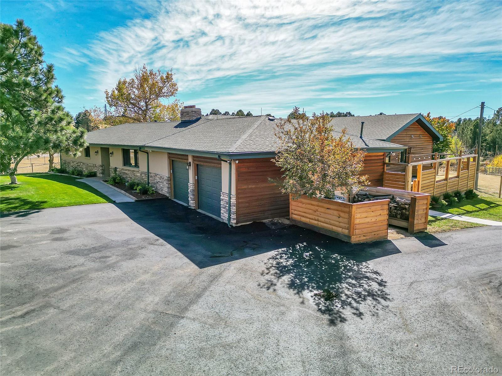Nestled among towering Ponderosa pines and just minutes from town, this stunning ranch home offers the perfect blend of convenience and tranquility. Enjoy breathtaking sunsets from your expansive deck & patios, this home is perfect for entertaining or simply soaking in the beauty of the Colorado landscape & is filled with natural light & designed for comfort, style & multi-generational living. This fantastic 4 bed (2 primaries + a 5th bedroom conversion, if desired) +office +bonus rooms +workout room, 5 bath home w/ full walkout basement has over 5k sqft of finished living, w/ 3419 on the main level. All sitting on nearly 3 acres of private gated, fully fenced residential estate land. The heart of the home is the expansive great room, boasting soaring vaulted ceilings, 2 walls of windows that flood the space with natural light, wide plank wood flooring & a beautiful gas log stone fireplace that serves as a warm & inviting centerpiece. The chef's kitchen does not disappoint w/ stainless steel appliances, knotty alder cabinets, pantry, breakfast bar. The large primary suite is a private retreat, featuring a spa-like bathroom w/ luxurious finishes. Enjoy your sun filled 996 sq ft of lower patio w/ glass roll-up garage door (just like your favorite breweries & patio seating) opening to the unfinished portion of the basement, awaiting your dream entertaining design & buildout. In 2018 a 1500+ sq ft addition was added & the entire home underwent an extensive remodel between 2017-2025. If quality materials & construction are important to you, this home will not disappoint. Incredible log & stone accents, stucco, wide plank wood flooring, large dimension custom tile, wood windows, barn doors, 3HVAC systems, knotty alder cabinets & doors, pine doors & trim, gorgeous, gourmet kitchen, copper sinks, spa like bathrooms, you name it... all high end finishes. 1860 sqft outbuilding. Minutes to downtown Parker and it's community events, 10 minutes to Southlands, 30 minutes to DIA!