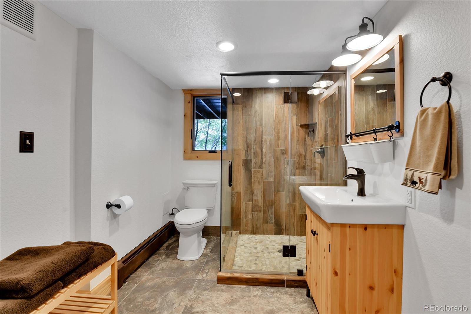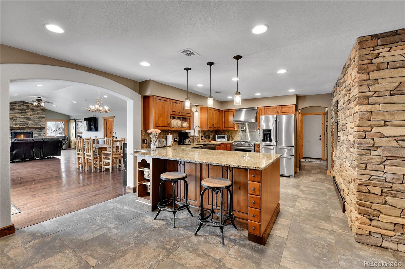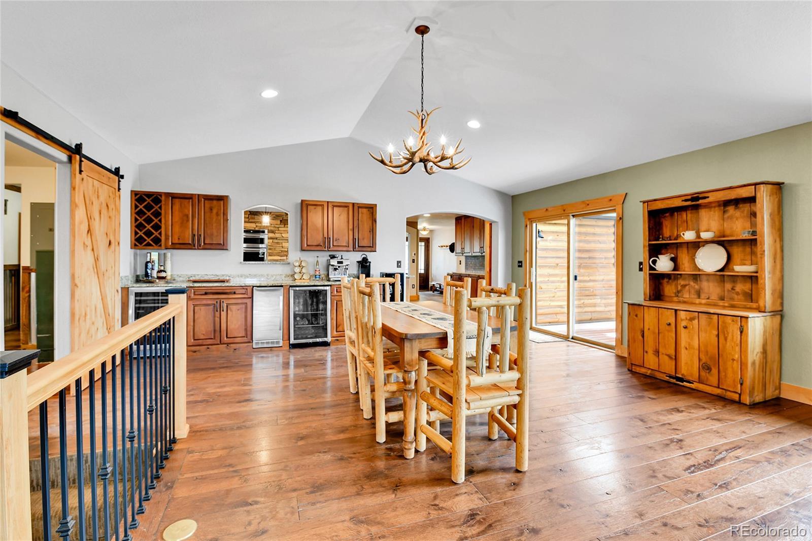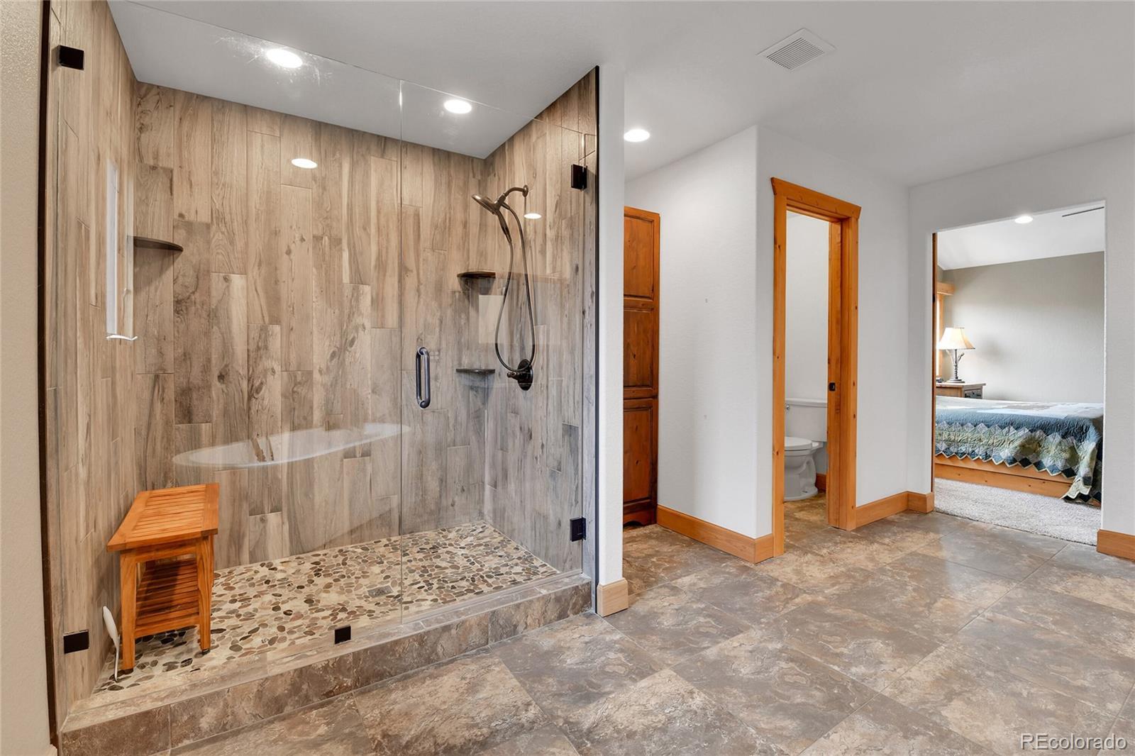Nestled among towering Ponderosa pines and just minutes from town, this stunning ranch home offers the perfect blend of convenience and tranquility. Enjoy breathtaking sunsets from your expansive deck & patios, this home is perfect for entertaining or simply soaking in the beauty of the Colorado landscape & is filled with natural light & designed for comfort, style & multi-generational living. This fantastic 4 bed (2 primaries + a 5th bedroom conversion, if desired) +office +bonus rooms +workout room, 5 bath home w/ full walkout basement has over 5k sqft of finished living, w/ 3419 on the main level. All sitting on nearly 3 acres of private gated, fully fenced residential estate land. The heart of the home is the expansive great room, boasting soaring vaulted ceilings, 2 walls of windows that flood the space with natural light, wide plank wood flooring & a beautiful gas log stone fireplace that serves as a warm & inviting centerpiece. The chef's kitchen does not disappoint w/ stainless steel appliances, knotty alder cabinets, pantry, breakfast bar. The large primary suite is a private retreat, featuring a spa-like bathroom w/ luxurious finishes. Enjoy your sun filled 996 sq ft of lower patio w/ glass roll-up garage door (just like your favorite breweries & patio seating) opening to the unfinished portion of the basement, awaiting your dream entertaining design & buildout. In 2018 a 1500+ sq ft addition was added & the entire home underwent an extensive remodel between 2017-2025. If quality materials & construction are important to you, this home will not disappoint. Incredible log & stone accents, stucco, wide plank wood flooring, large dimension custom tile, wood windows, barn doors, 3HVAC systems, knotty alder cabinets & doors, pine doors & trim, gorgeous, gourmet kitchen, copper sinks, spa like bathrooms, you name it... all high end finishes. 1860 sqft outbuilding. Minutes to downtown Parker and it's community events, 10 minutes to Southlands, 30 minutes to DIA!