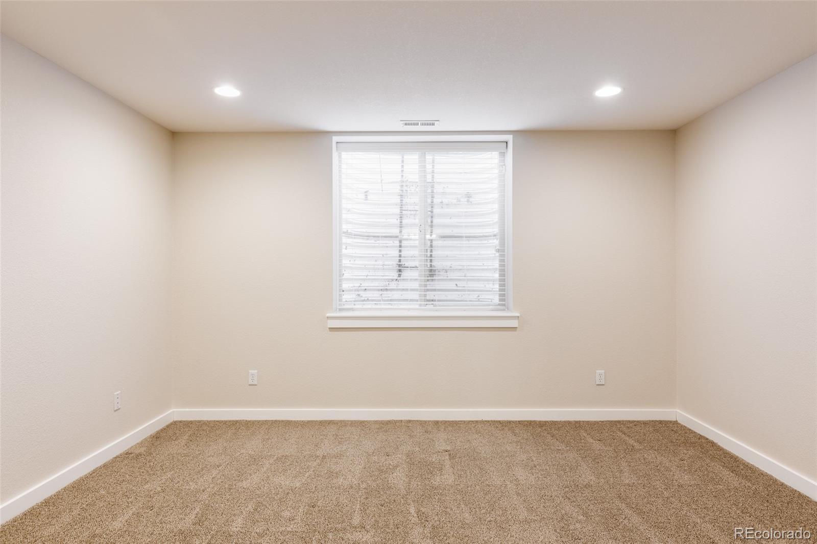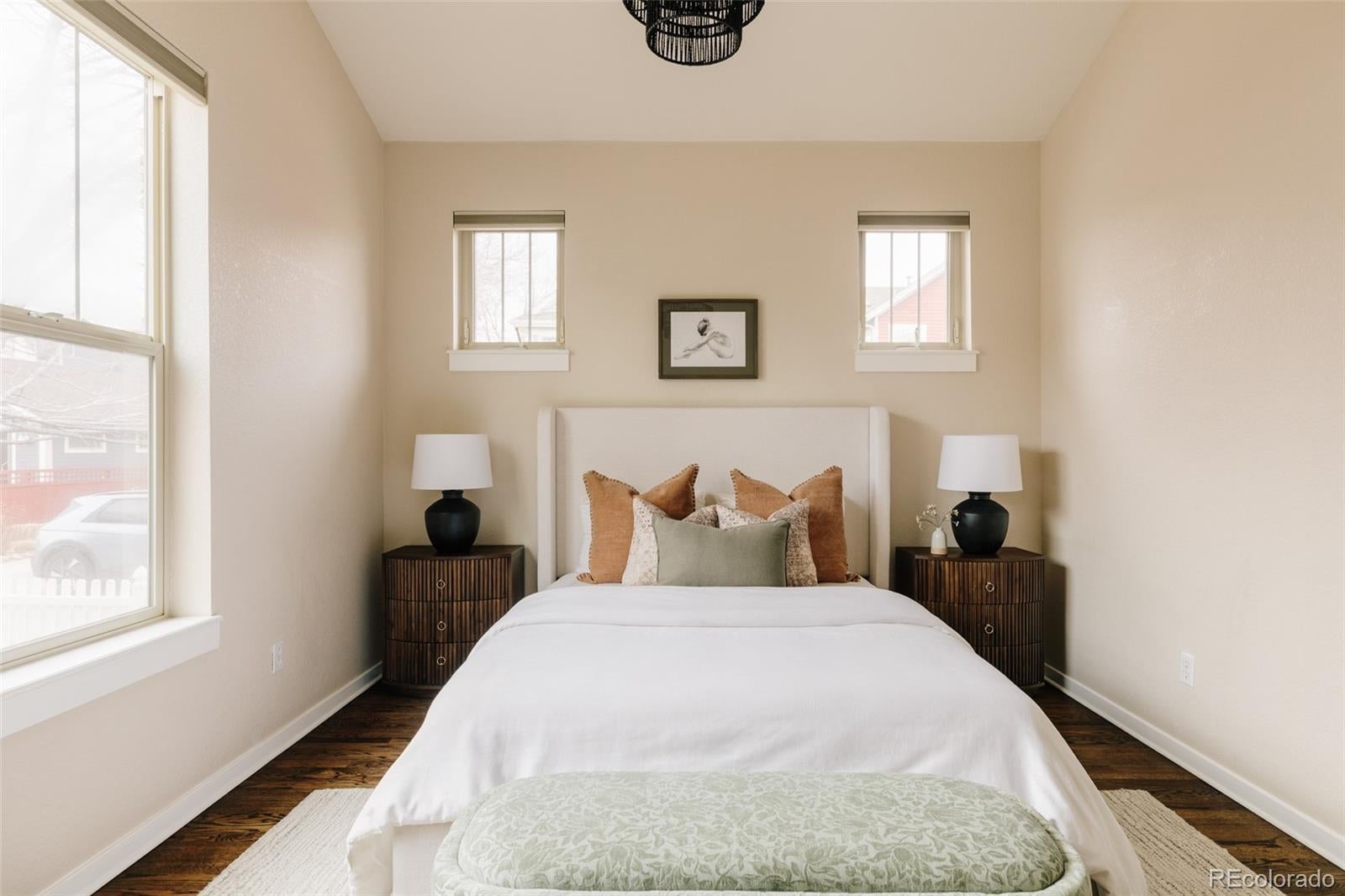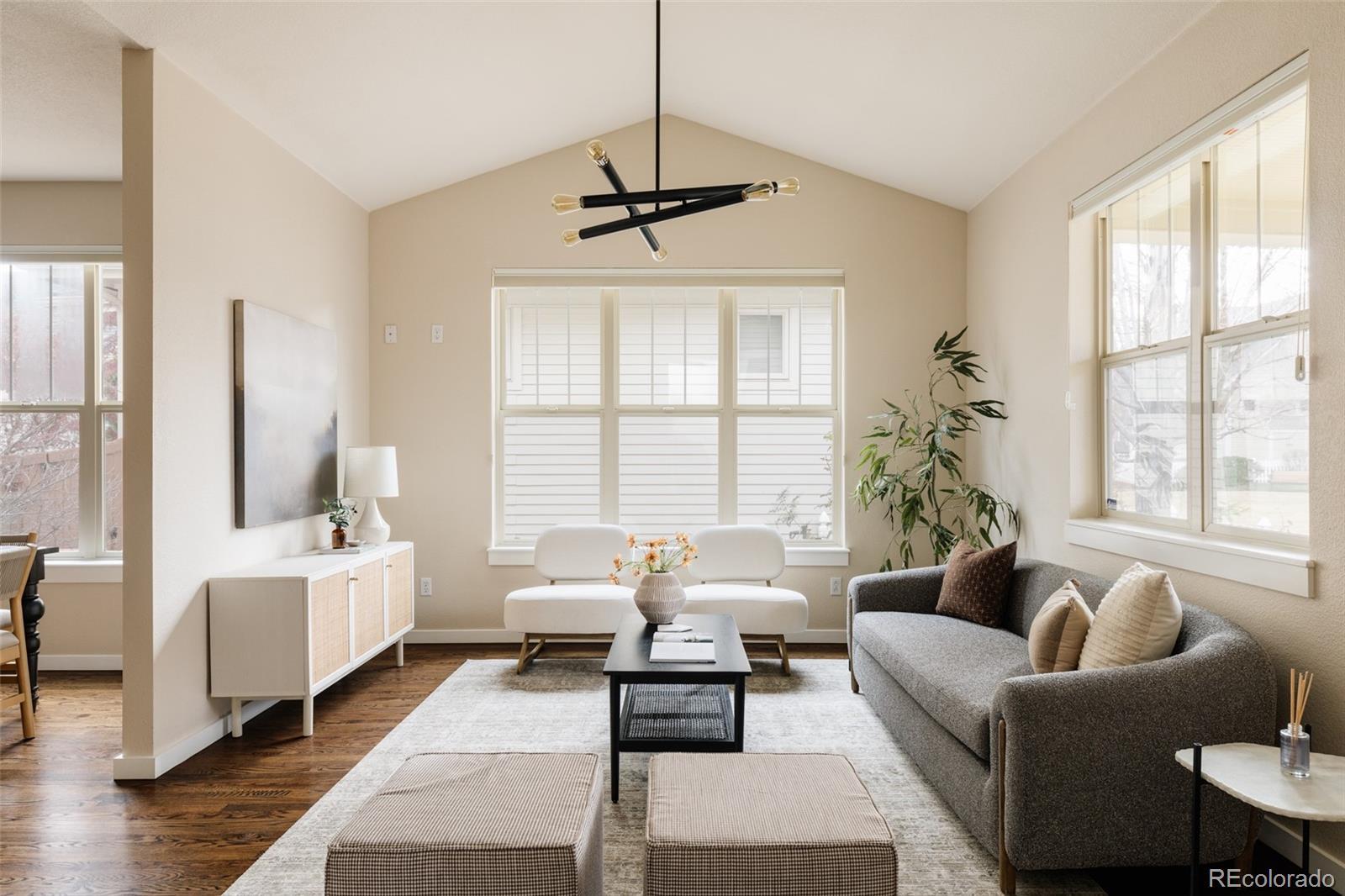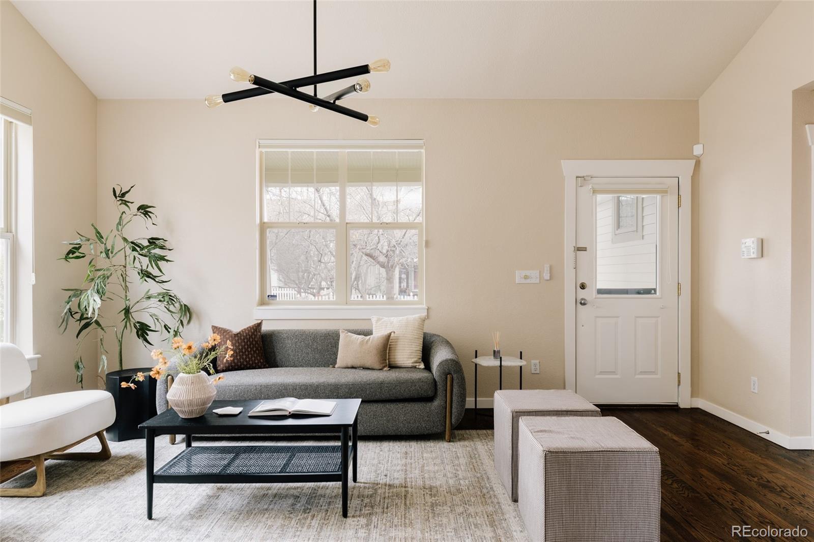 Welcome to this beautifully appointed Wonderland ranch, tucked into a secluded private courtyard and offering the rare convenience of a main-floor primary suite—all in the heart of Denver’s Central Park neighborhood, known for its walkability, parks, trails, and exceptional amenities. Step inside to find real hardwood floors anchoring the open-concept main living area. The beautifully updated kitchen is both stylish and functional, featuring crisp white shaker cabinetry, quartz countertops, a marble tile backsplash, stainless steel appliances including a gas range, a generous eat-in island with striking pendant lighting, and a spacious pantry to keep everything perfectly organized. The kitchen, dining, and living areas flow seamlessly together and are bathed in natural light, creating an inviting space ideal for entertaining and everyday living. Custom window treatments throughout add a polished finishing touch. The main-floor primary bedroom isa true retreat with vaulted ceilings, a large walk-in closet, and an updated en-suite bath showcasing a glass-encased shower, dual sinks, quartz counters, upgraded mirrors and lighting, and eye-catching decorative wallpaper. A convenient stackable washer and dryer is located within the primary suite for ultimate ease. Also on the main level is a second bedroom with direct access to the backyard, along with a well-appointed hall bathroom—perfect for guests or a home office setup. Downstairs, the finished basement expands your living space with a generous second living area, an additional bedroom and bathroom, and a dedicated laundry room—ideal for hosting guests, entertaining, or creating a flexible space to fit your lifestyle. All this just steps from Aviator Pool via a convenient neighborhood shortcut located directly north of the front porch. Also enjoy close proximity to Central Park Rec Center, 29th Avenue Town Center, Eastbridge Town Center, the A-Line Light Rail, Stanley Marketplace, & The Shops at Northfield.