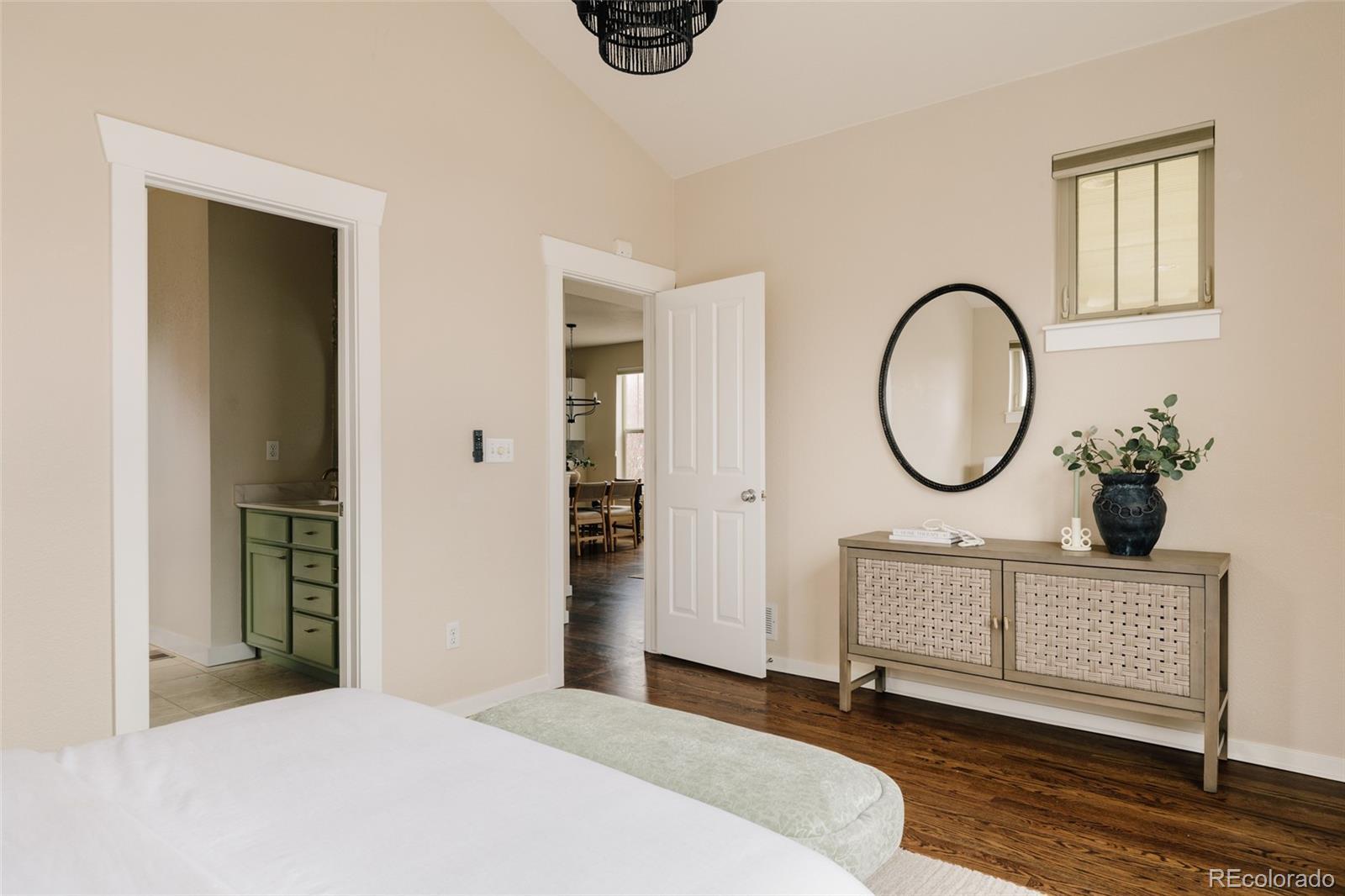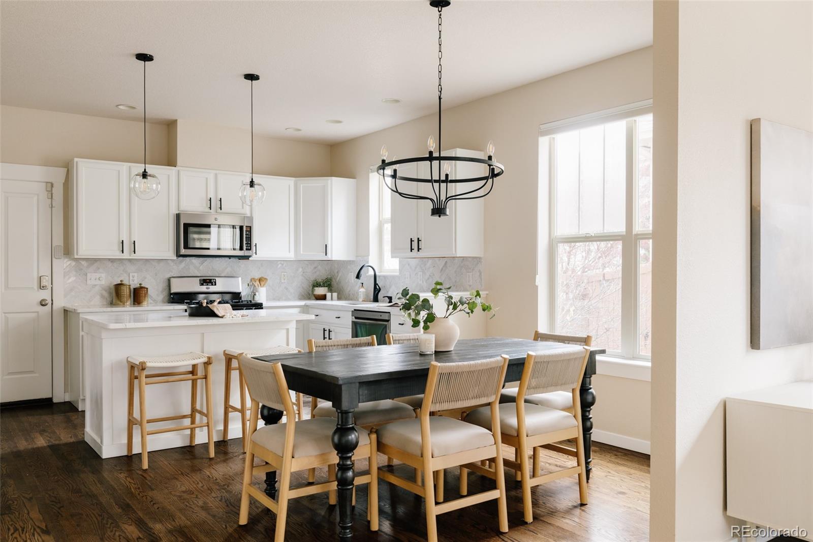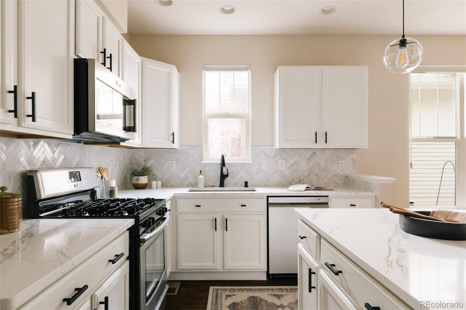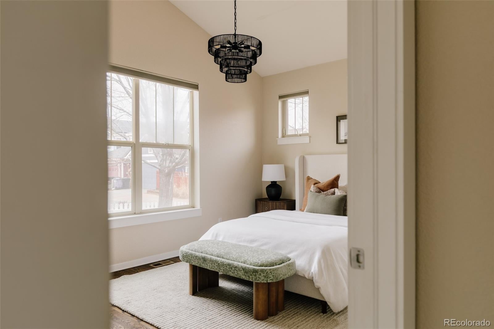 Welcome to this beautifully appointed Wonderland ranch, tucked into a secluded private courtyard and offering the rare convenience of a main-floor primary suite—all in the heart of Denver’s Central Park neighborhood, known for its walkability, parks, trails, and exceptional amenities. Step inside to find real hardwood floors anchoring the open-concept main living area. The beautifully updated kitchen is both stylish and functional, featuring crisp white shaker cabinetry, quartz countertops, a marble tile backsplash, stainless steel appliances including a gas range, a generous eat-in island with striking pendant lighting, and a spacious pantry to keep everything perfectly organized. The kitchen, dining, and living areas flow seamlessly together and are bathed in natural light, creating an inviting space ideal for entertaining and everyday living. Custom window treatments throughout add a polished finishing touch. The main-floor primary bedroom isa true retreat with vaulted ceilings, a large walk-in closet, and an updated en-suite bath showcasing a glass-encased shower, dual sinks, quartz counters, upgraded mirrors and lighting, and eye-catching decorative wallpaper. A convenient stackable washer and dryer is located within the primary suite for ultimate ease. Also on the main level is a second bedroom with direct access to the backyard, along with a well-appointed hall bathroom—perfect for guests or a home office setup. Downstairs, the finished basement expands your living space with a generous second living area, an additional bedroom and bathroom, and a dedicated laundry room—ideal for hosting guests, entertaining, or creating a flexible space to fit your lifestyle. All this just steps from Aviator Pool via a convenient neighborhood shortcut located directly north of the front porch. Also enjoy close proximity to Central Park Rec Center, 29th Avenue Town Center, Eastbridge Town Center, the A-Line Light Rail, Stanley Marketplace, & The Shops at Northfield.