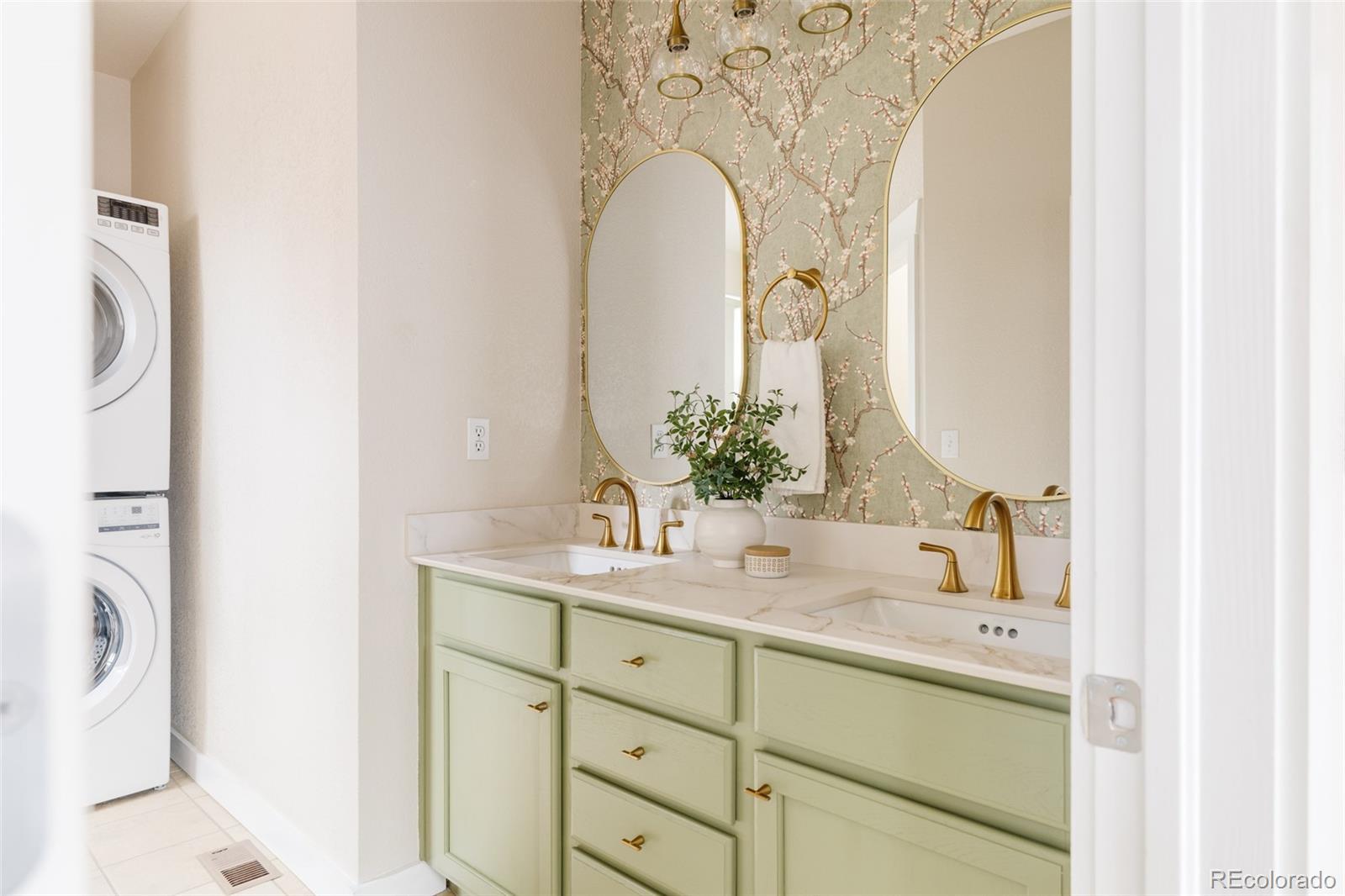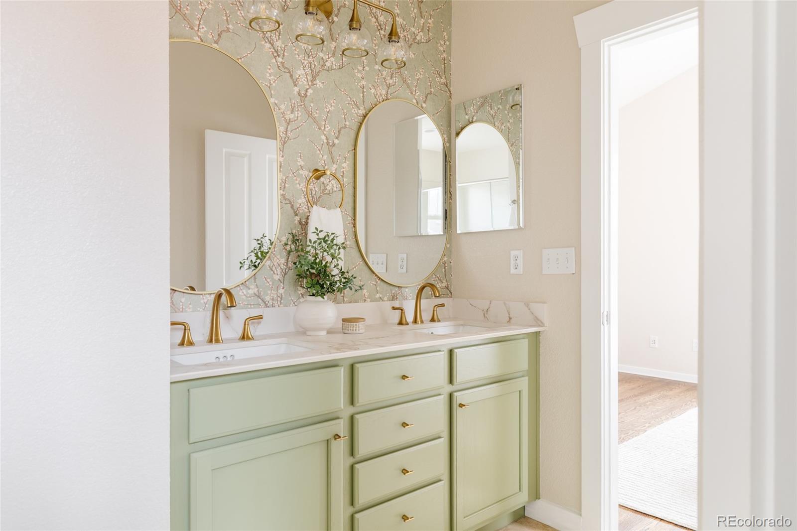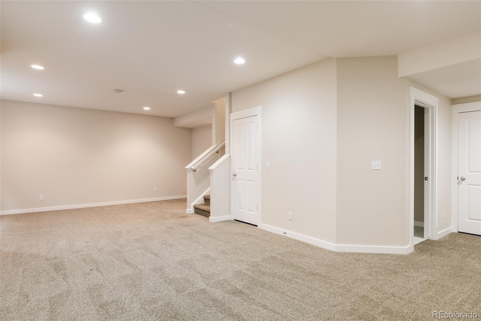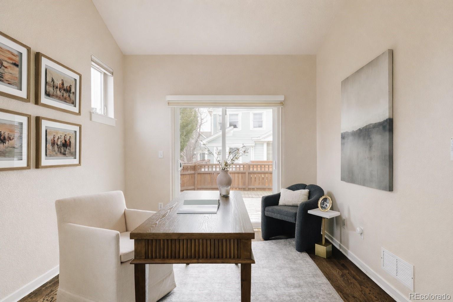 Welcome to this beautifully appointed Wonderland ranch, tucked into a secluded private courtyard and offering the rare convenience of a main-floor primary suite—all in the heart of Denver’s Central Park neighborhood, known for its walkability, parks, trails, and exceptional amenities. Step inside to find real hardwood floors anchoring the open-concept main living area. The beautifully updated kitchen is both stylish and functional, featuring crisp white shaker cabinetry, quartz countertops, a marble tile backsplash, stainless steel appliances including a gas range, a generous eat-in island with striking pendant lighting, and a spacious pantry to keep everything perfectly organized. The kitchen, dining, and living areas flow seamlessly together and are bathed in natural light, creating an inviting space ideal for entertaining and everyday living. Custom window treatments throughout add a polished finishing touch. The main-floor primary bedroom isa true retreat with vaulted ceilings, a large walk-in closet, and an updated en-suite bath showcasing a glass-encased shower, dual sinks, quartz counters, upgraded mirrors and lighting, and eye-catching decorative wallpaper. A convenient stackable washer and dryer is located within the primary suite for ultimate ease. Also on the main level is a second bedroom with direct access to the backyard, along with a well-appointed hall bathroom—perfect for guests or a home office setup. Downstairs, the finished basement expands your living space with a generous second living area, an additional bedroom and bathroom, and a dedicated laundry room—ideal for hosting guests, entertaining, or creating a flexible space to fit your lifestyle. All this just steps from Aviator Pool via a convenient neighborhood shortcut located directly north of the front porch. Also enjoy close proximity to Central Park Rec Center, 29th Avenue Town Center, Eastbridge Town Center, the A-Line Light Rail, Stanley Marketplace, & The Shops at Northfield.