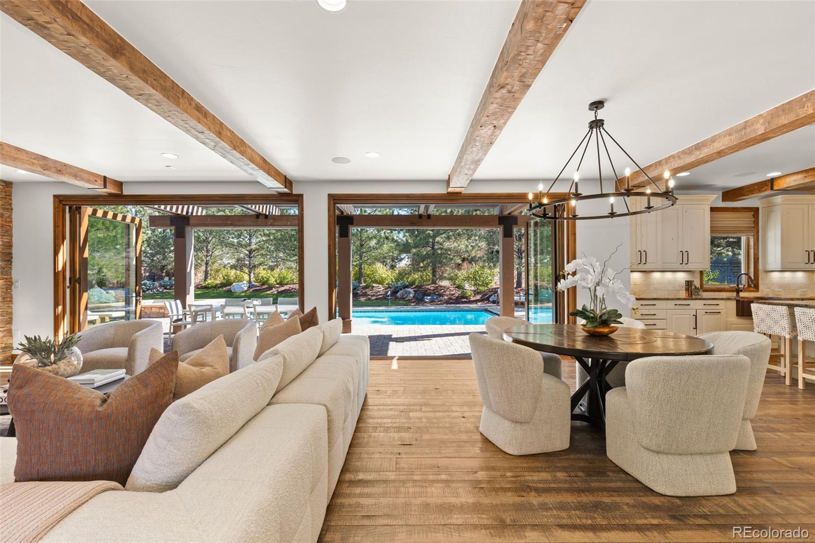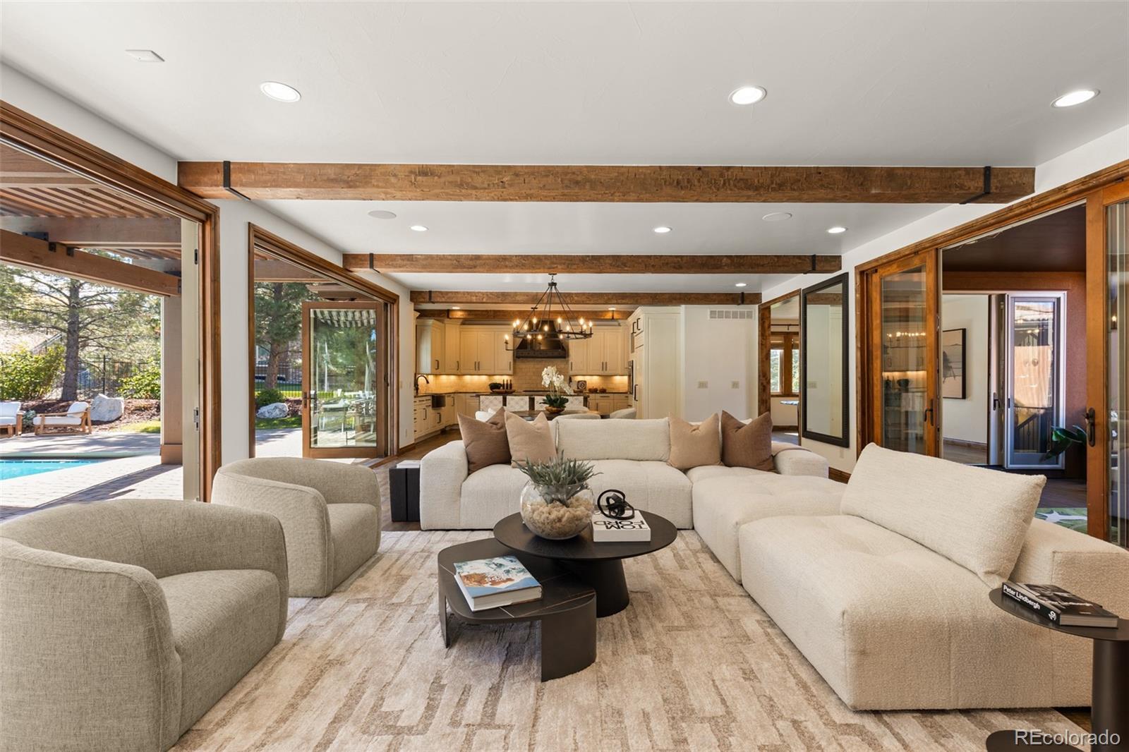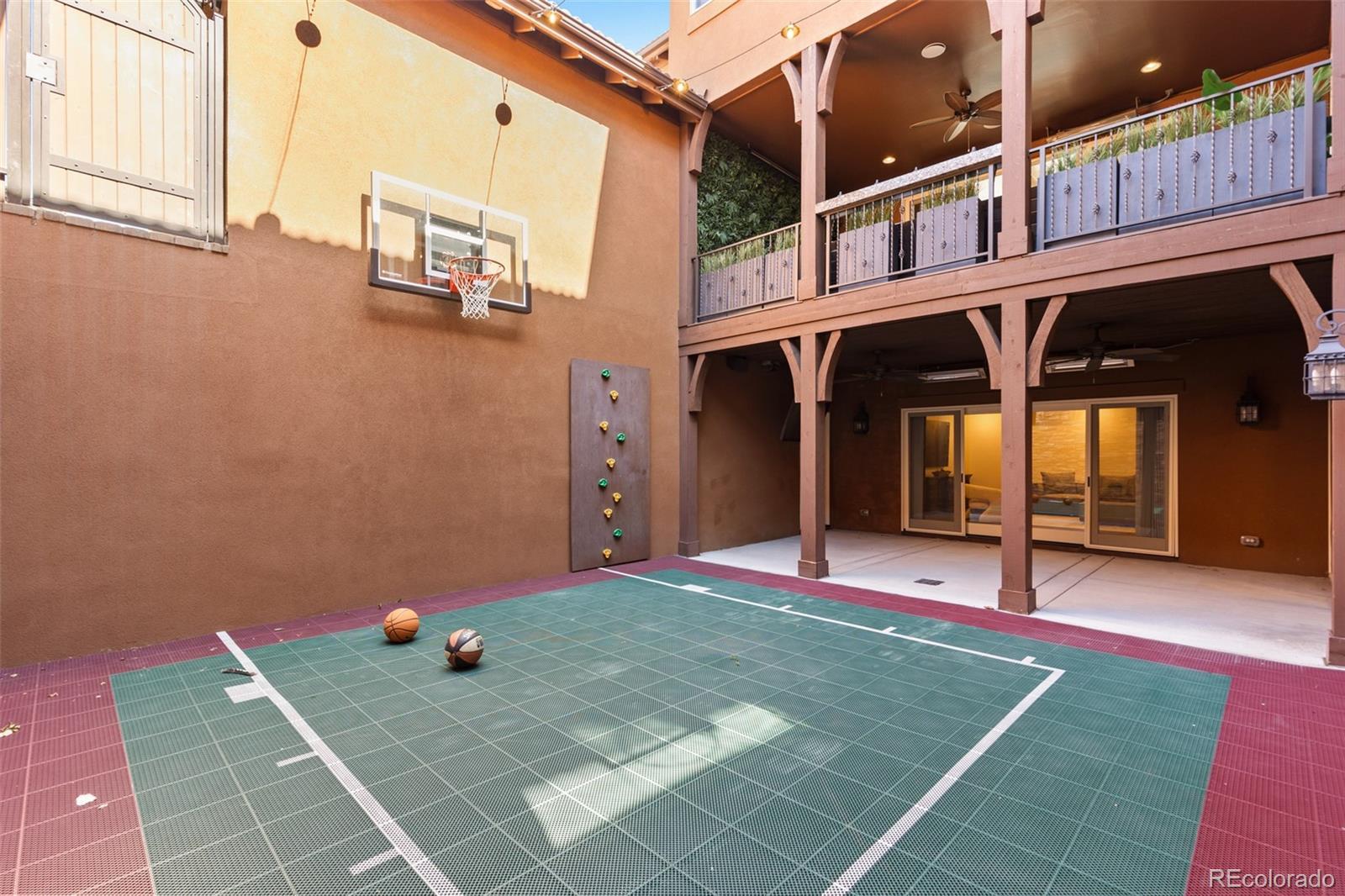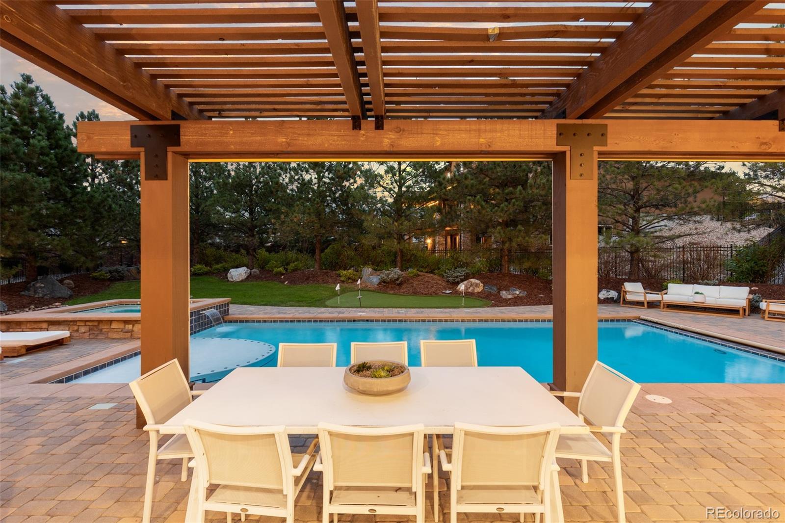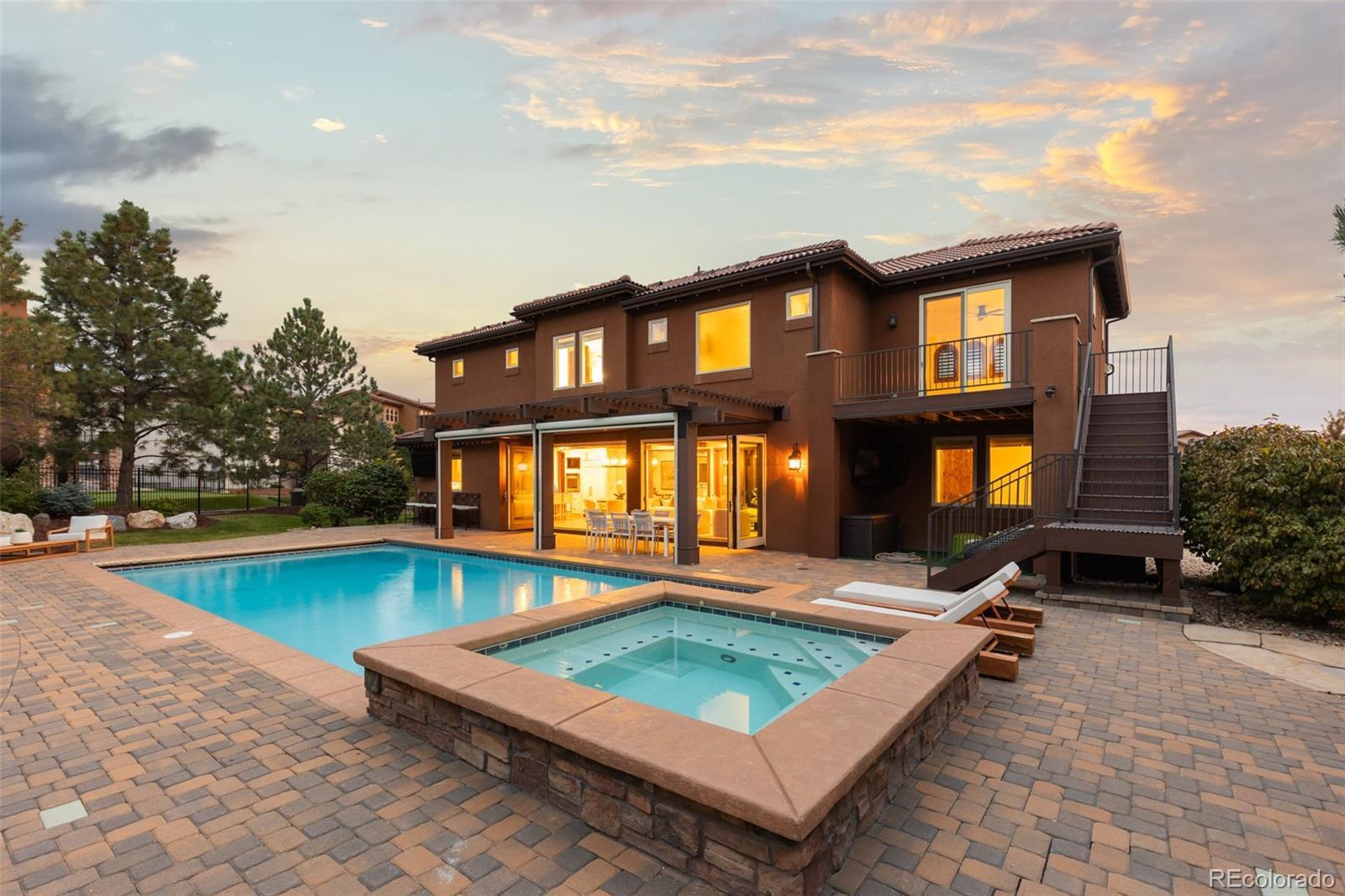 Nestled on a private cul-de-sac in the coveted gated community of Heritage Hills, 9316 Vista Hill Way is a masterfully crafted 5-bedroom, 7-bathroom residence built by Celebrity Homes in 2017. Designed for seamless indoor-outdoor living with a $200,000 renovation including the addition of dual Nano doors, pergola with privacy shades, Stone accent wall and linear fireplace and kitchen updates. Also featured is an expansive covered outdoor lounge with built-in heaters and a projector screen—ideal for evening movies under the stars. Inside, custom hardwood floors, knotty alder doors, black iron accents and fresh new paint create a warm, refined ambiance. The gourmet kitchen boasts Sub-Zero and Wolf appliances, a spacious walk-in pantry, and opens to a large great room leading to a backyard oasis—complete with a pool/electric pool cover, hot tub, putting green, and al fresco dining. The luxurious primary suite offers a private sitting area with beverage center, dual custom walk-in closets, oversized copper tub, heated floors and direct access to the pool and spa from a private balcony. Two additional en-suite bedrooms are located upstairs along with a convenient second-floor laundry, and media room, while a guest en-suite resides on the main level. Additional highlights include a custom 1500 bottle wine room, 4 Car garage with epoxy floors and built-in cabinetry, and a large basement featuring a river rock bar with raw-edge granite, beverage center, dishwasher, refrigerator, and ice maker and a spectacular mirrored home gym, and ample space for indoor/outdoor entertaining. Additionally, the interior courtyard has been thoughtfully transformed into a private basketball court, a perfect complement to the expansive lower level for a sports lovers dream! Located minutes from I-25, C-470, and the Denver Tech Center, and close to restaurants, shopping, trails, tennis courts, and community amenities—this home is the perfect blend of luxury, comfort, and lifestyle!!