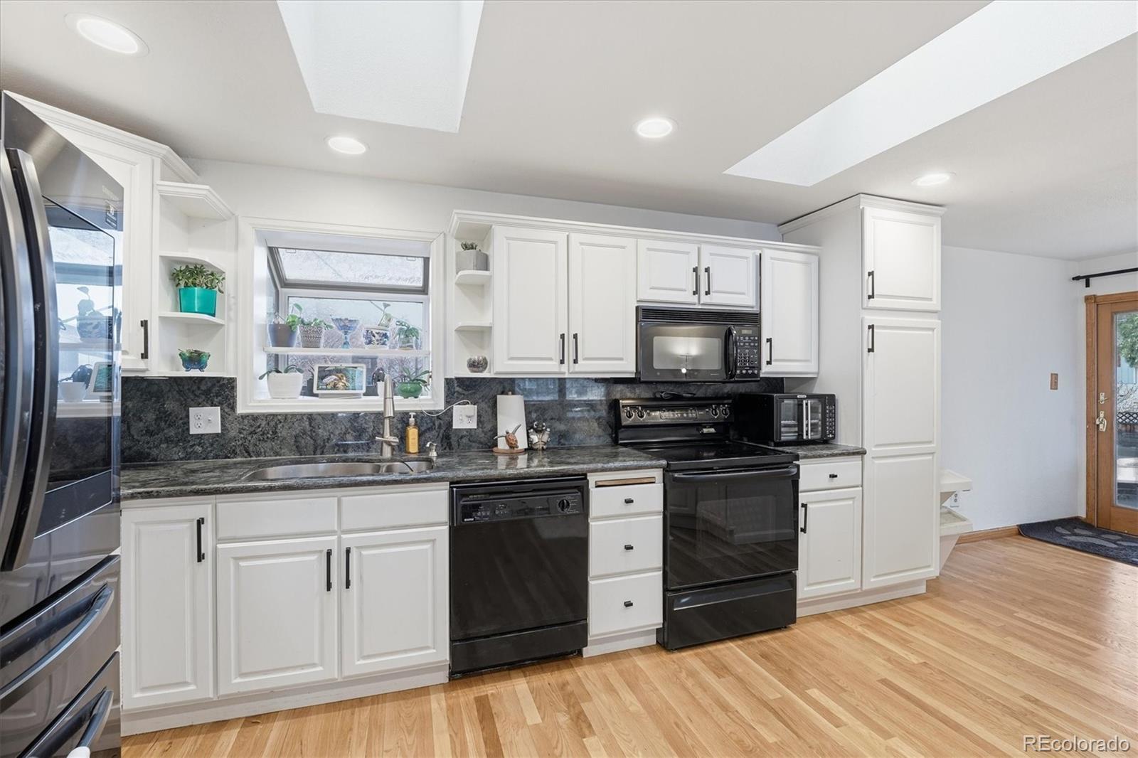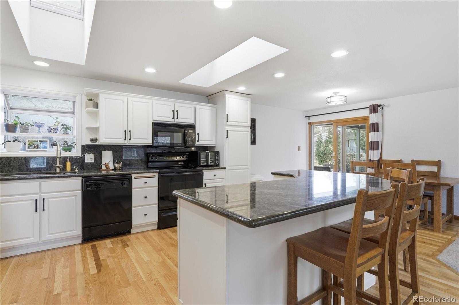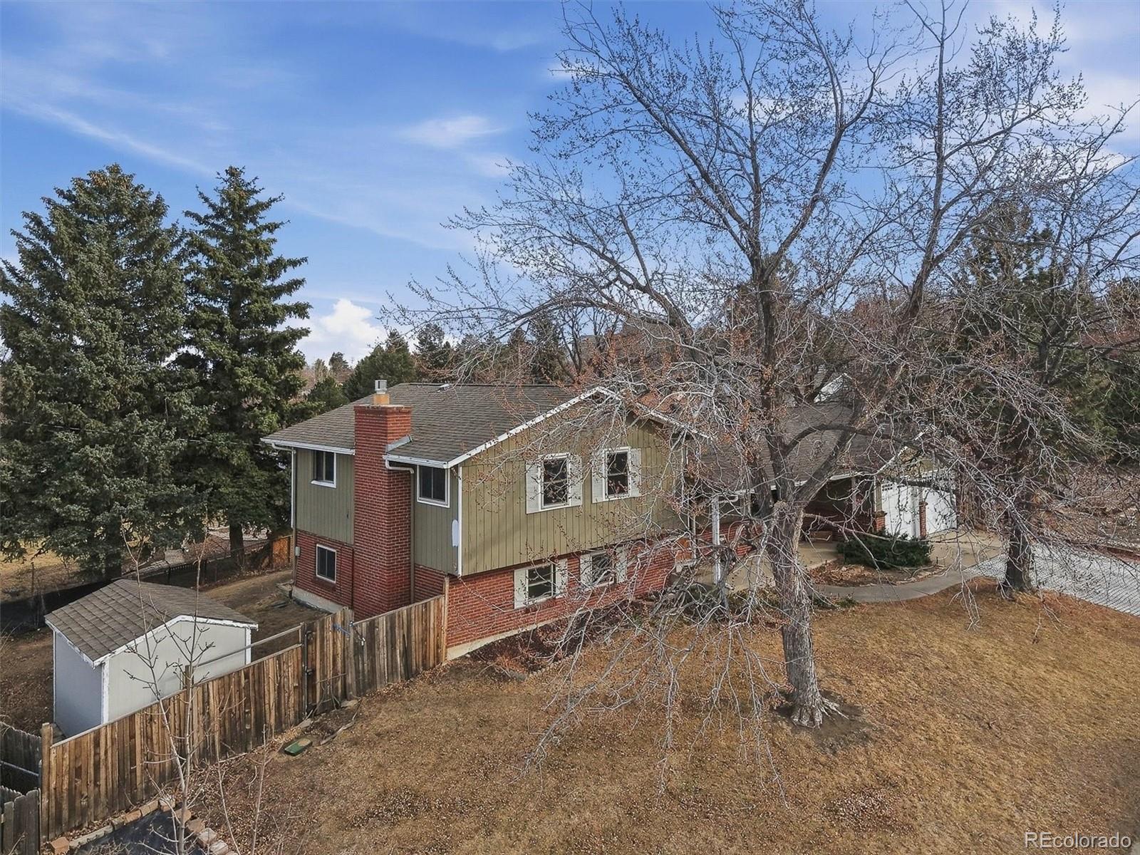 Beautiful tri-level home with a finished basement, ideally situated on a desirable corner lot just two blocks from the hiking and biking trails of Green Mountain. Fresh exterior paint and a welcoming covered front porch create inviting curb appeal. The main level features hardwood flooring throughout the entry, kitchen, and dining nook, with an open-concept living room and kitchen designed for comfortable everyday living and effortless entertaining. Skylights fill the space with natural light, highlighting the granite countertops, center island, ample cabinetry, and included appliances. A sliding glass door leads to the fully fenced backyard, complete with a large patio, covered patio area, and storage shed—perfect for outdoor gatherings and year-round enjoyment. The lower level offers hardwood flooring, a spacious family room with a gas fireplace and custom built-ins, a versatile bedroom ideal for guests or a home office, and an updated three-quarter bath with tile flooring. Upstairs, hardwood flooring continues throughout. The primary suite offers a private three-quarter bath and a built-in closet organizer, while the two additional bedrooms also include built-in closet organizers for enhanced storage and functionality. An updated full bath with skylight and tile flooring serves the upper level. The laundry area is conveniently located in the finished basement. An attached two-car garage provides everyday ease and practicality. Thoughtfully maintained and move-in ready, this home combines functional living spaces with an exceptional location close to outdoor recreation.